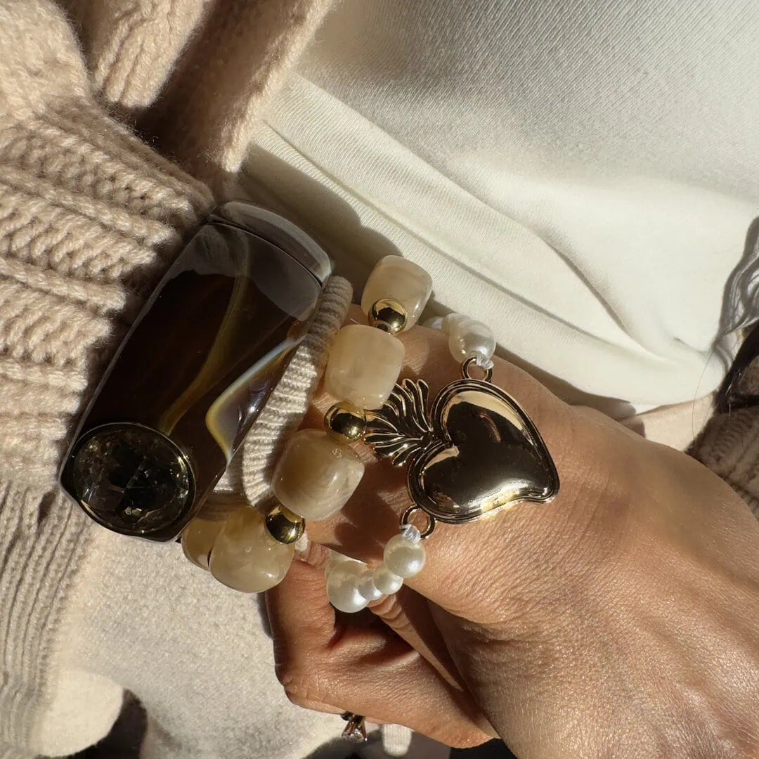 Realizzato con l’iconico connettore Cuore Sacro centrale, il bracciale riprende lo stesso gioco magnetico di perle di varie dimensioni, (presente anche nel girocollo abbinato) creando un equilibrio perfetto tra eleganza classica e spirito audace. È il gioiello che si nota ad ogni gesto, un amuleto da portare sempre con sé.