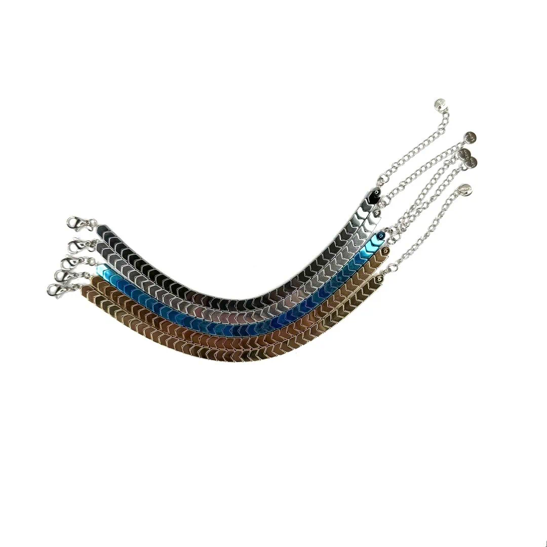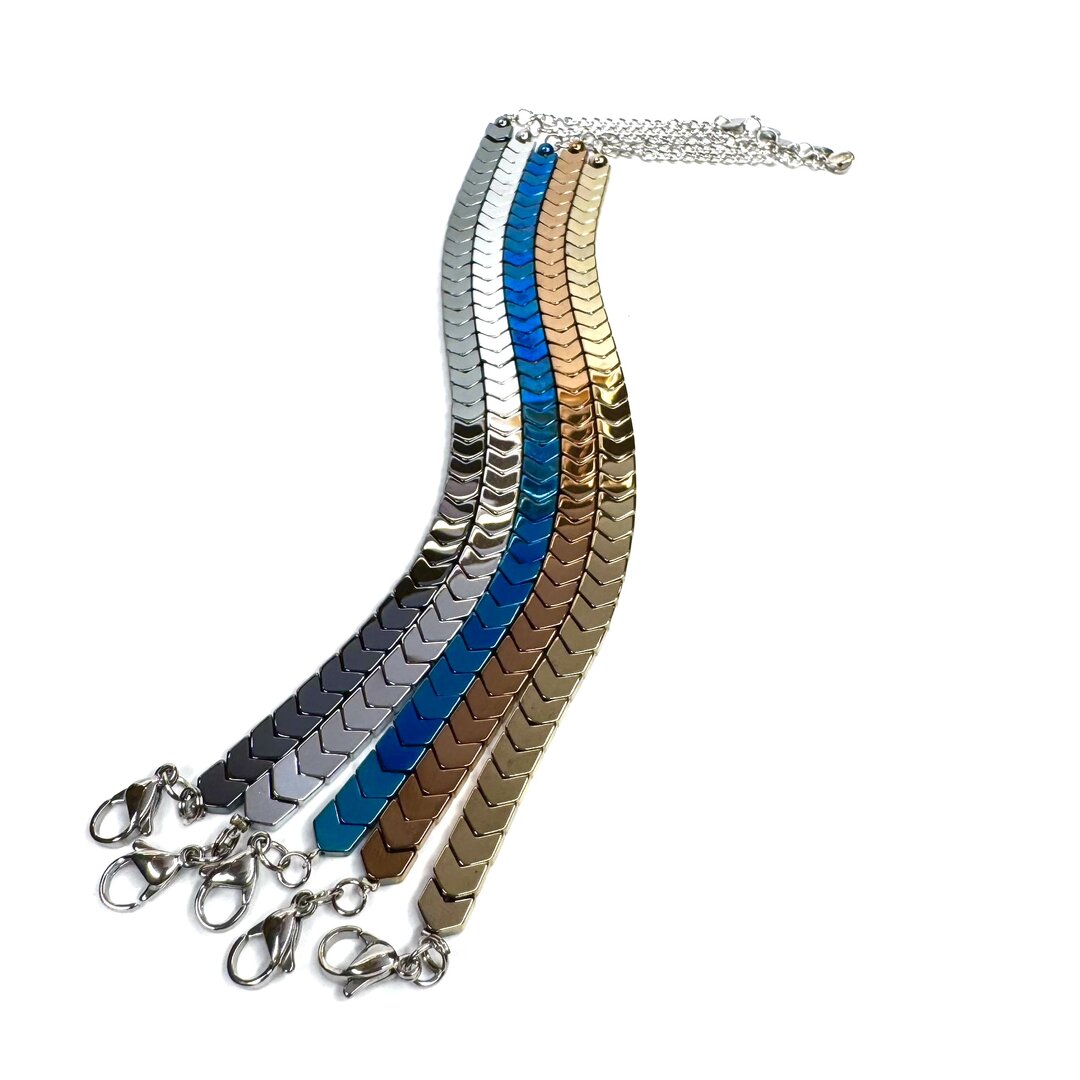 Bracciale ematite in vari colori con chiusura regolabile tramite moschettone in acciaio.