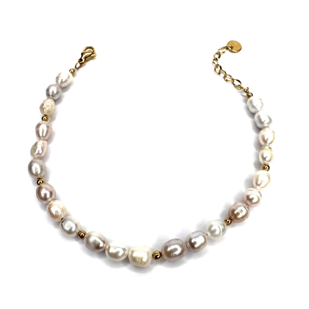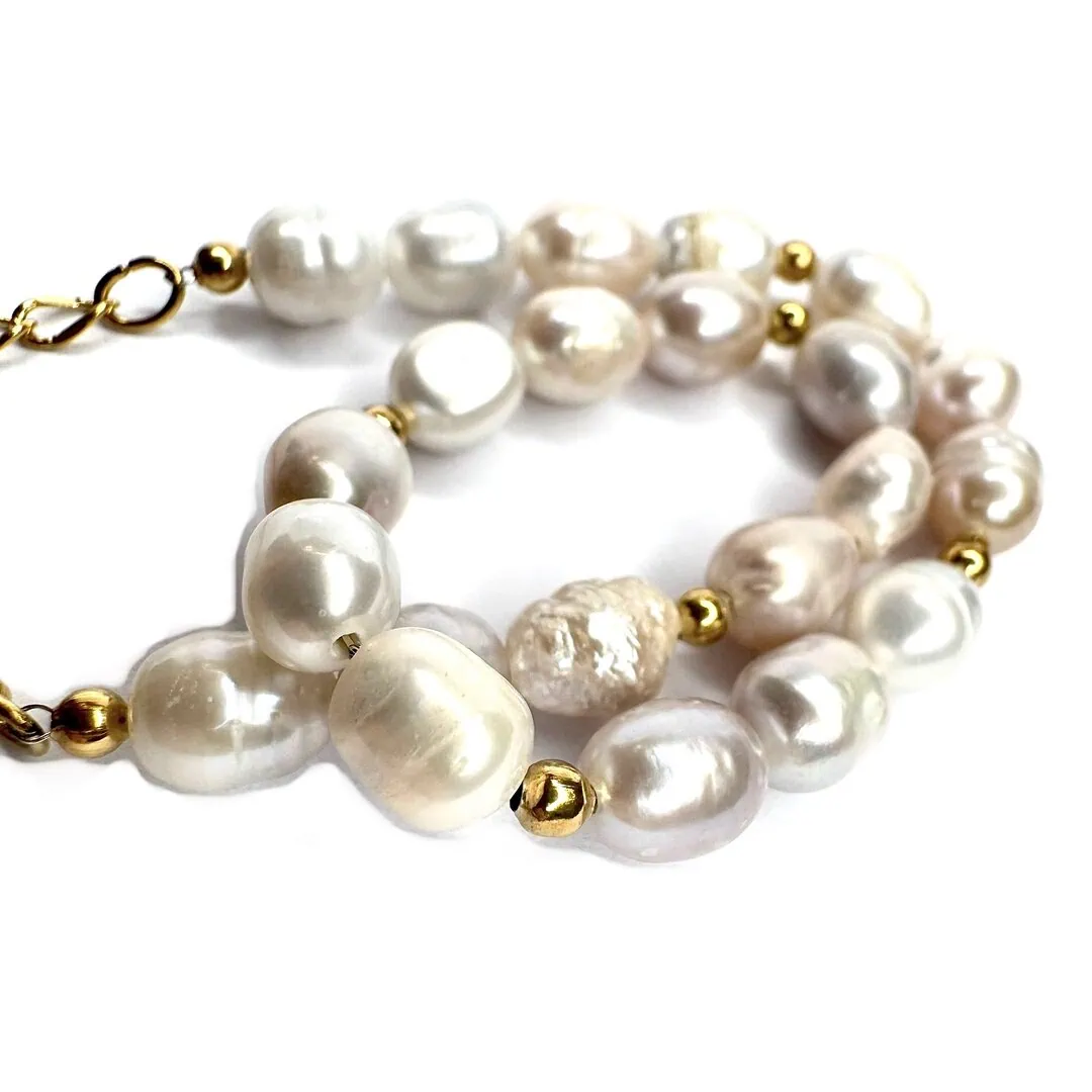 Bracciale perle Afrodite, realizzato con perle coltivate di forma irregolare intervallate da micro sfere, infilato a mano.