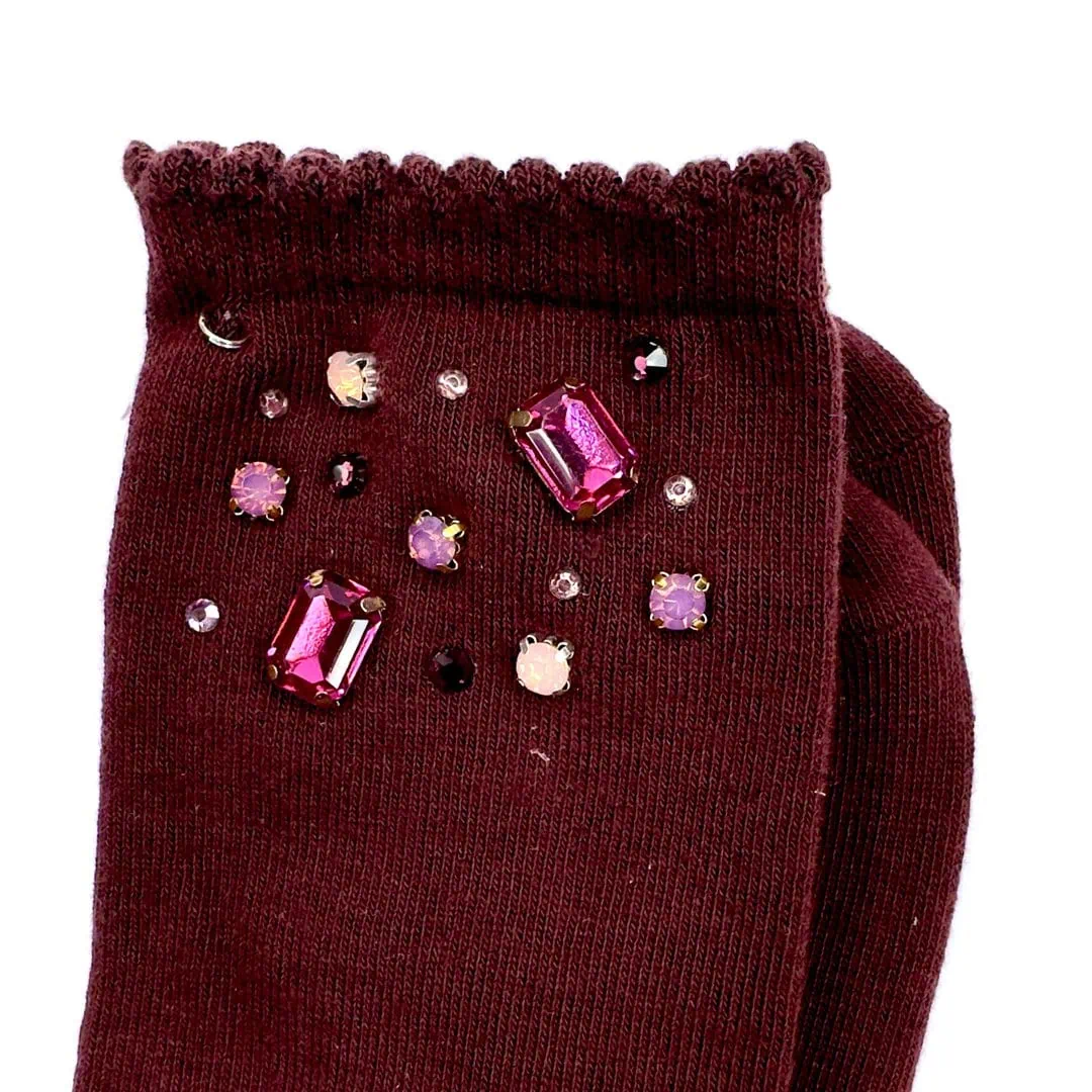 Calze Bordeaux pietre con applicazioni realizzate interamente a mano con perle, pietre e strass.