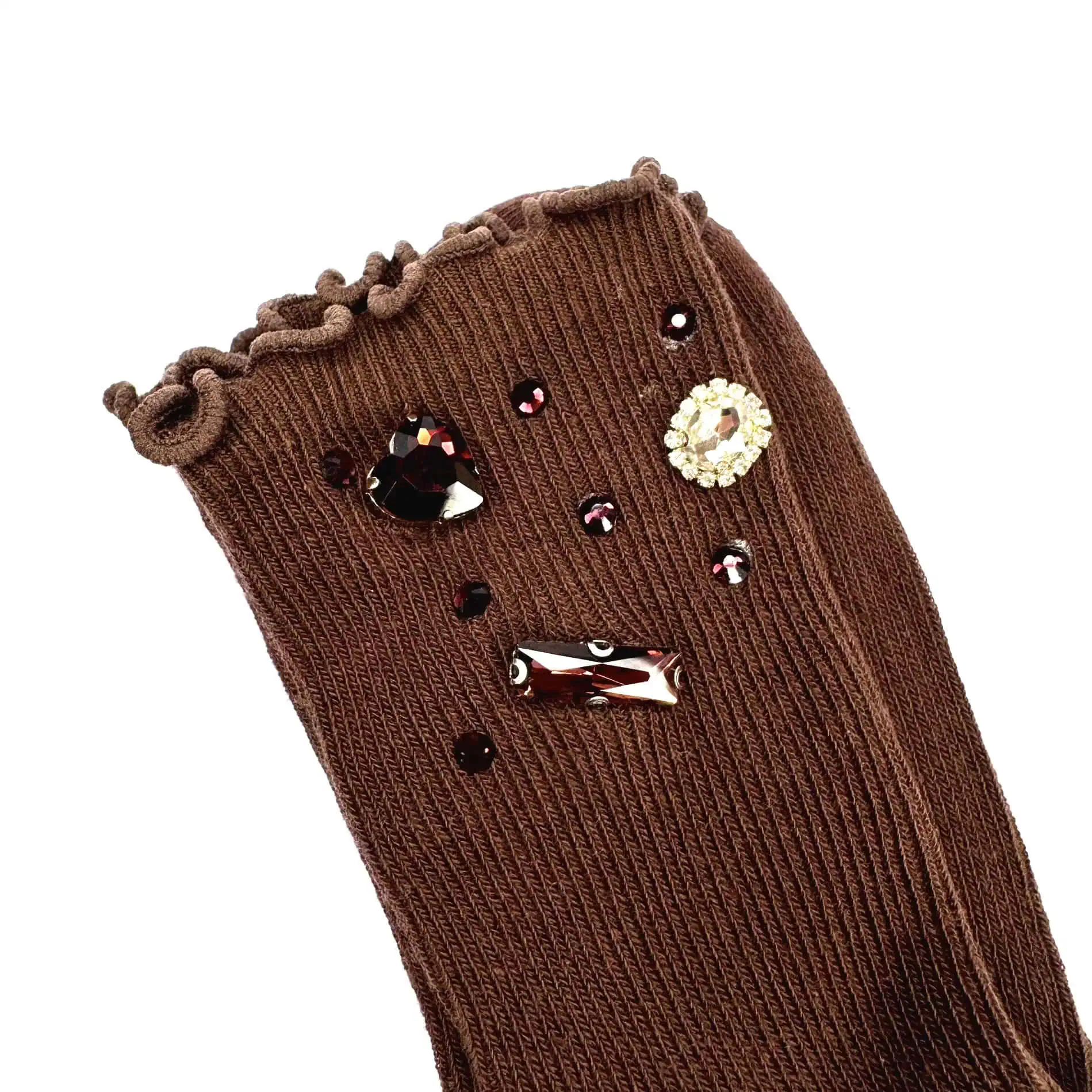 Calze donna particolari in diversi colori con bordatura a rouches che nn stringe con applicazioni di pietre, perle e strass interamente realizzate a mano, in tono ognuno è un piccolo pezzo unico.
