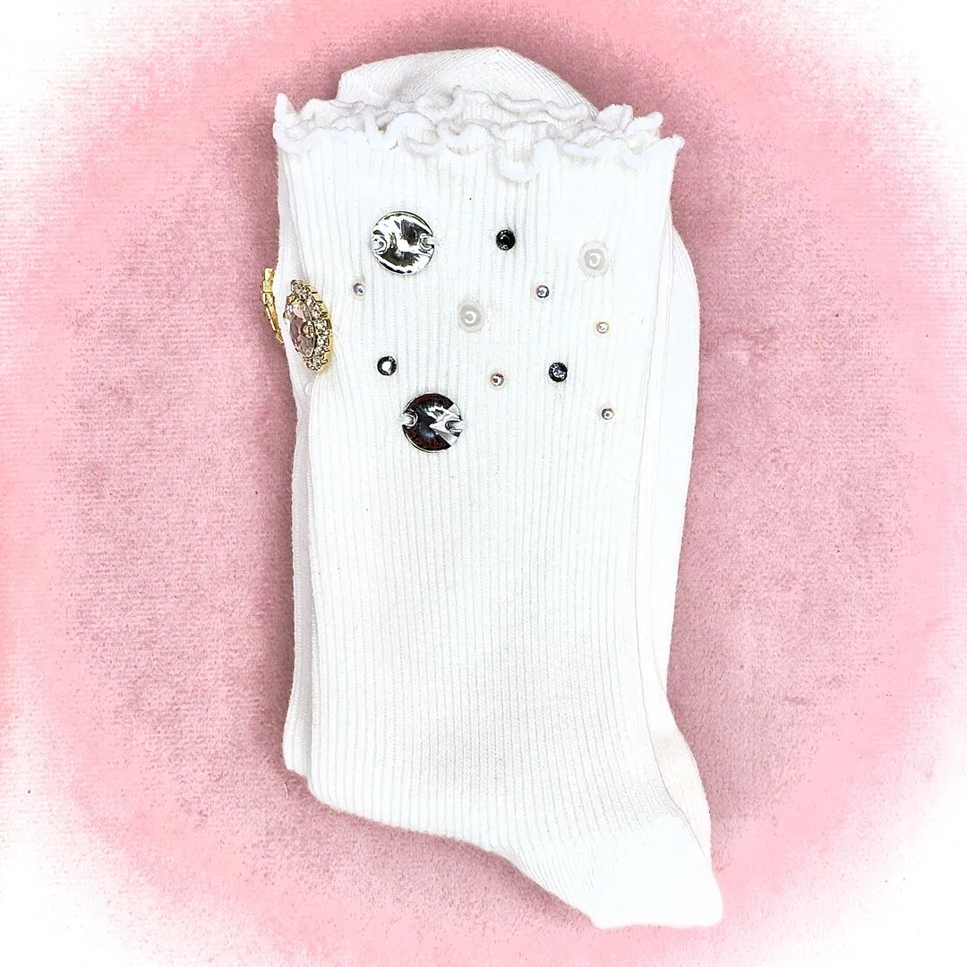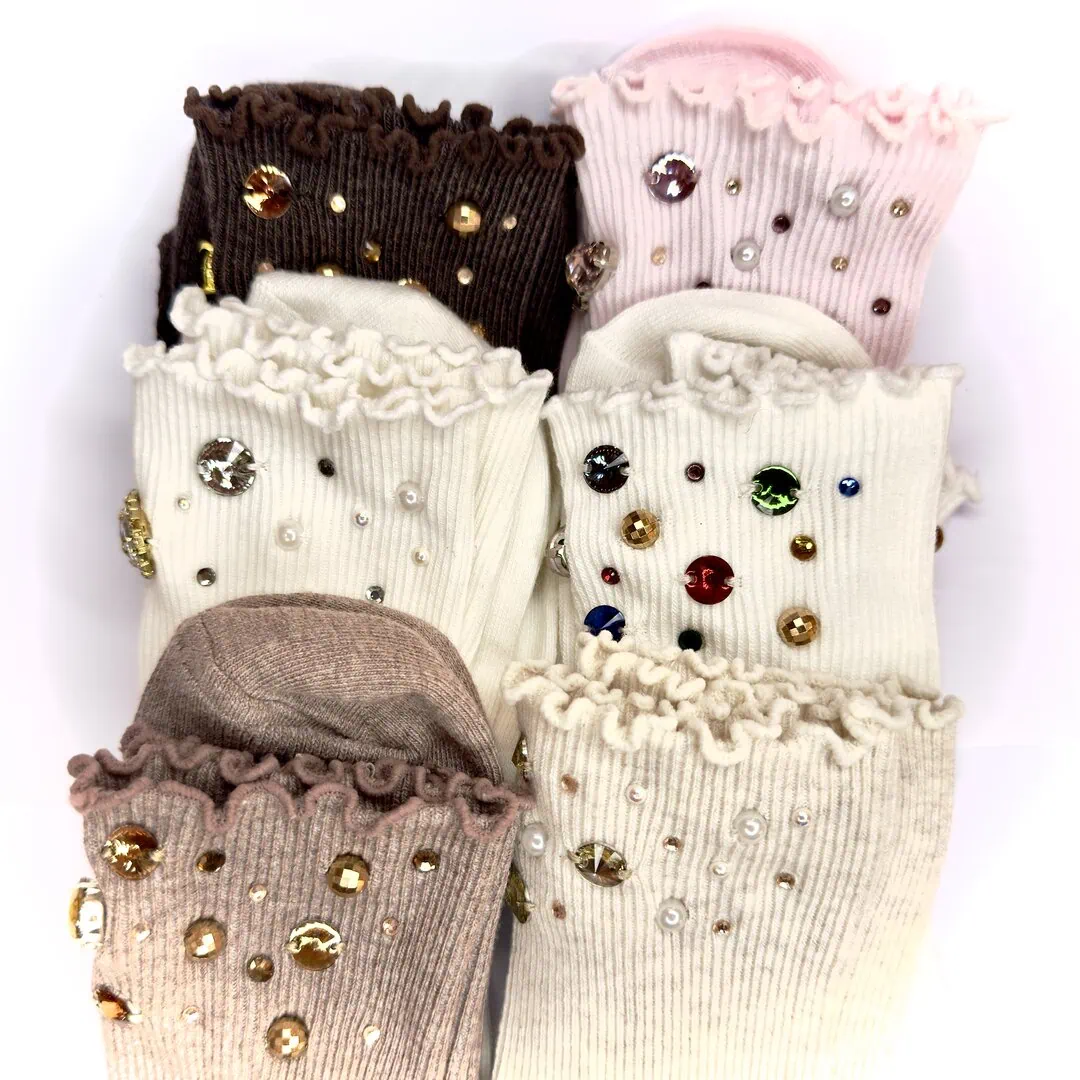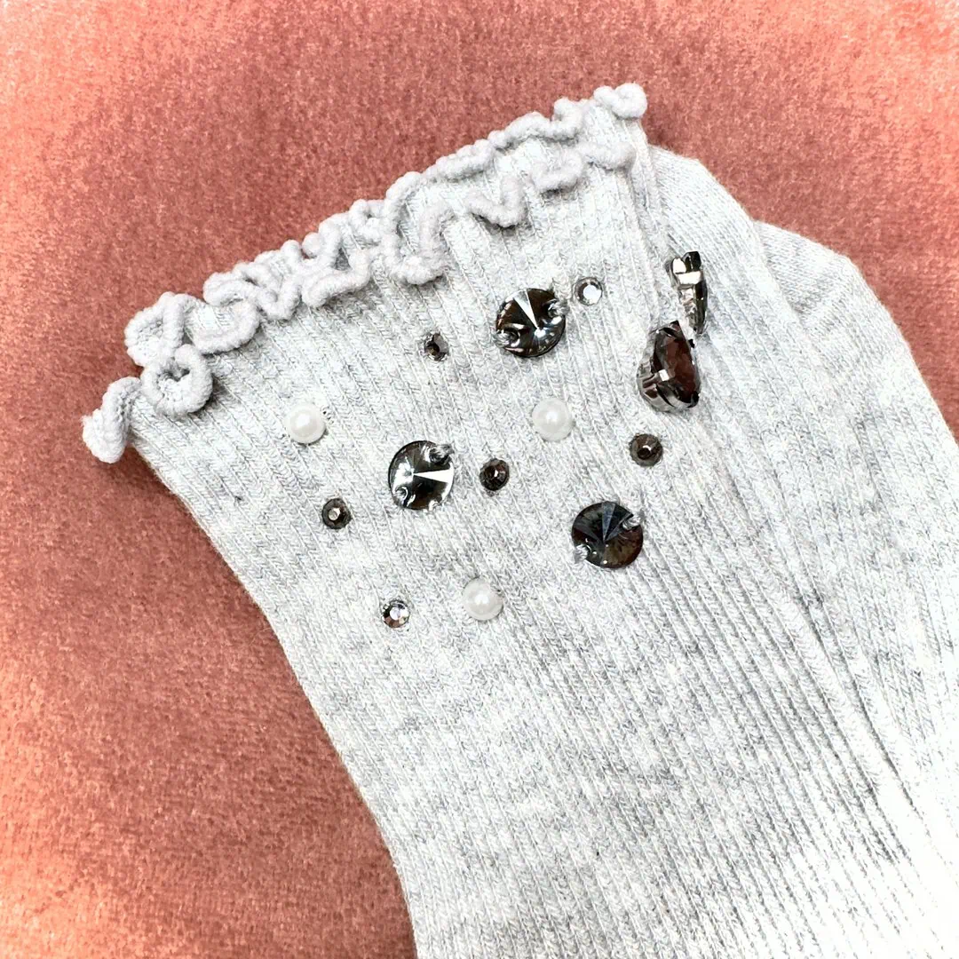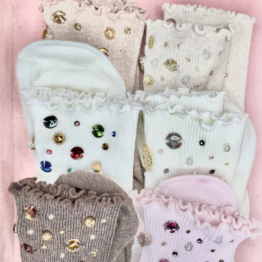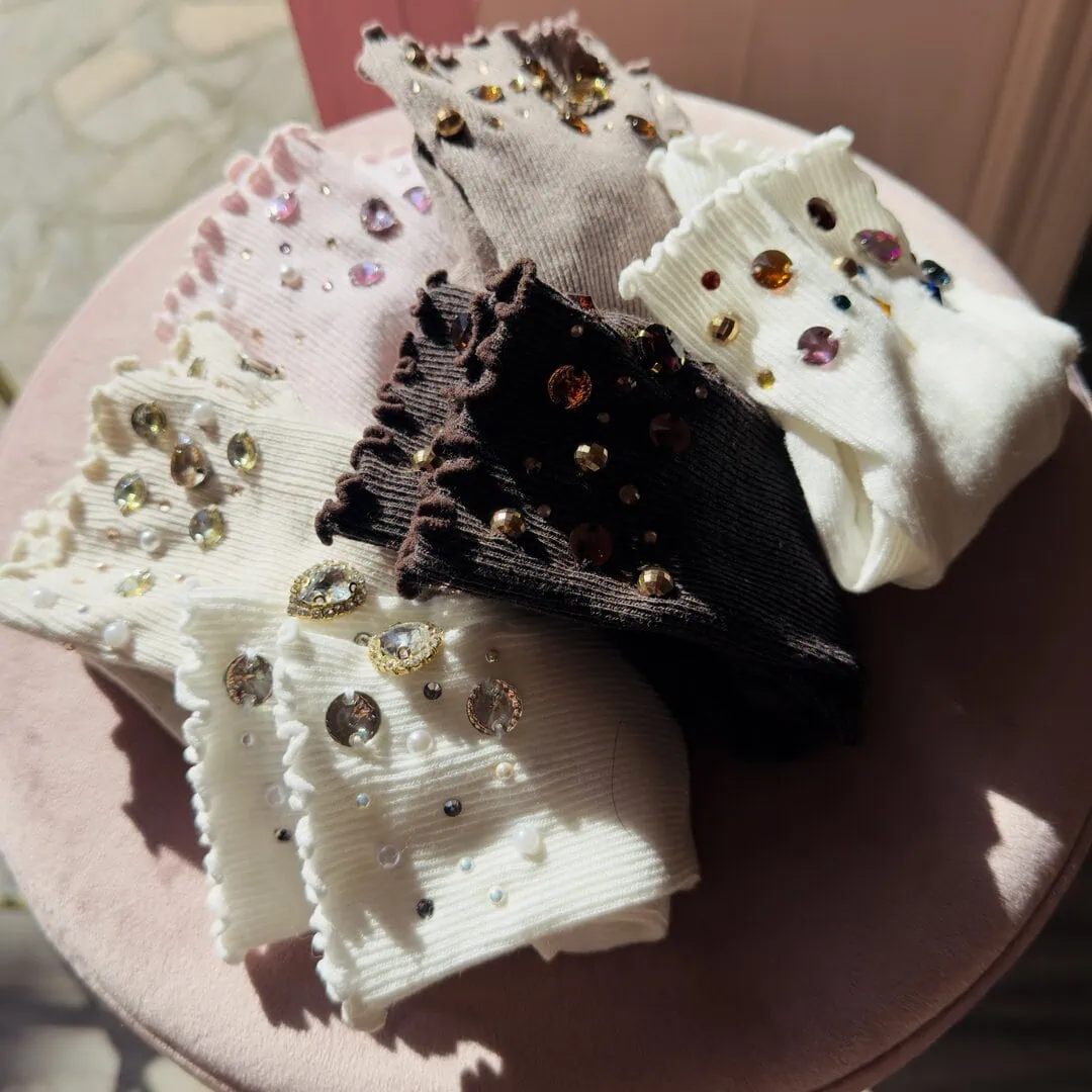 Calze donna particolari in diversi colori con bordatura a rouches che nn stringe con applicazioni di pietre, perle e strass interamente realizzate a mano, in tono ognuno è un piccolo pezzo unico.