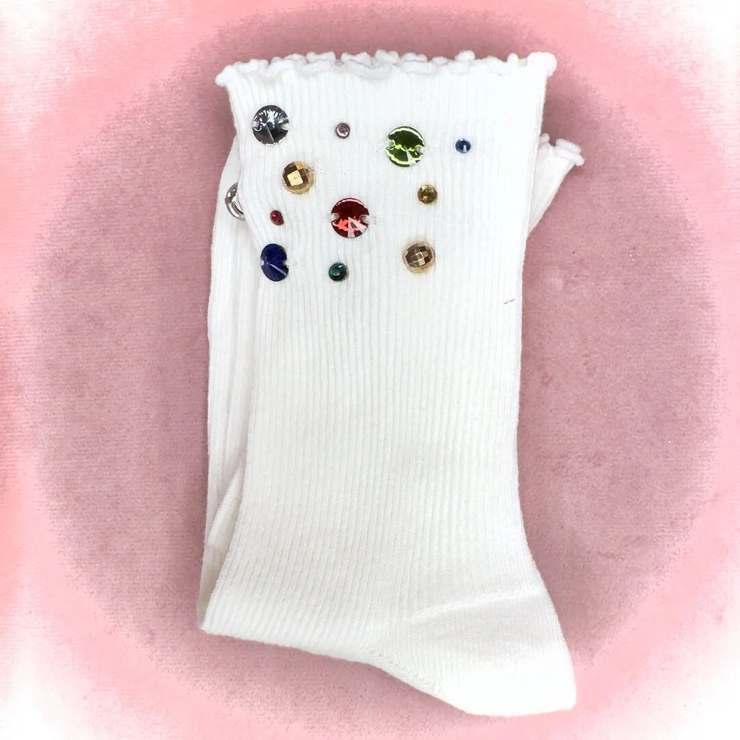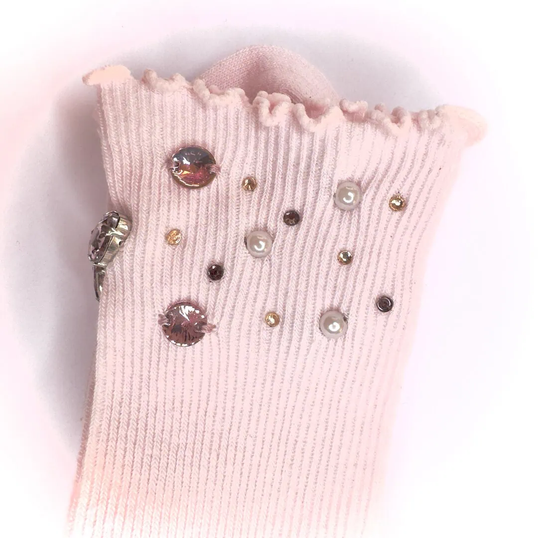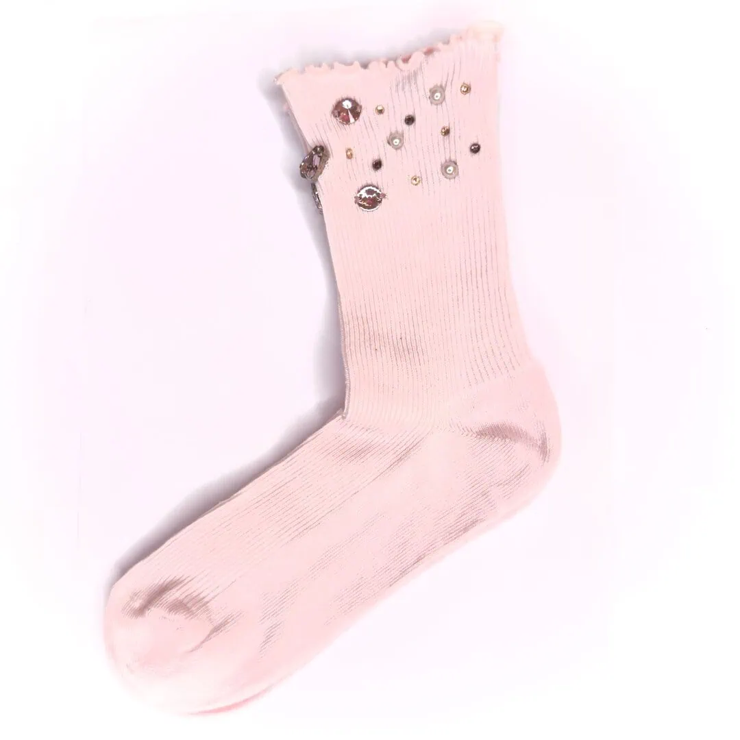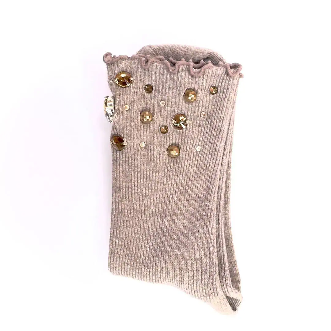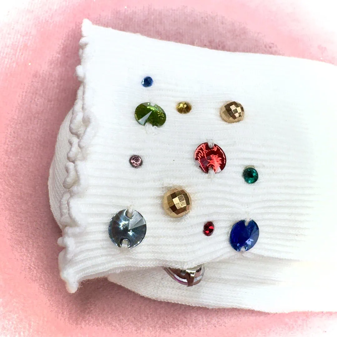 Calze donna particolari in diversi colori con bordatura a rouches che nn stringe con applicazioni di pietre, perle e strass interamente realizzate a mano, in tono ognuno è un piccolo pezzo unico.