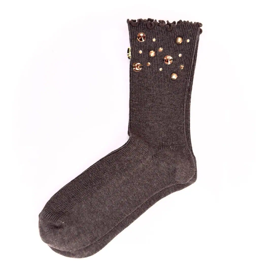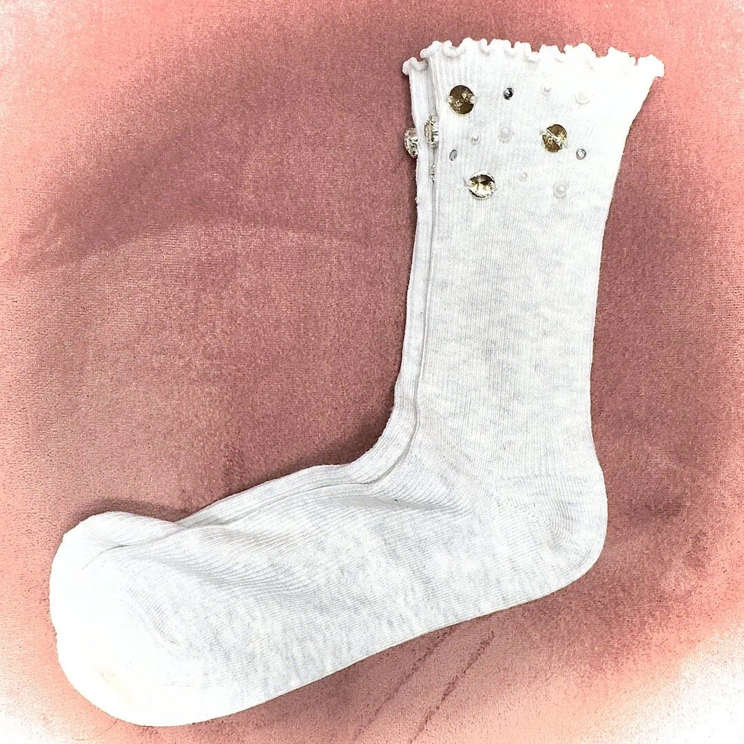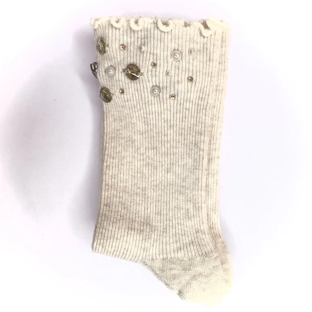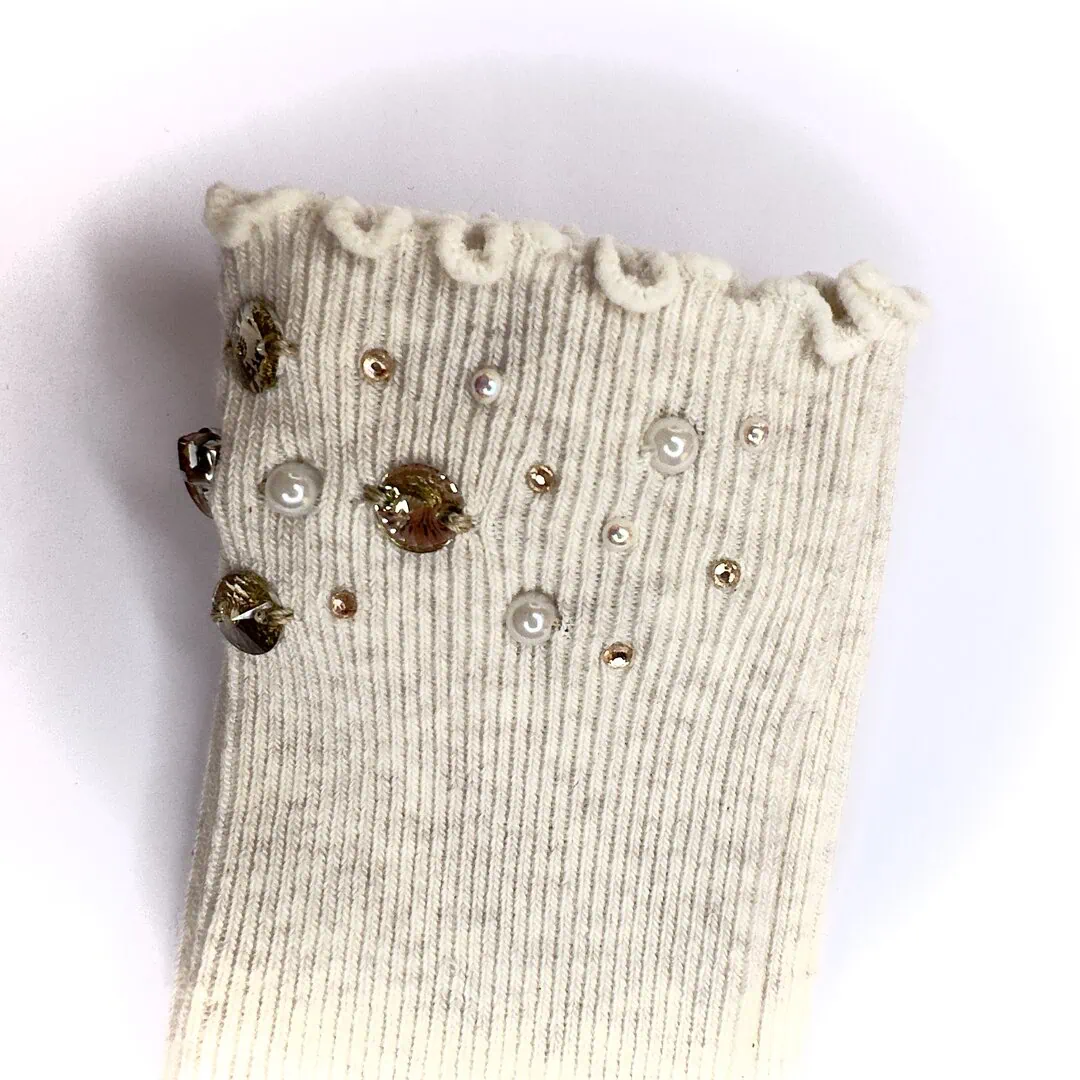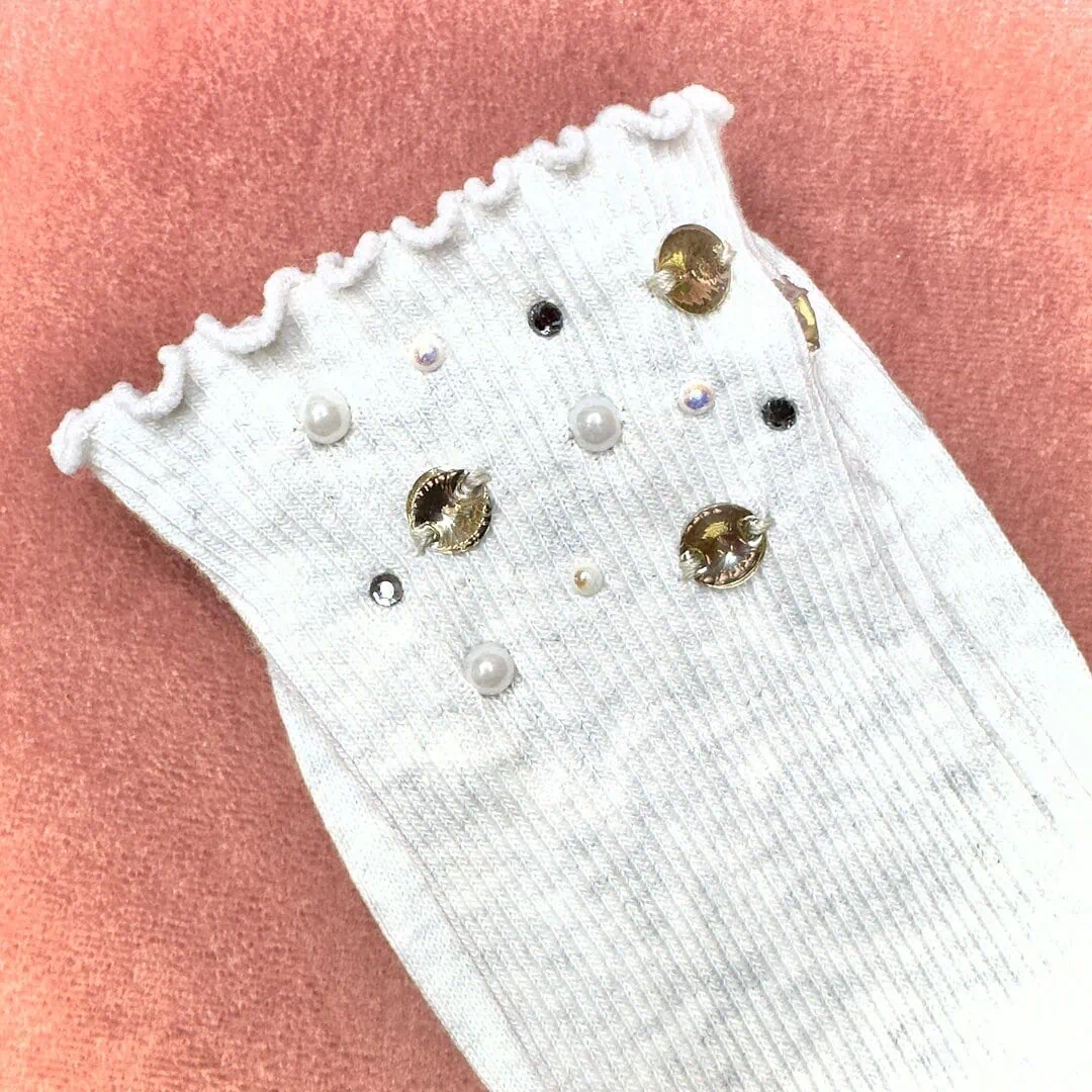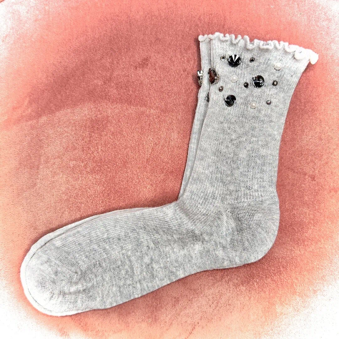 Calze donna particolari in diversi colori con bordatura a rouches che nn stringe con applicazioni di pietre, perle e strass interamente realizzate a mano, in tono ognuno è un piccolo pezzo unico.