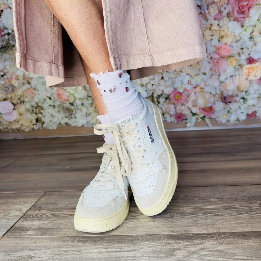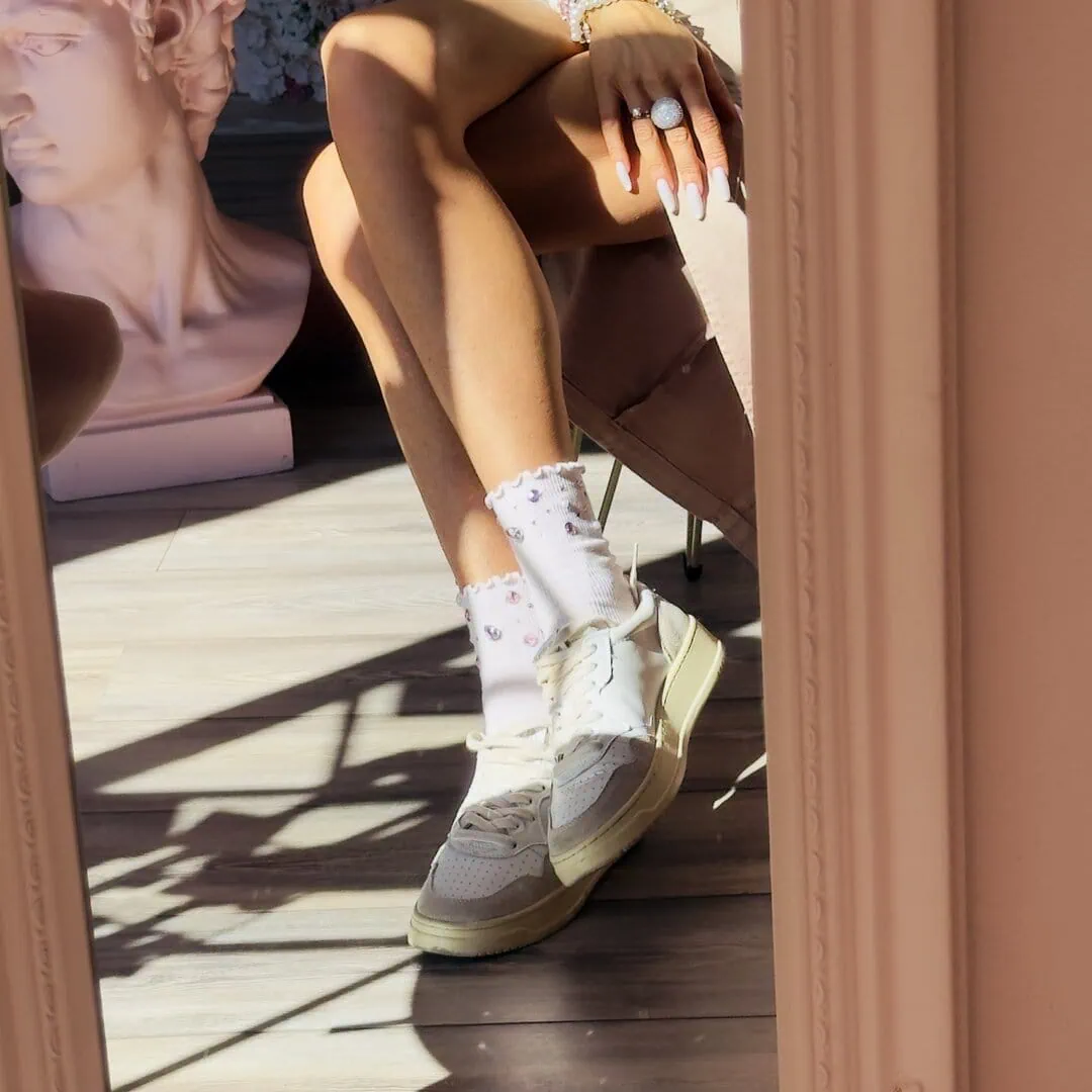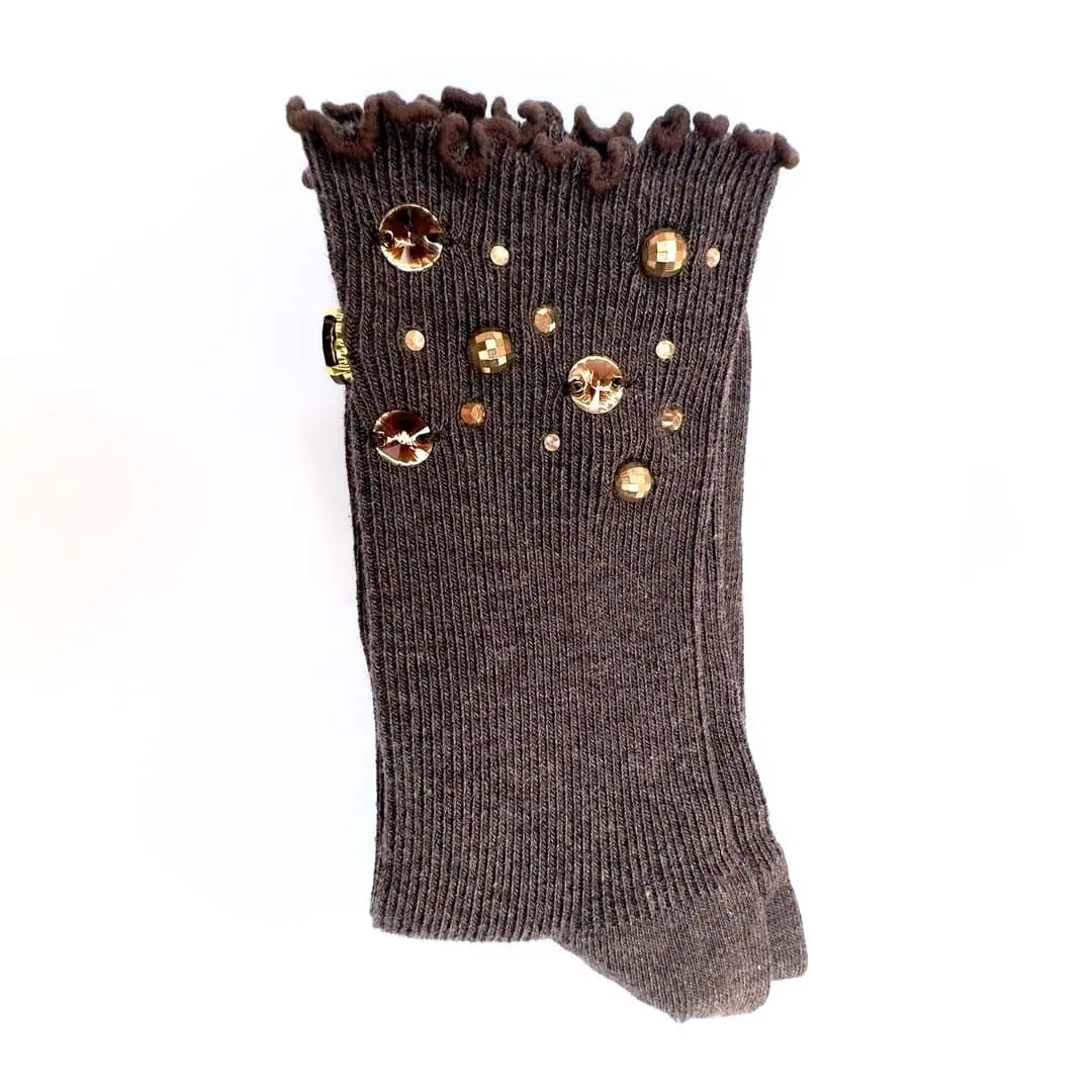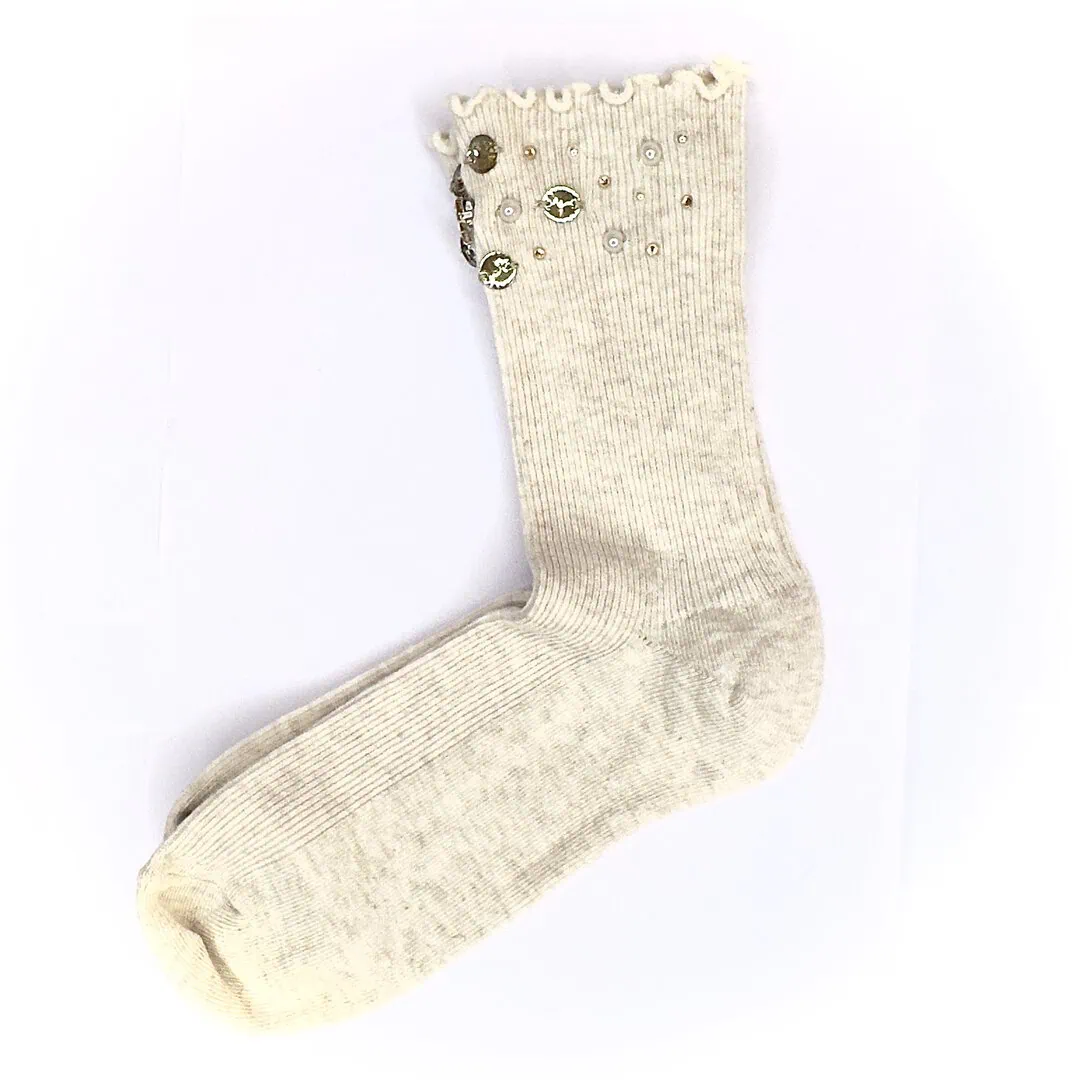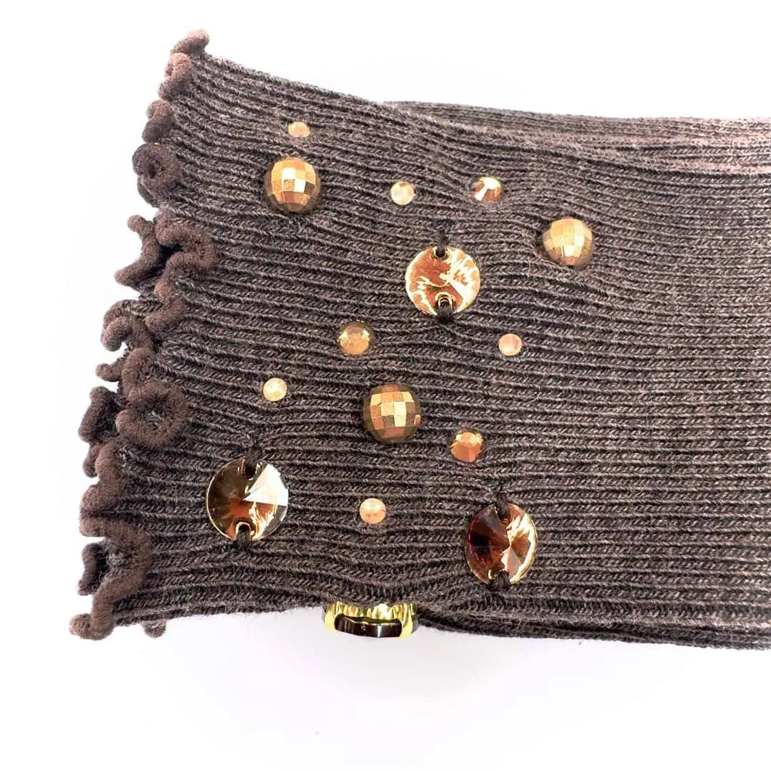 Calze donna particolari in diversi colori con bordatura a rouches che nn stringe con applicazioni di pietre, perle e strass interamente realizzate a mano, in tono ognuno è un piccolo pezzo unico.