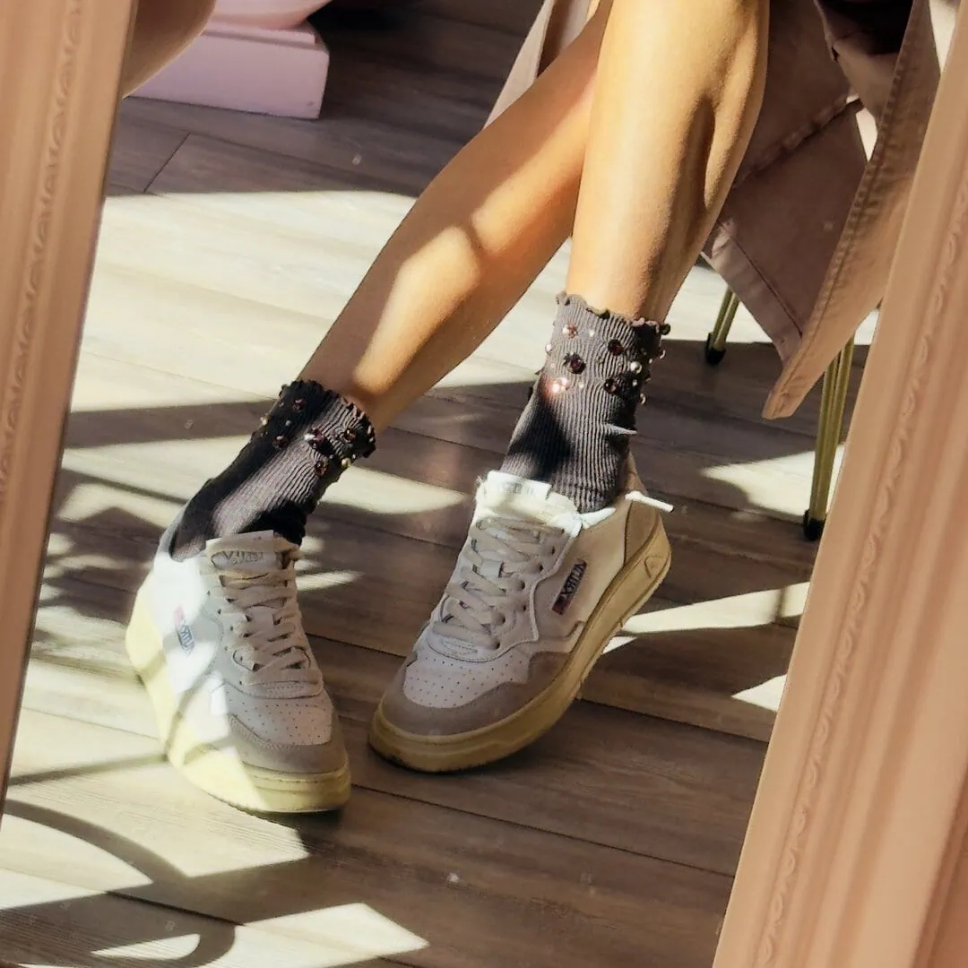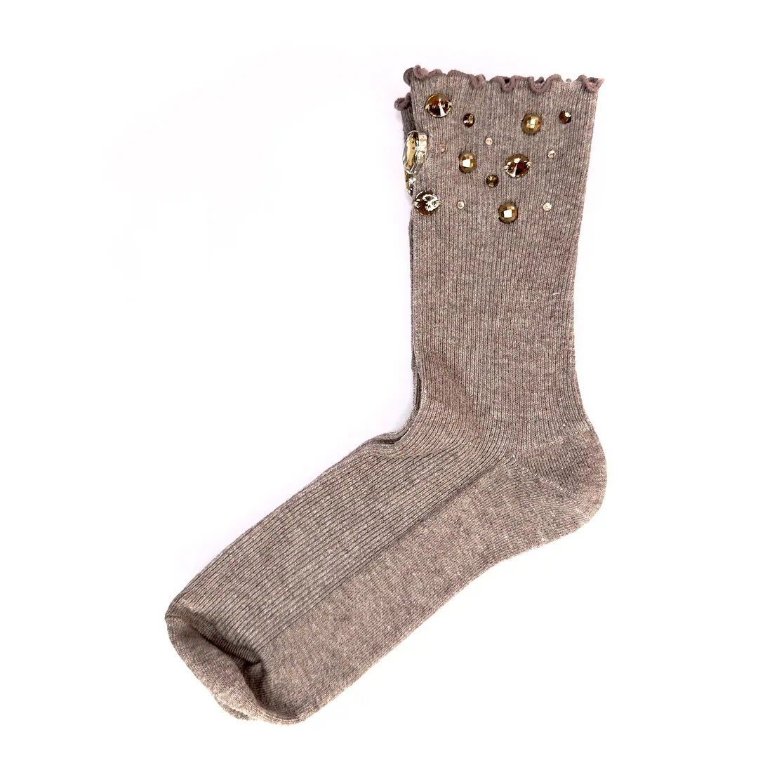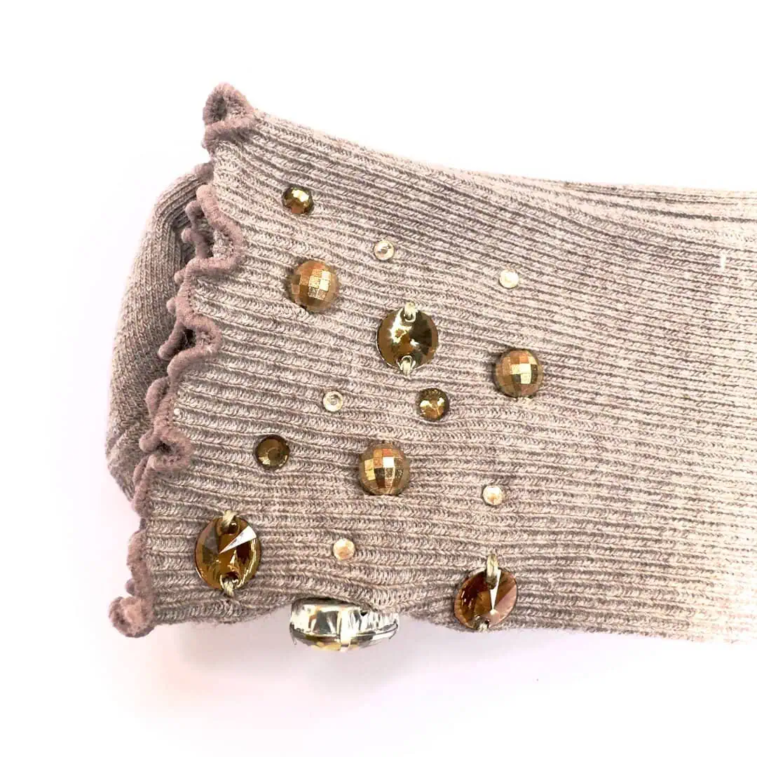 Calze donna particolari con applicazioni realizzate interamente a mano con pietre in vetro cristallo e strass.