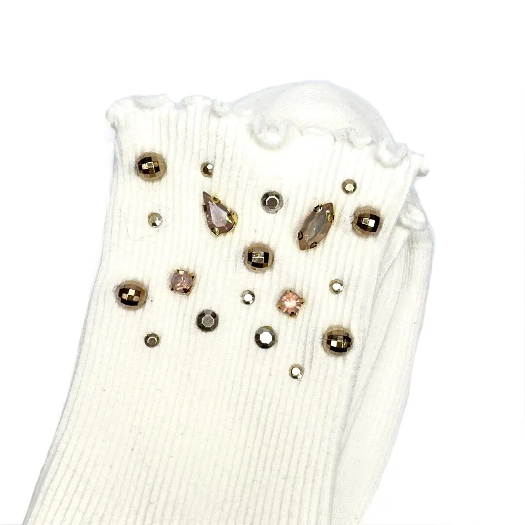 Calze donna particolari in diversi colori con bordatura a rouches che nn stringe con applicazioni di pietre, perle e strass interamente realizzate a mano, in tono ognuno è un piccolo pezzo unico.