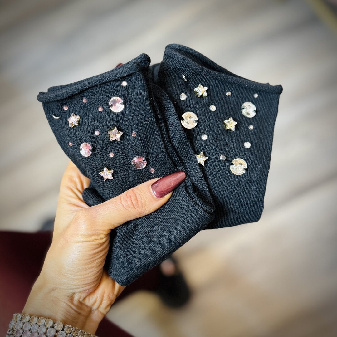 Calze stelle con pietre incastonate in vetro cristallo su base nera in 100% cotone interamente realizzate a mano, ognuno è un piccolo pezzo unico.