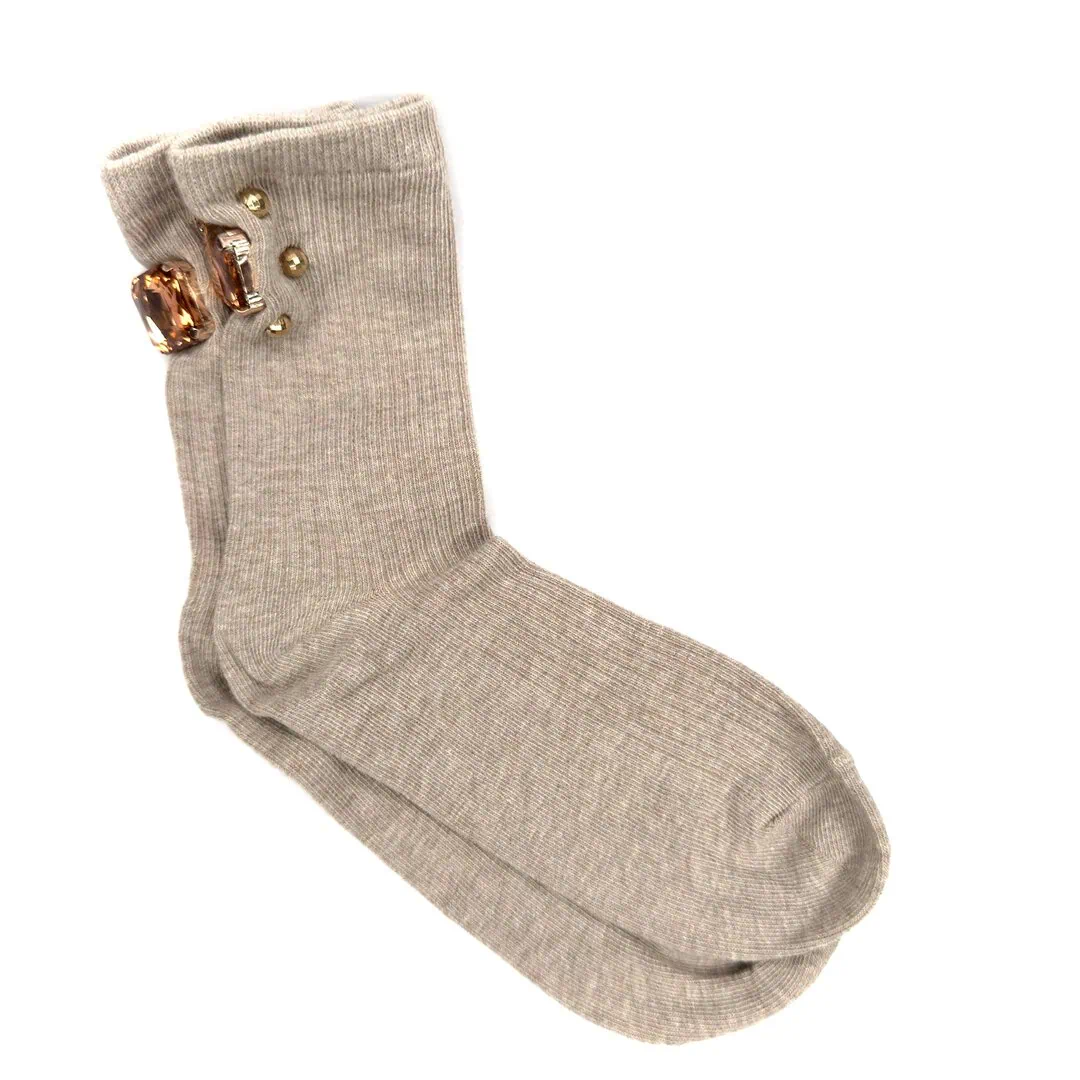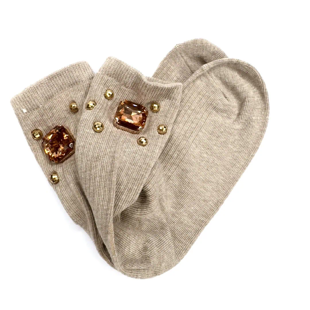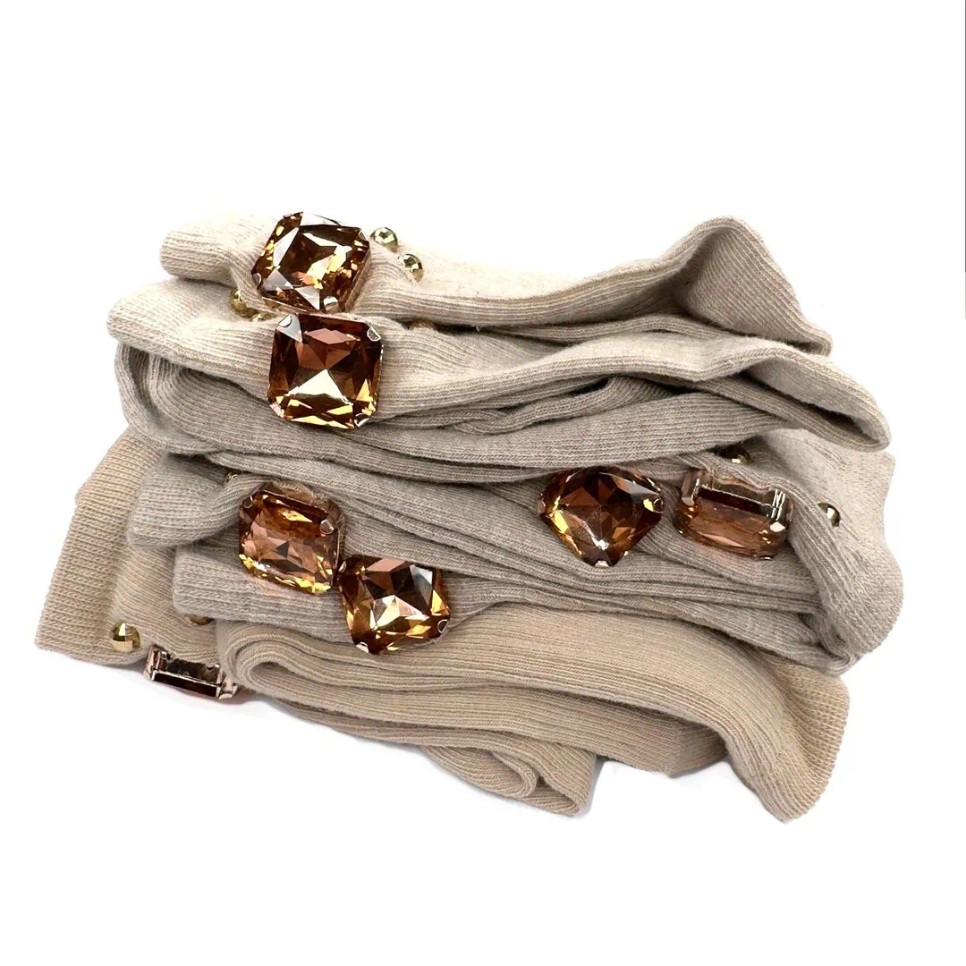 Calzini alti nude su base nude con bordatura che nn stringe con applicazione sul retro con maxi pietra rosata e beads interamente realizzate a mano, in tono ognuno è un piccolo pezzo unico.