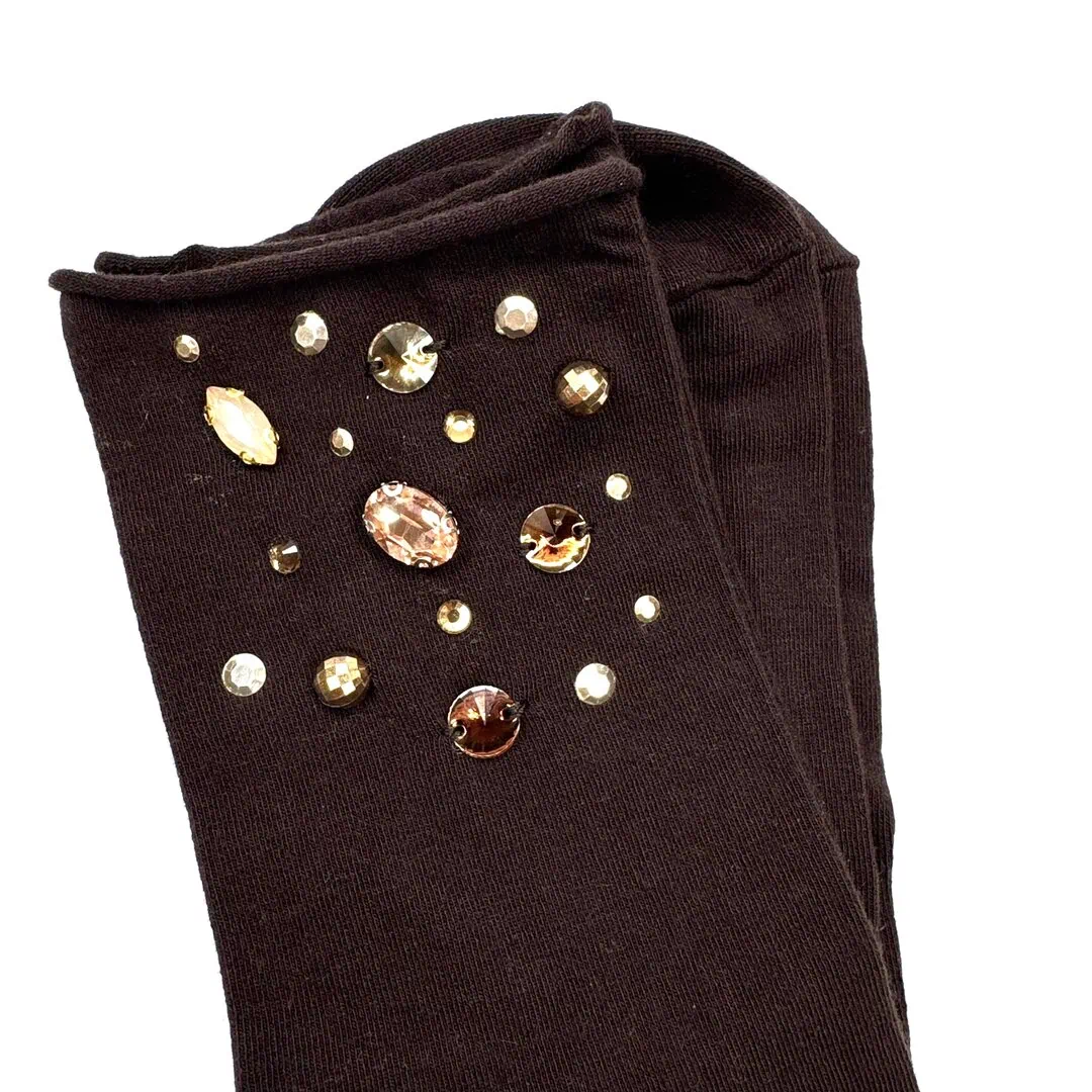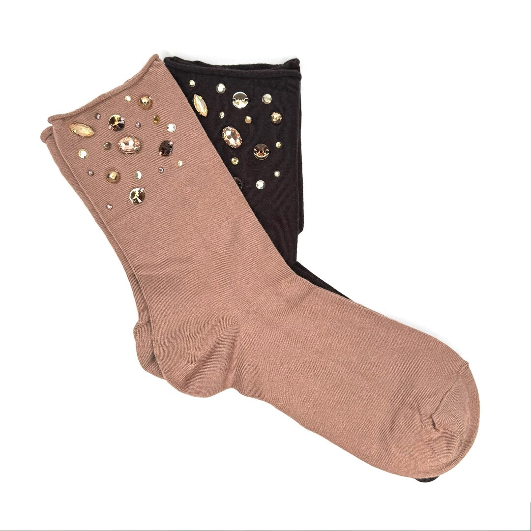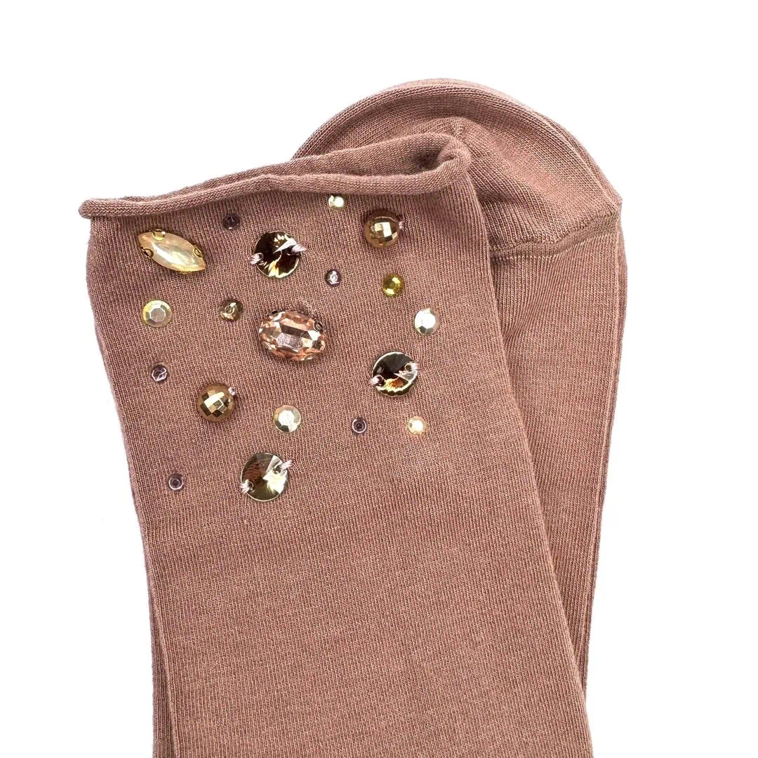 Calzini di cashmere con pietre gioiello su base in cotone e cashmere disponibile in varie nuances con bordatura che nn stringe con applicazioni di pietre e strass, micro borchie interamente realizzate a mano, in tono ognuno è un piccolo pezzo unico.