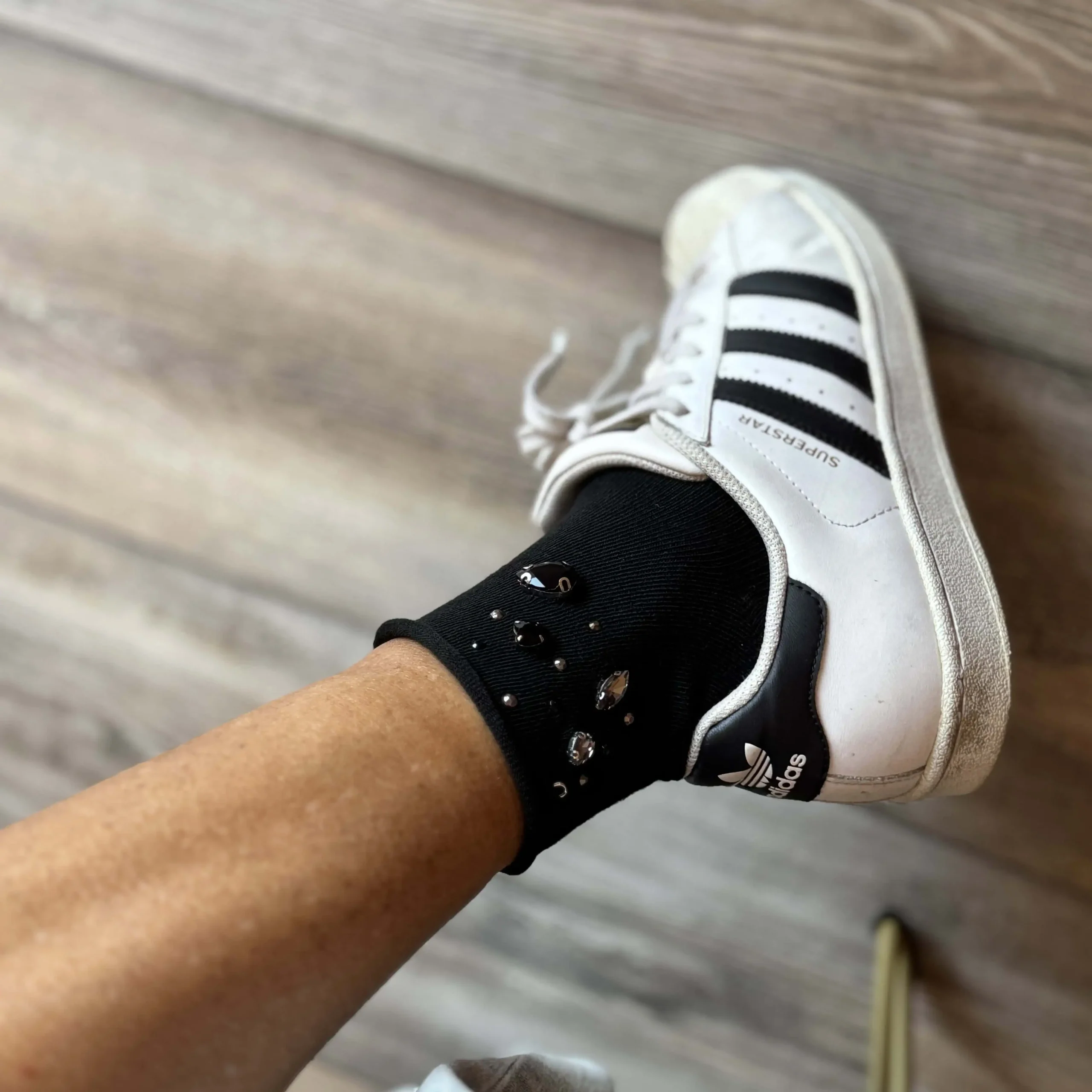 Calzini donna fantasia su base color grigio o nero con bordatura che nn stringe con applicazioni di pietre nero ed antracite in varie forme e strass micro borchia interamente realizzate a mano, in tono ognuno è un piccolo pezzo unico.