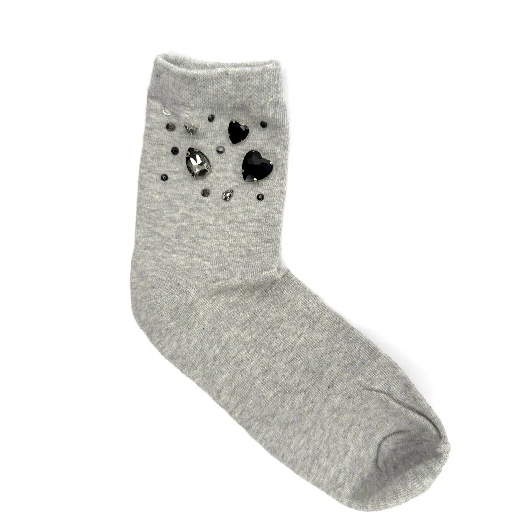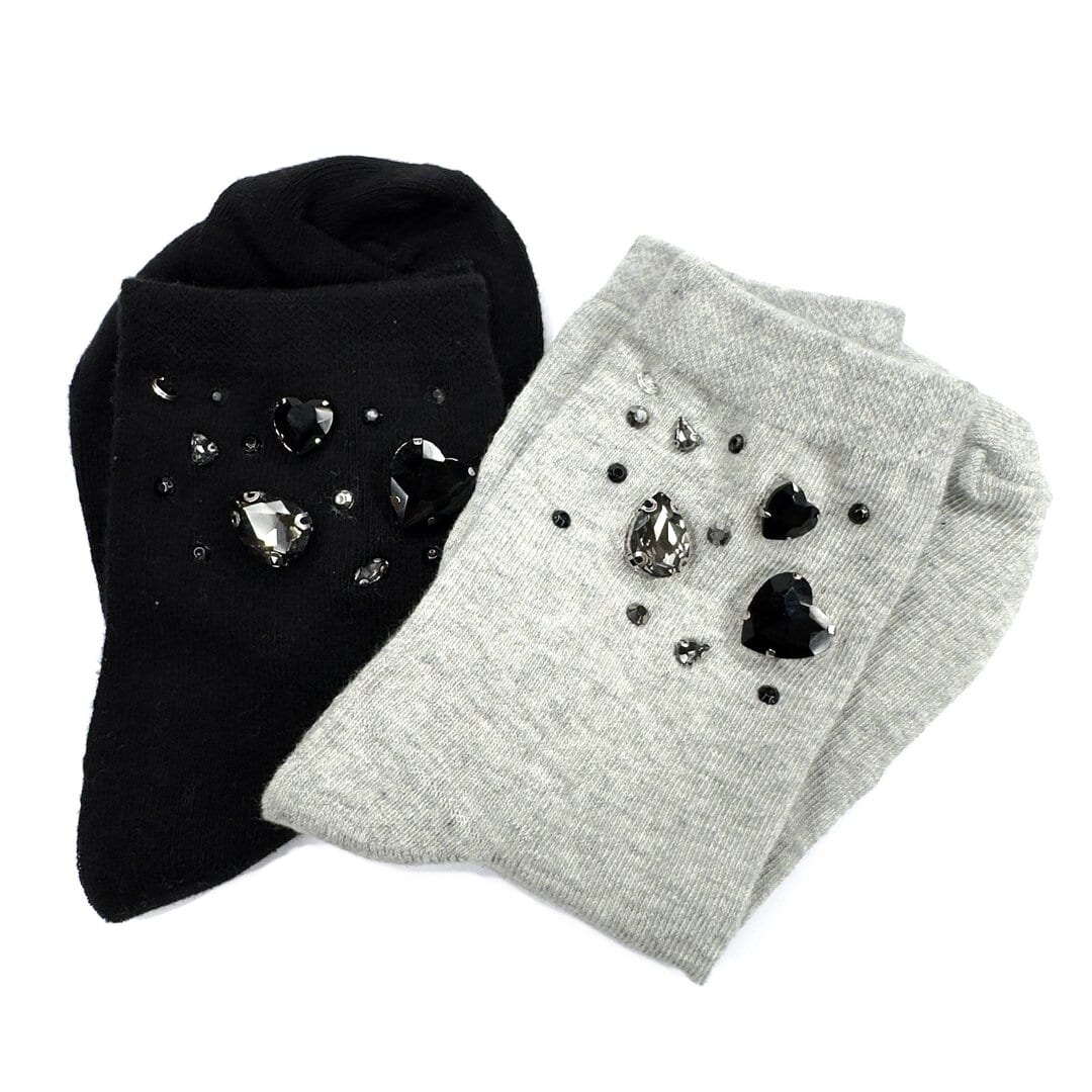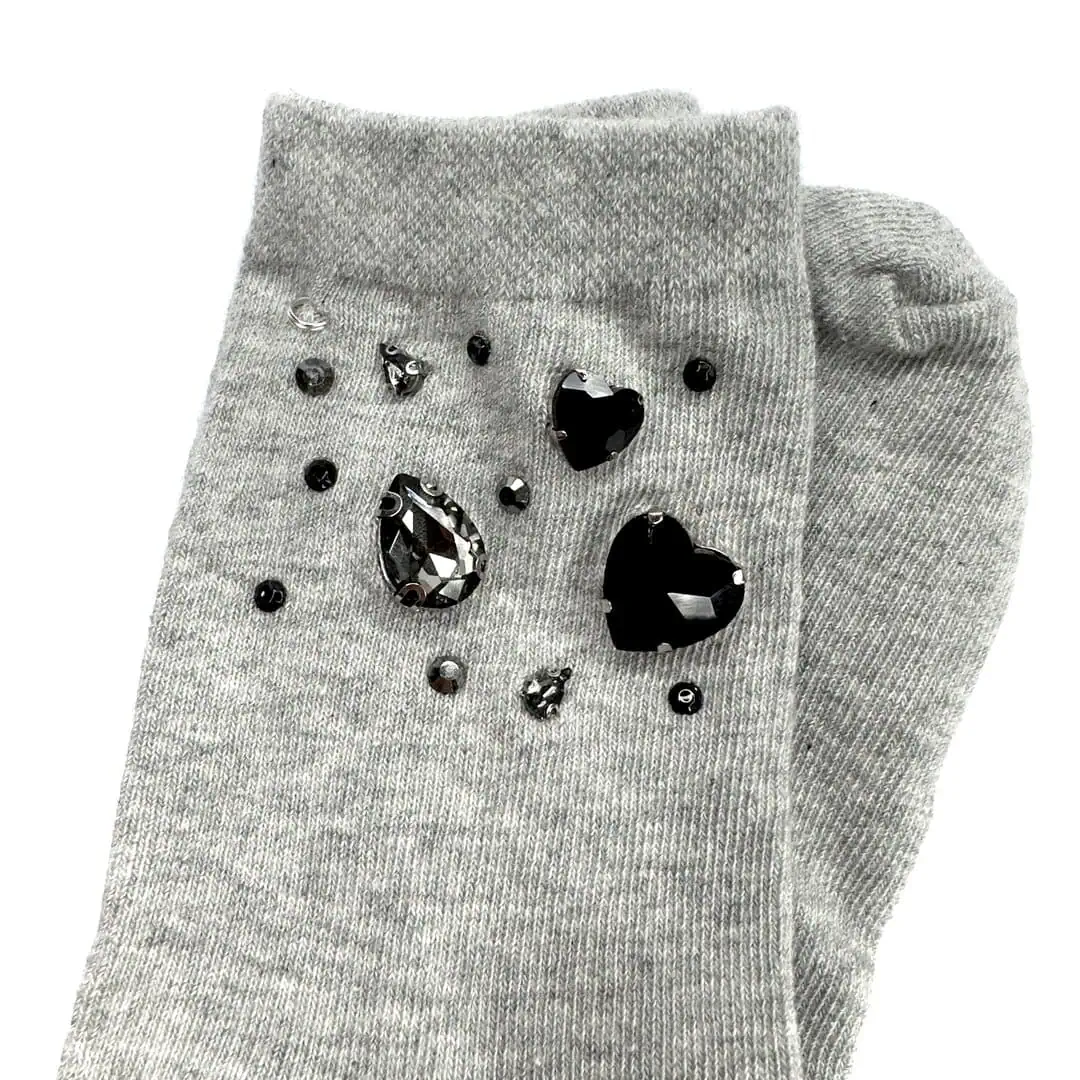 Calzini donna fantasia su base color grigio o nero con bordatura che nn stringe con applicazioni di pietre nero ed antracite a forma di cuore e strass micro borchia interamente realizzate a mano, in tono ognuno è un piccolo pezzo unico.