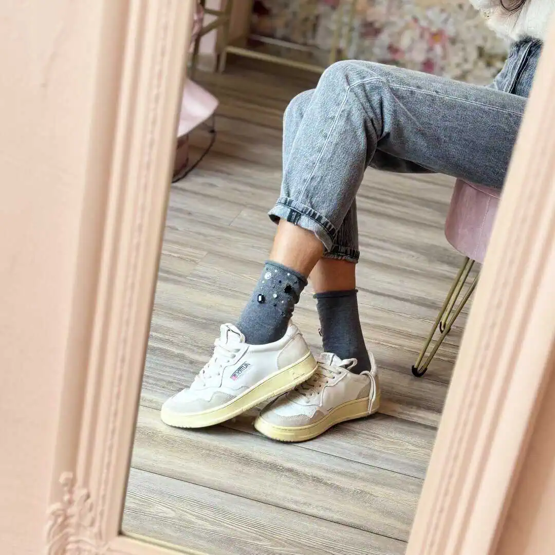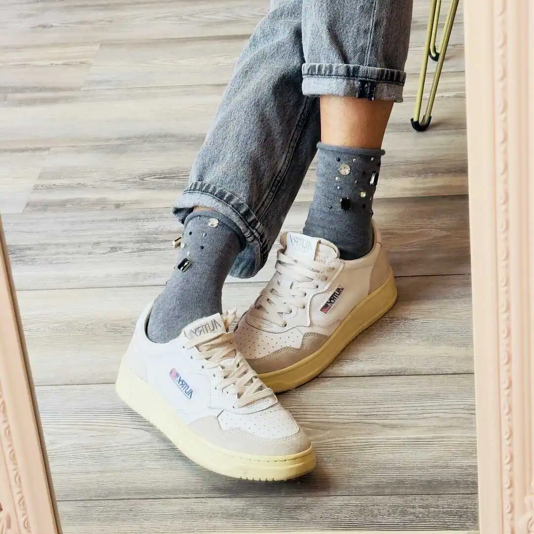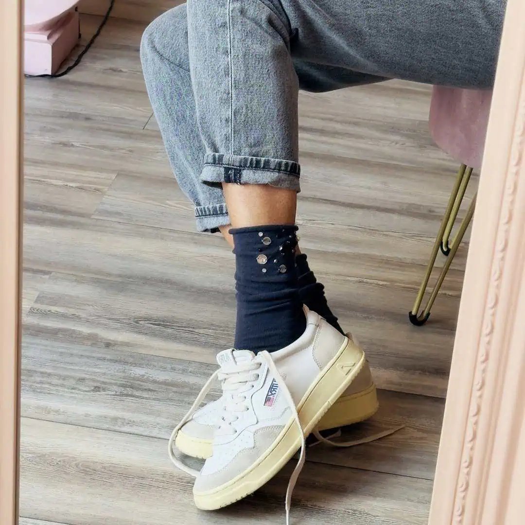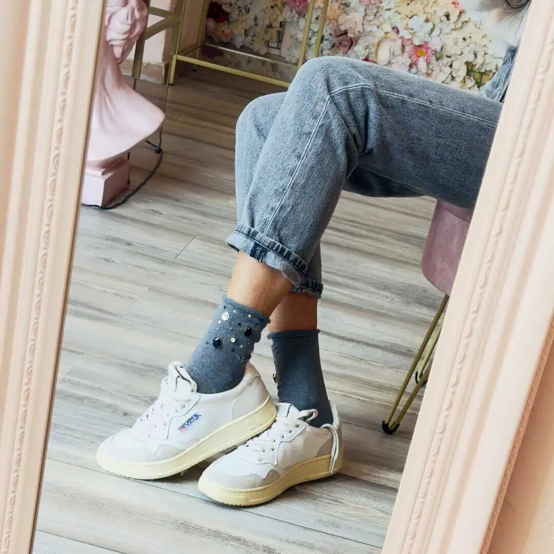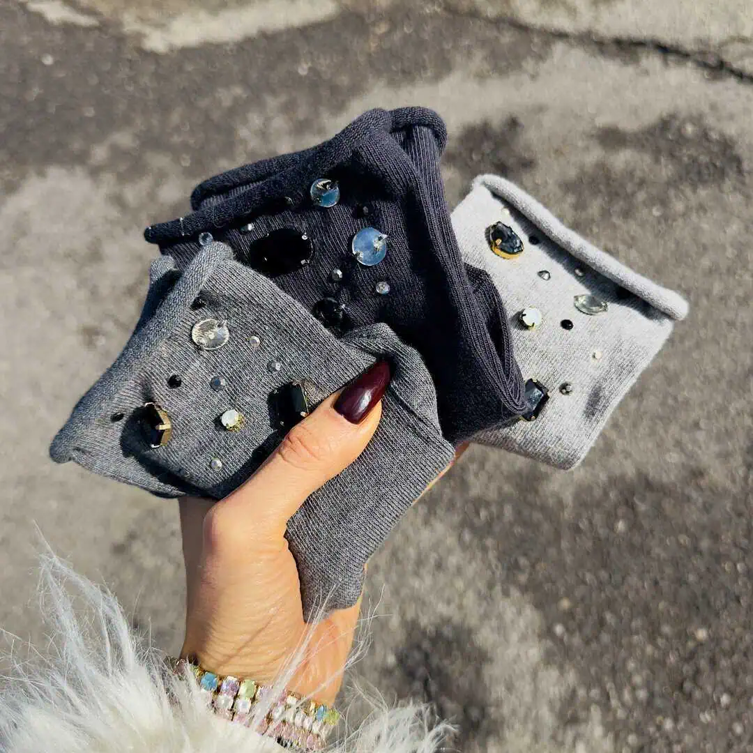 Calzini donna fantasia su base in vari colori con bordatura a taglio vivo che nn stringe con applicazioni di pietre nero in vari colori e varie forme e strass micro borchia interamente realizzate a mano, in tono ognuno è un piccolo pezzo unico.