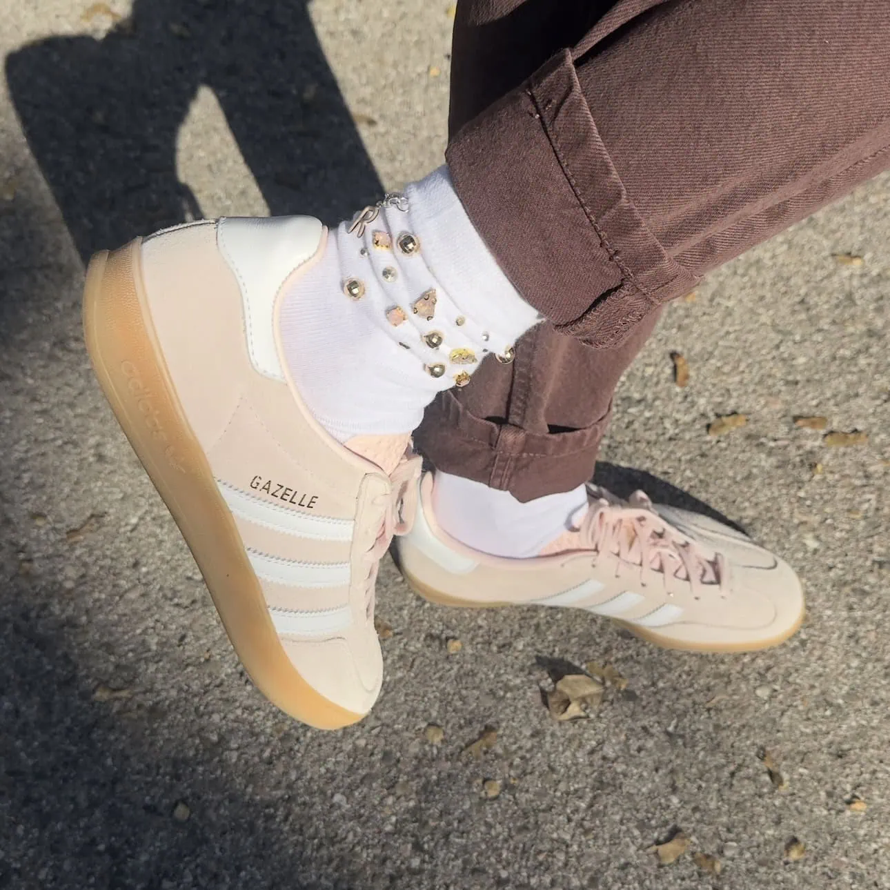 Calzini donna fashion su base color rosa, bianco o nero con bordatura che nn stringe con applicazioni di pietre con finish satinato rosato e strass micro borchia interamente realizzate a mano, in tono ognuno è un piccolo pezzo unico.
