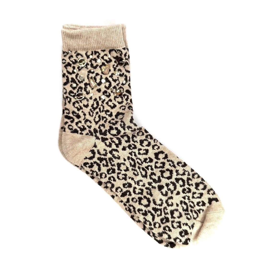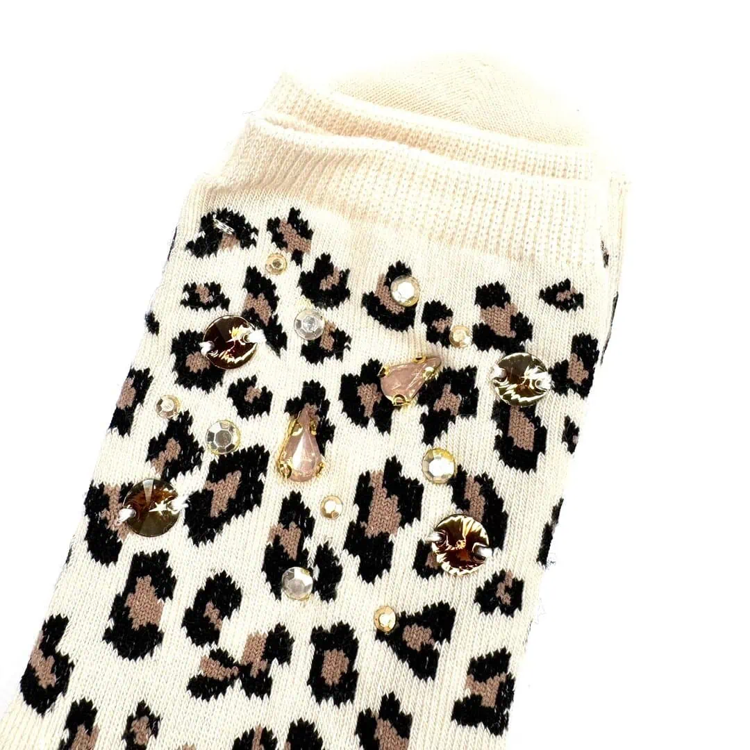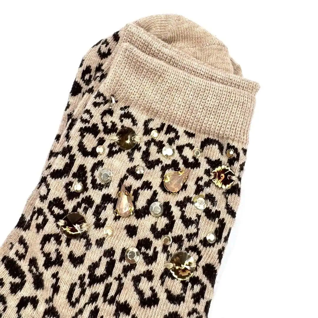 Calzini leopardati con applicazioni realizzate interamente a mano con pietre in vetro cristallo e strass.