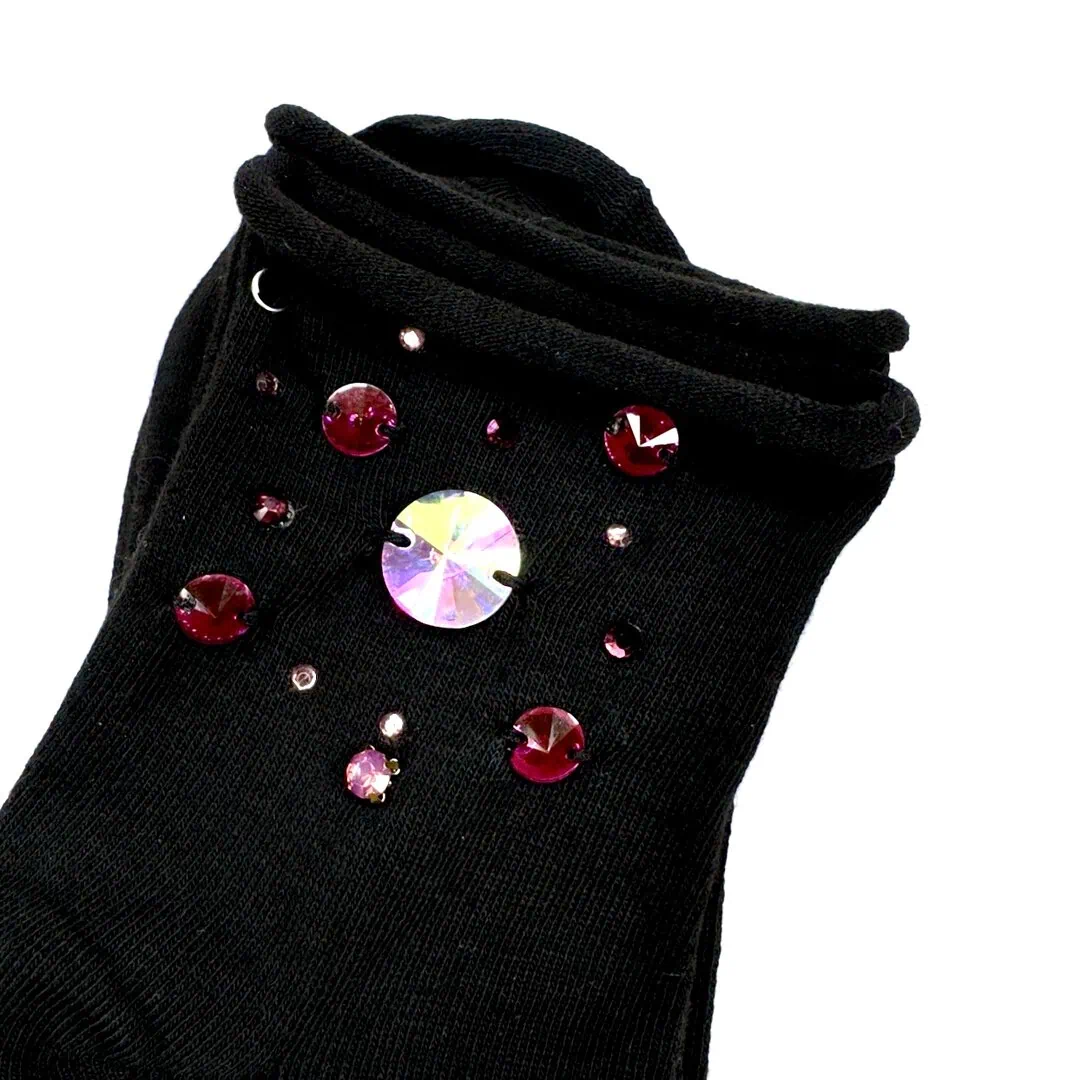 Calzini neri con pietre in vetro cristallo su base nera in 100% cotone interamente realizzate a mano, ognuno è un piccolo pezzo unico.