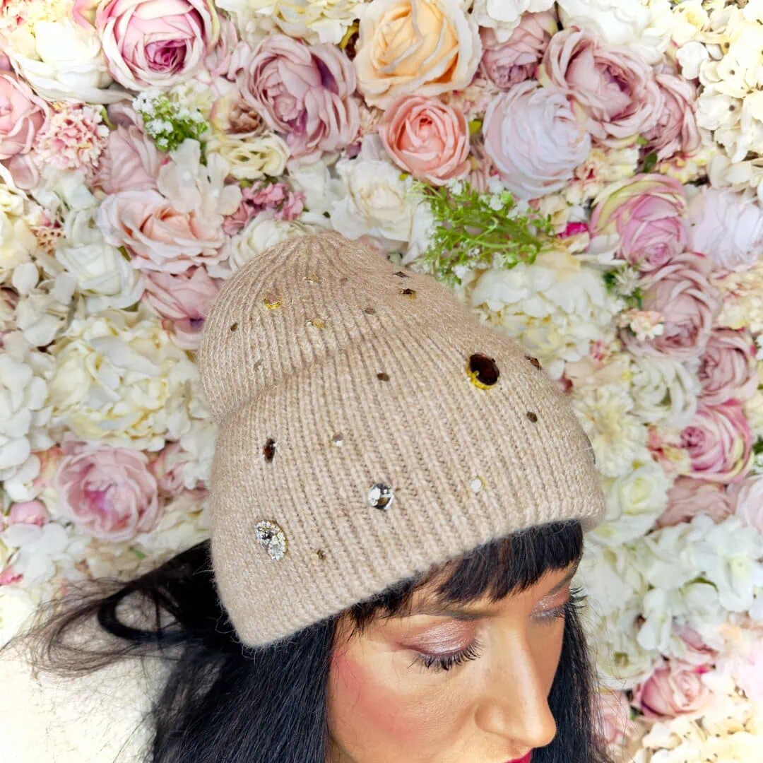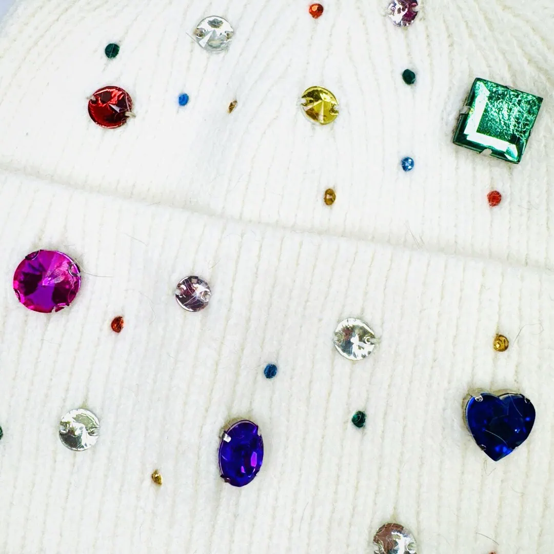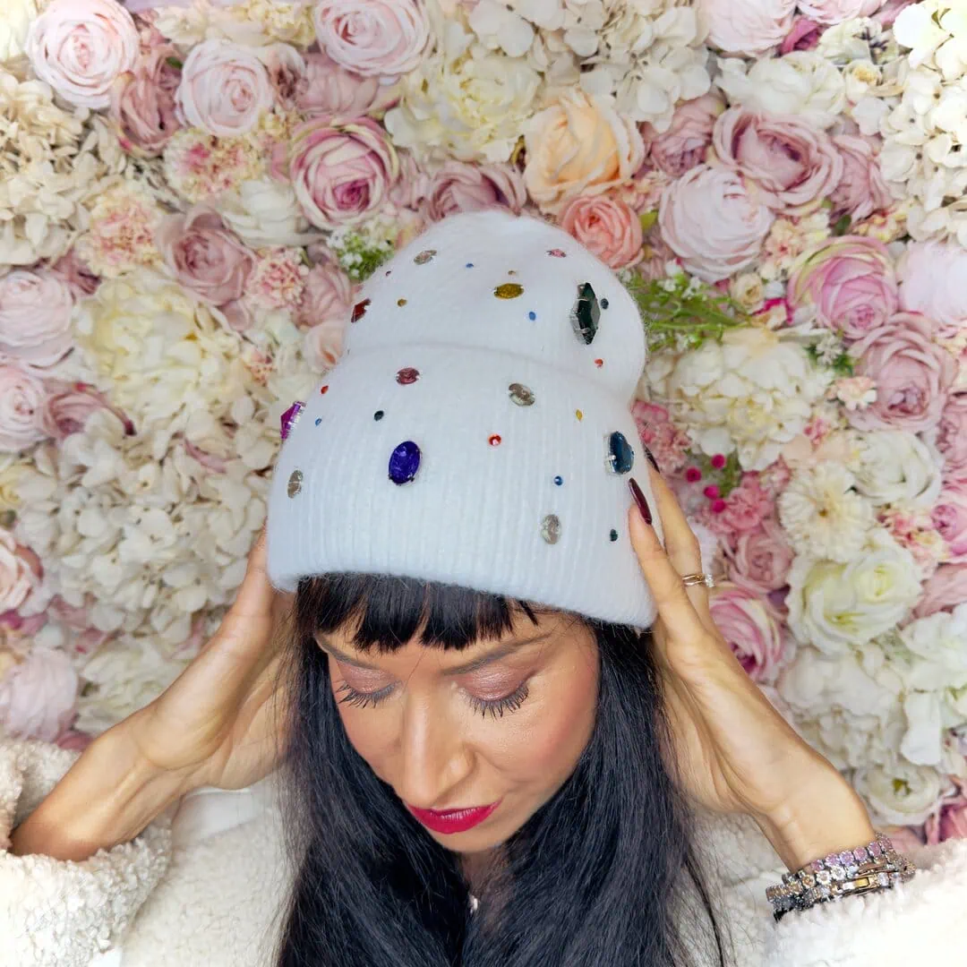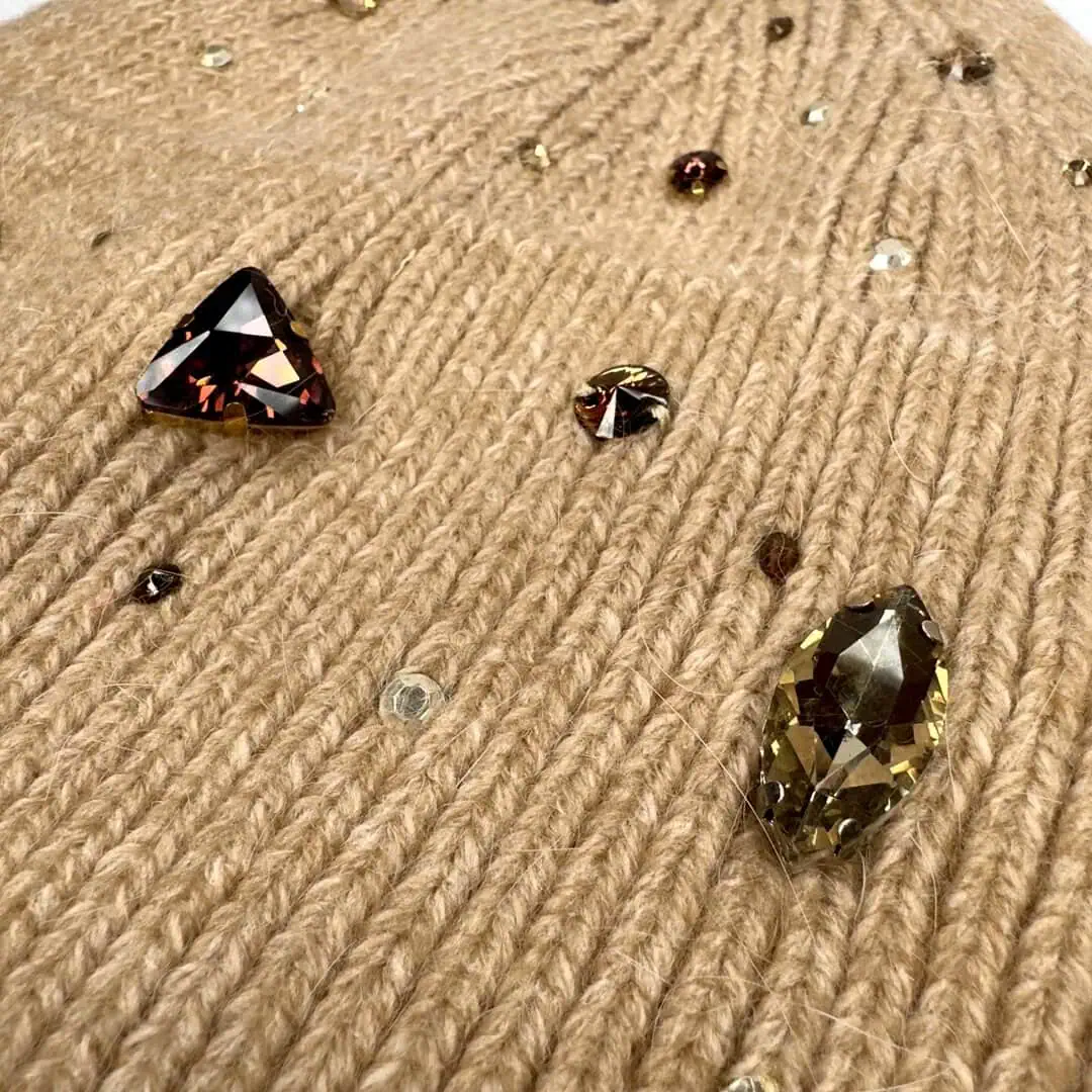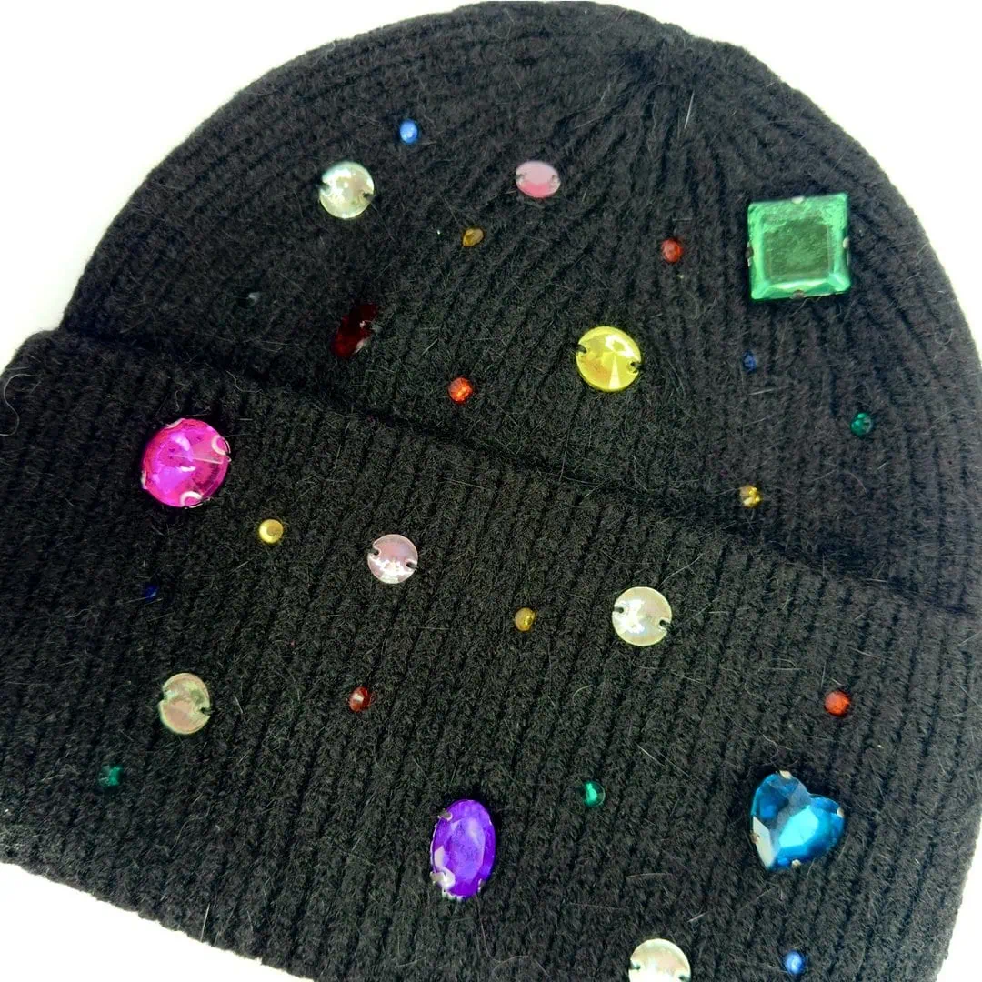 Cappello di lana invernale modello “beanie” con applicazione di pietre realizzata a mano.