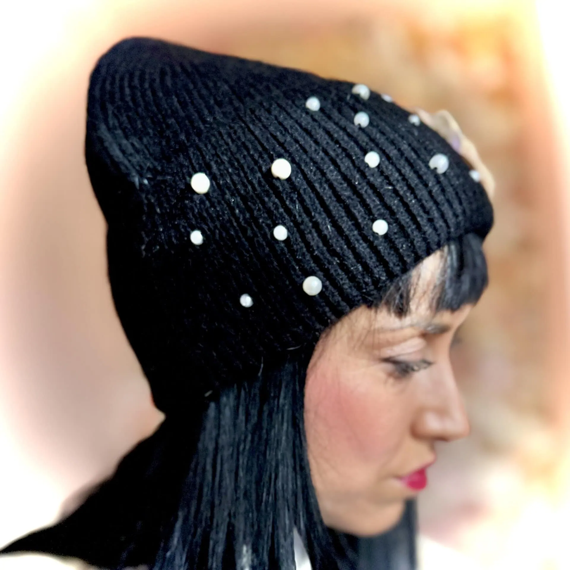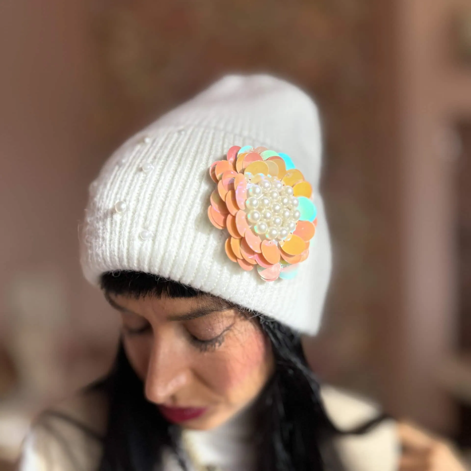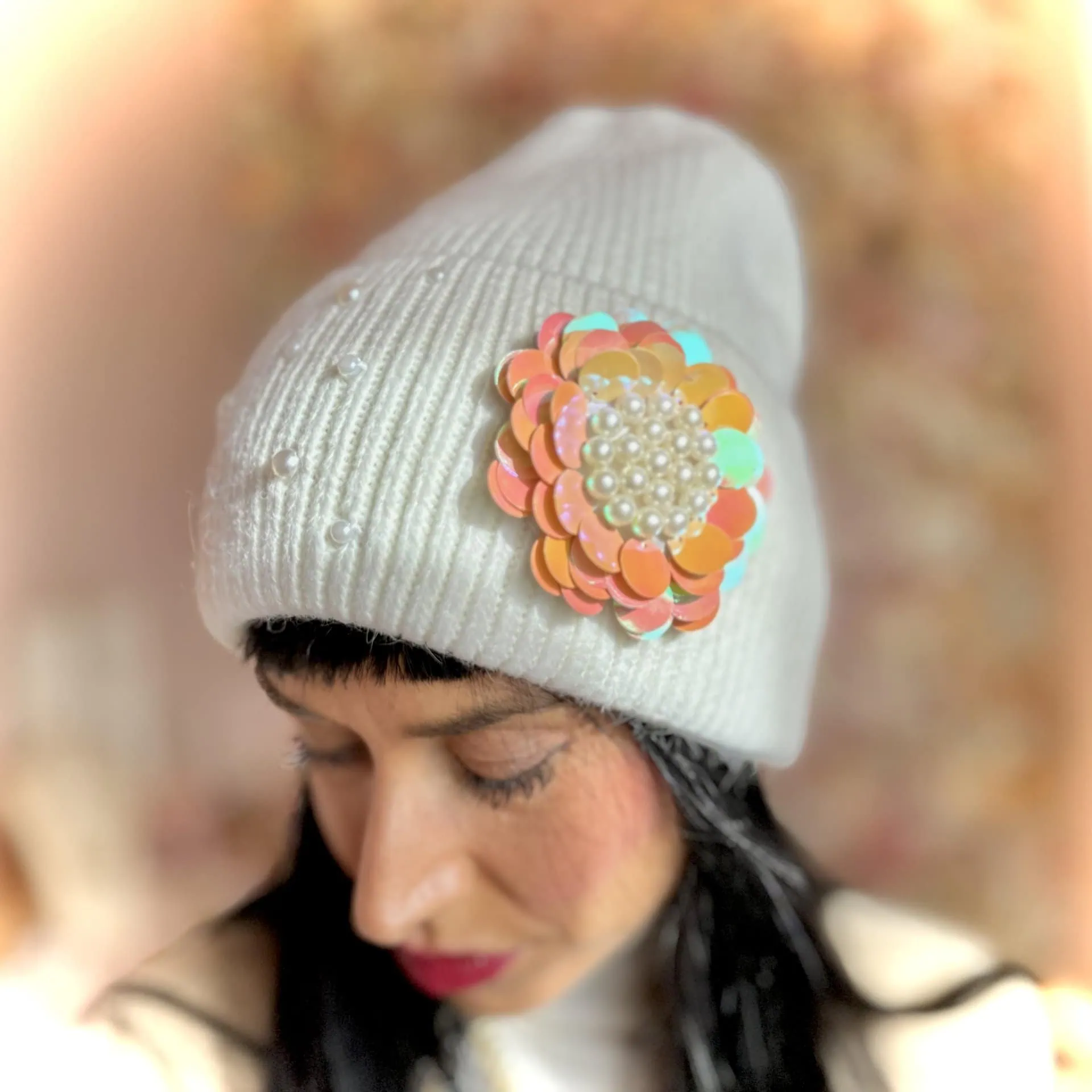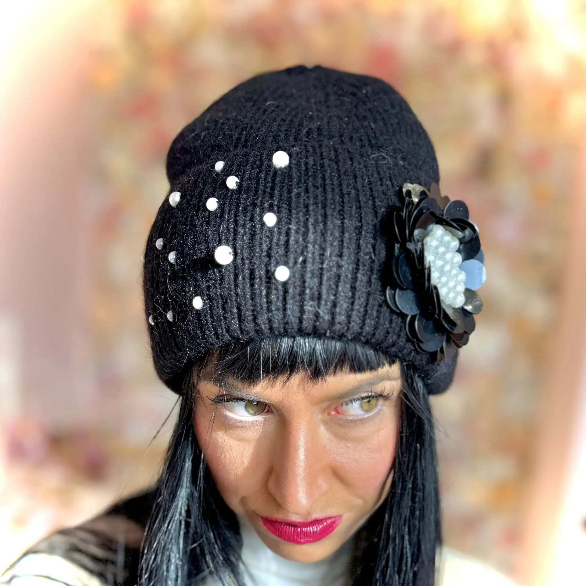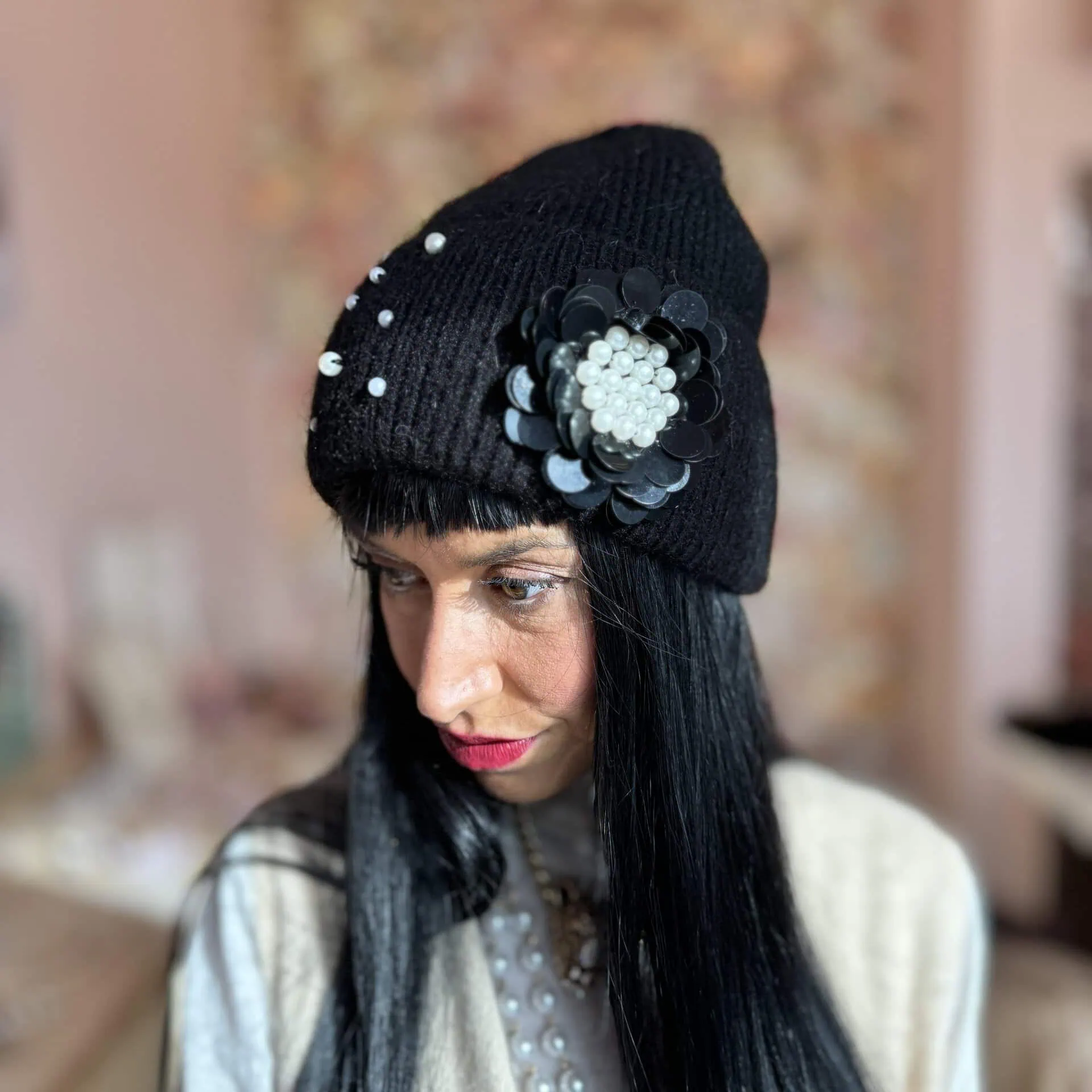 Cappello donna invernale modello “beanie” con battuta e maxi applicazione con paillettes e perle realizzata a mano.