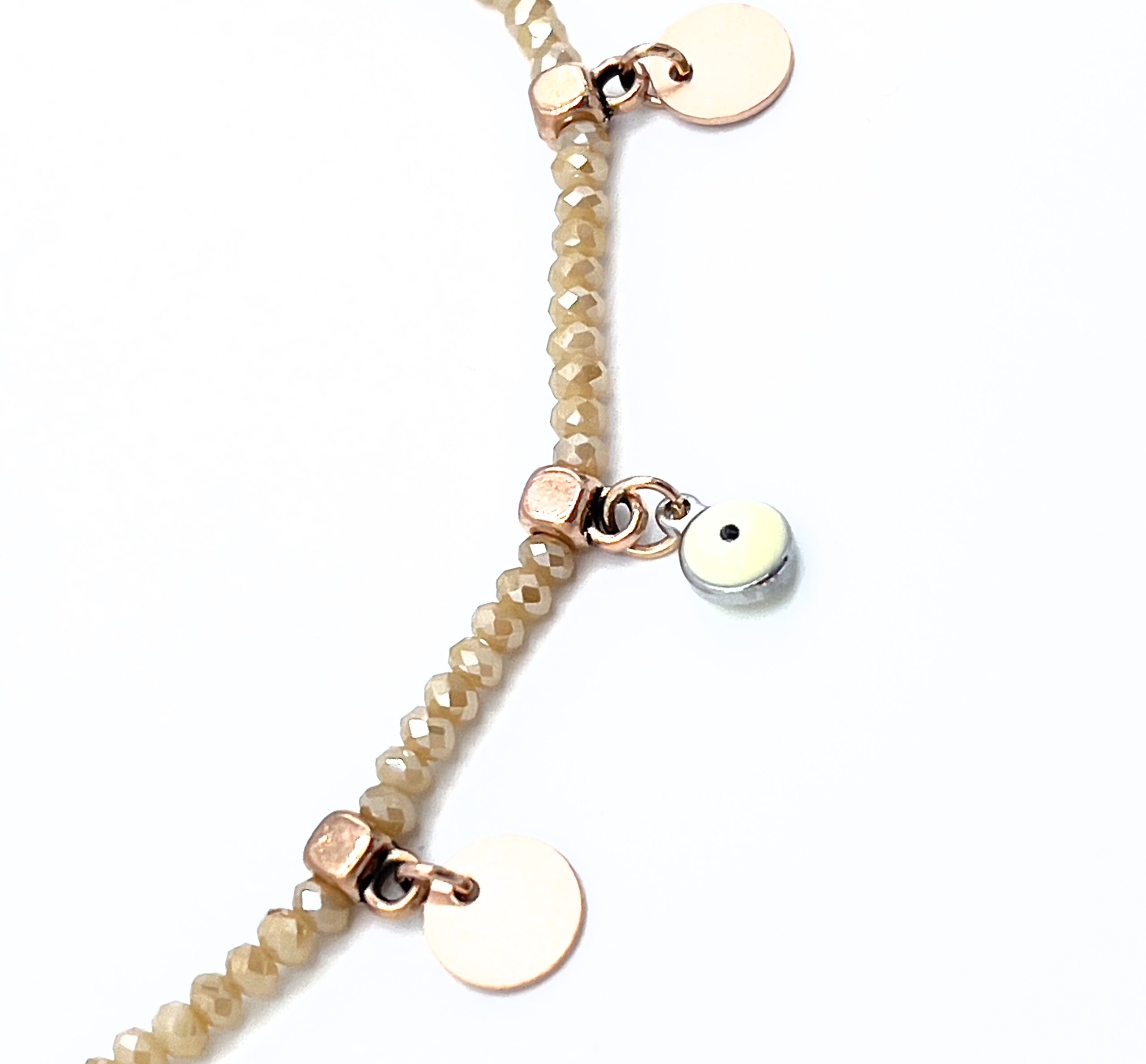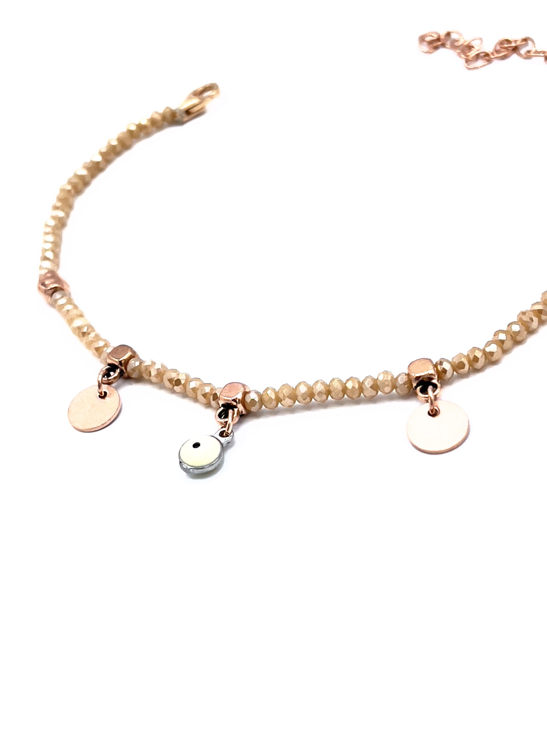 - Cavigliera realizzata con corallini, charm monetina, strass e occhio in smalto !