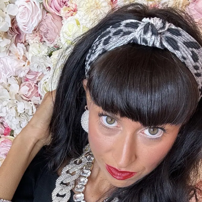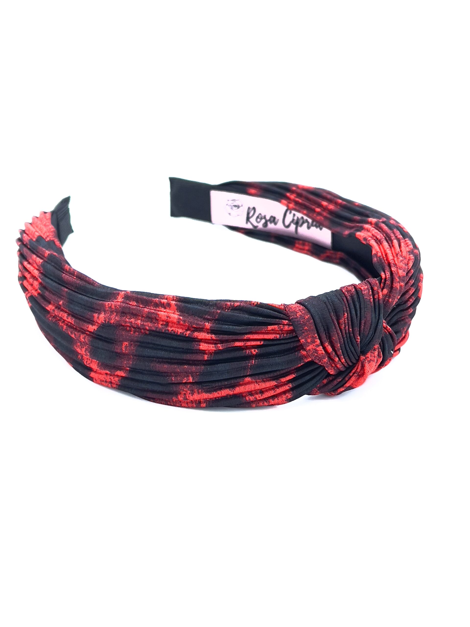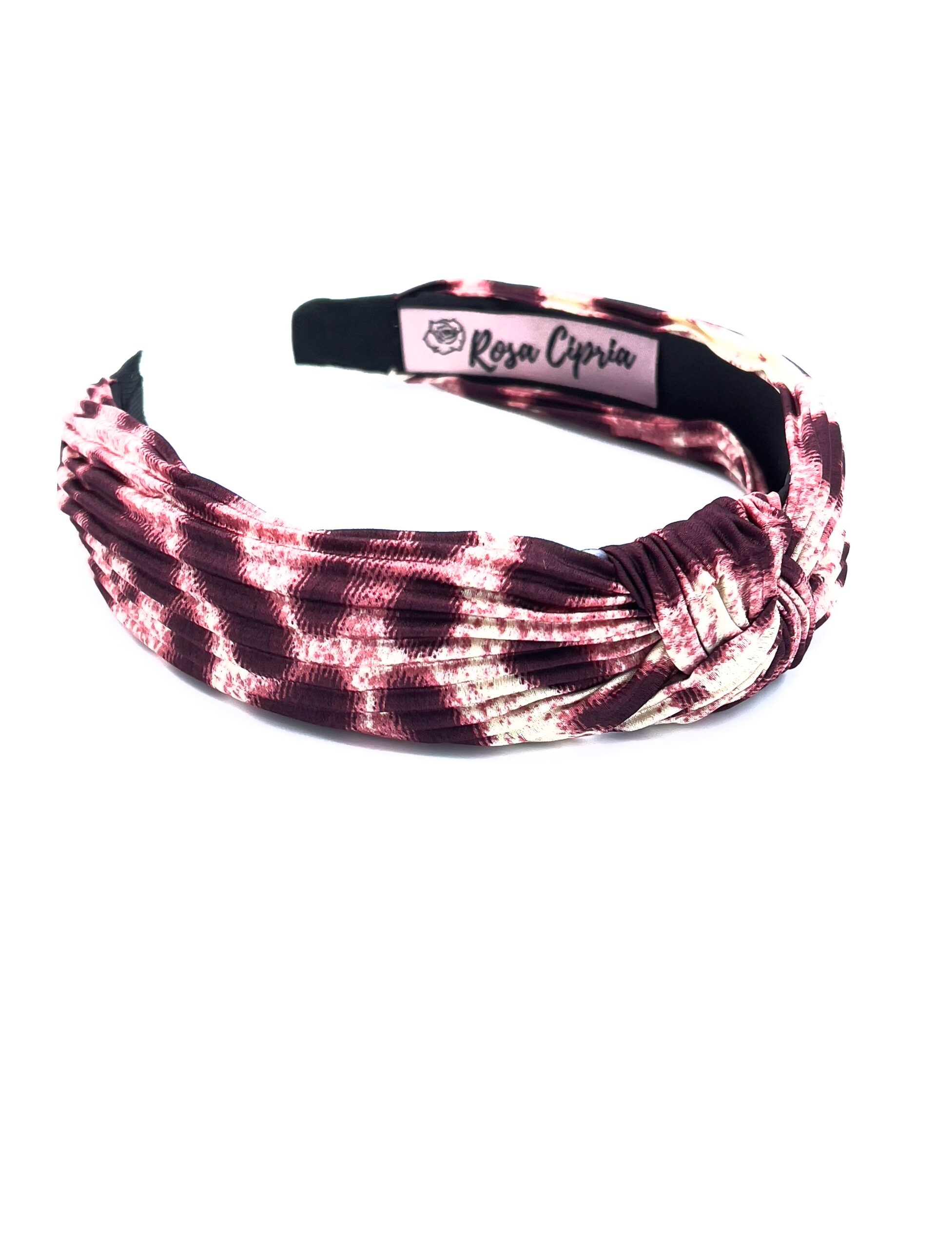 Cerchietto leopardato in raso micro righe con nodo centrale, di estremo comfort e disponibile in vari colori.