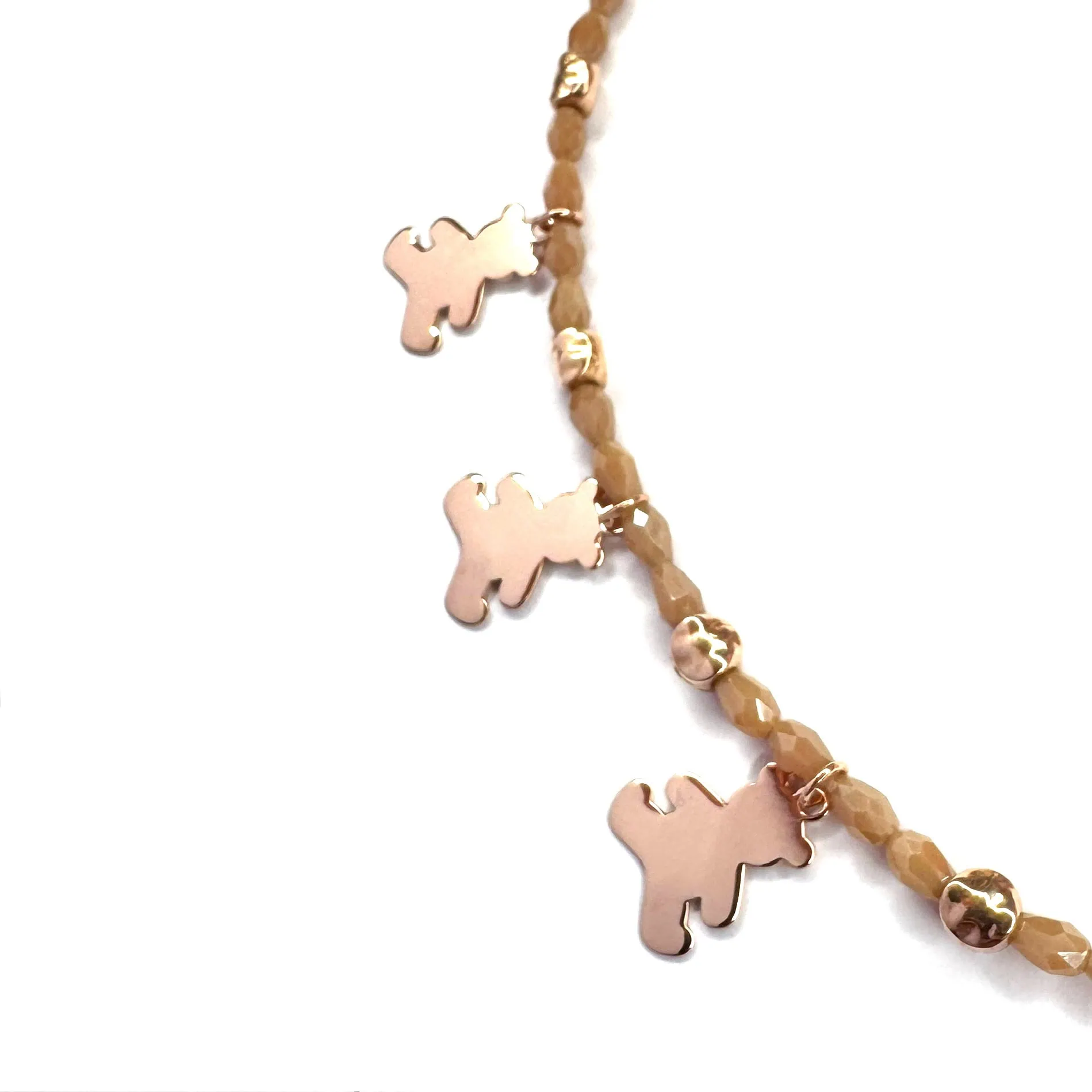 Charm orsetto girocollo Teddy Lover realizzato con corallini romboidi in vetro cristallo color avorio, intervallato da pepite in acciaio oro rosa e 5 charms a forma di orsetto in acciaio placcato oro rosa.