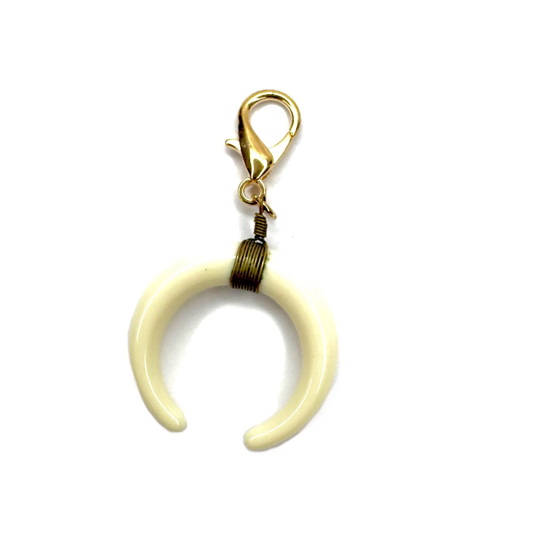 Ciondolo in pietra avorio con dettaglio centrale di strass con attaccatura e moschettone in acciaio placcato oro.