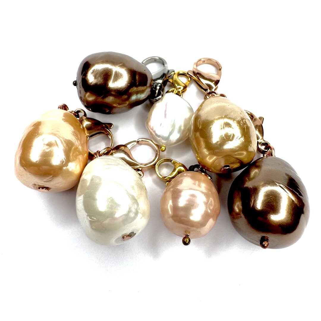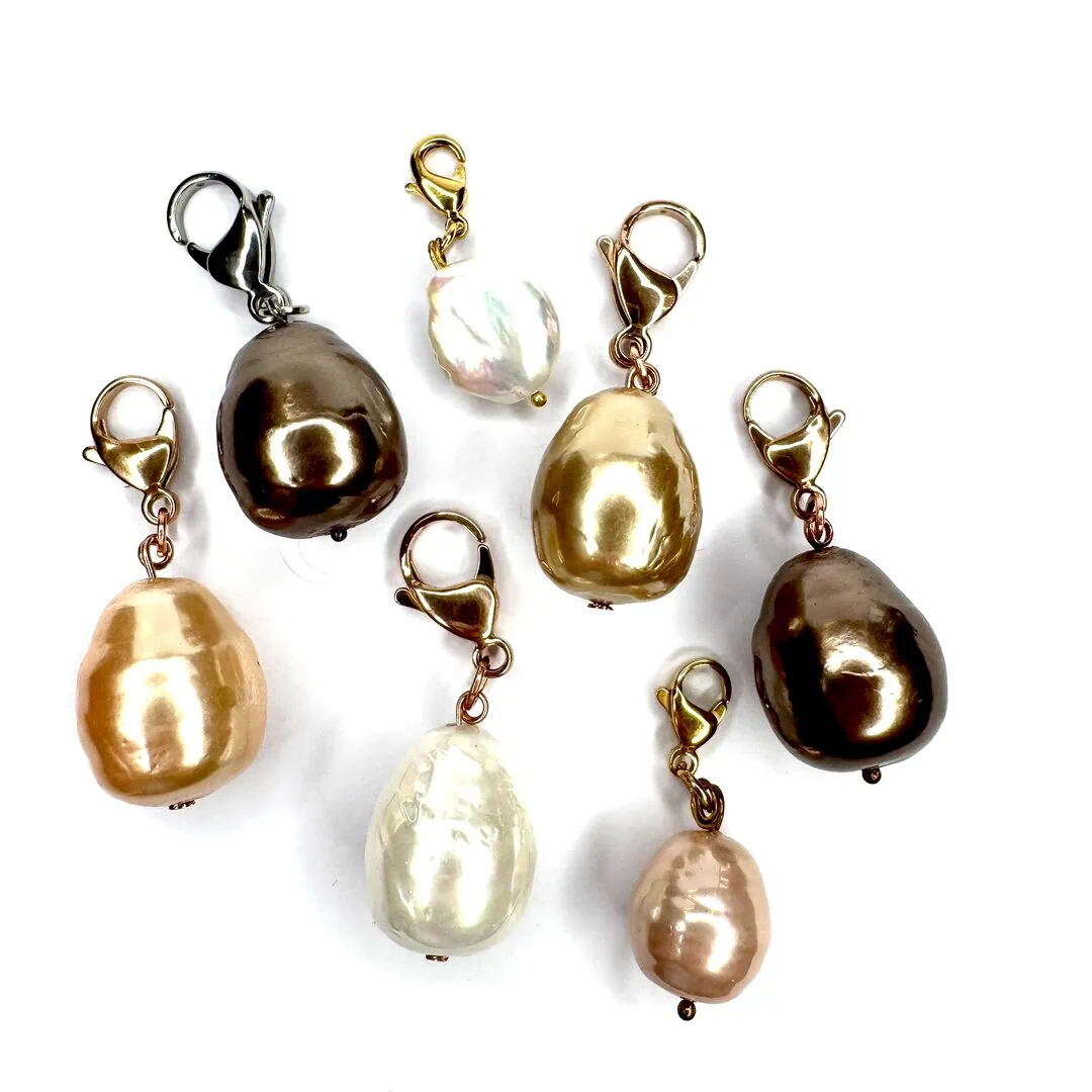 Ciondolo in perla naturale con forma irregolare a goccia in vari colori con attaccatura e moschettone in acciaio placcato oro.