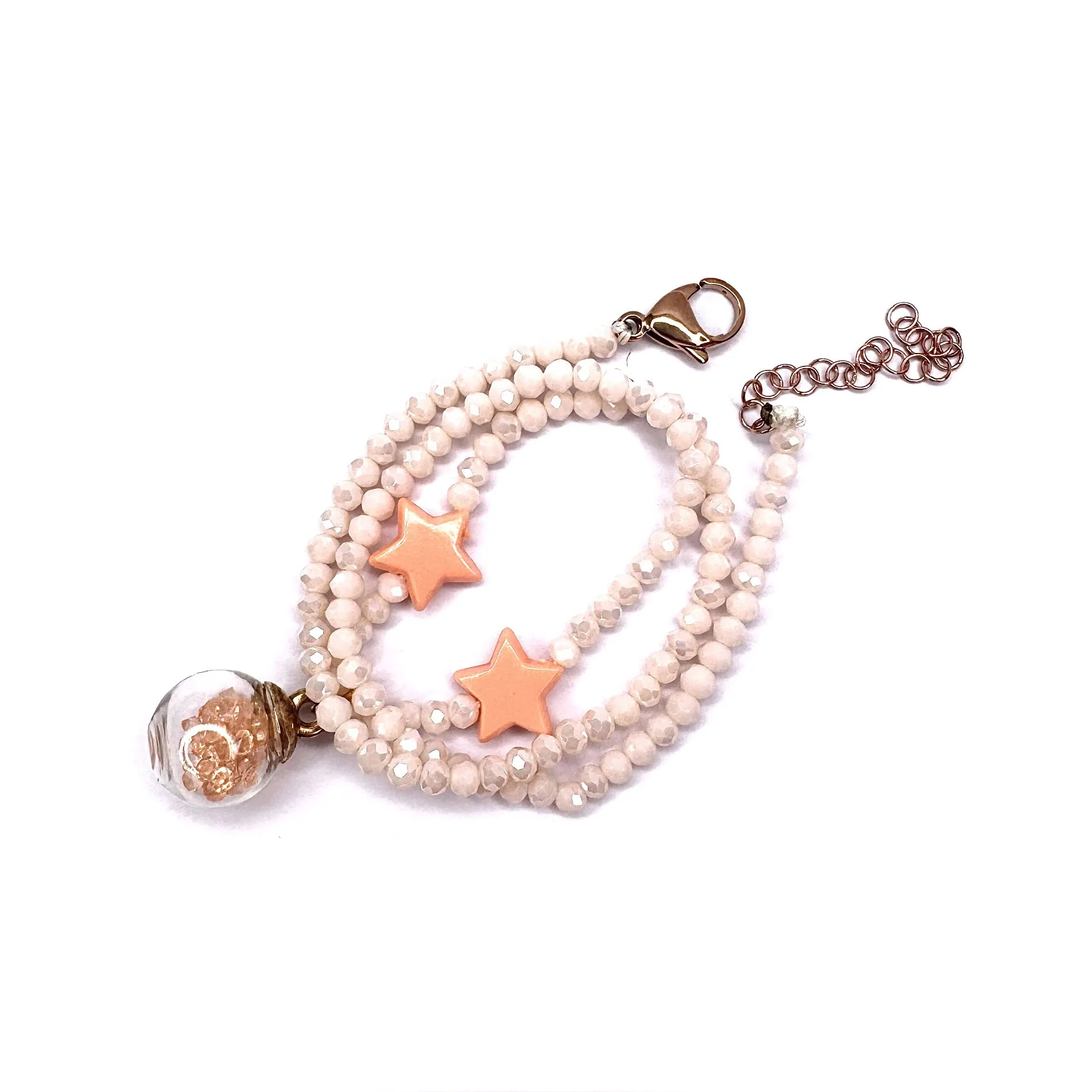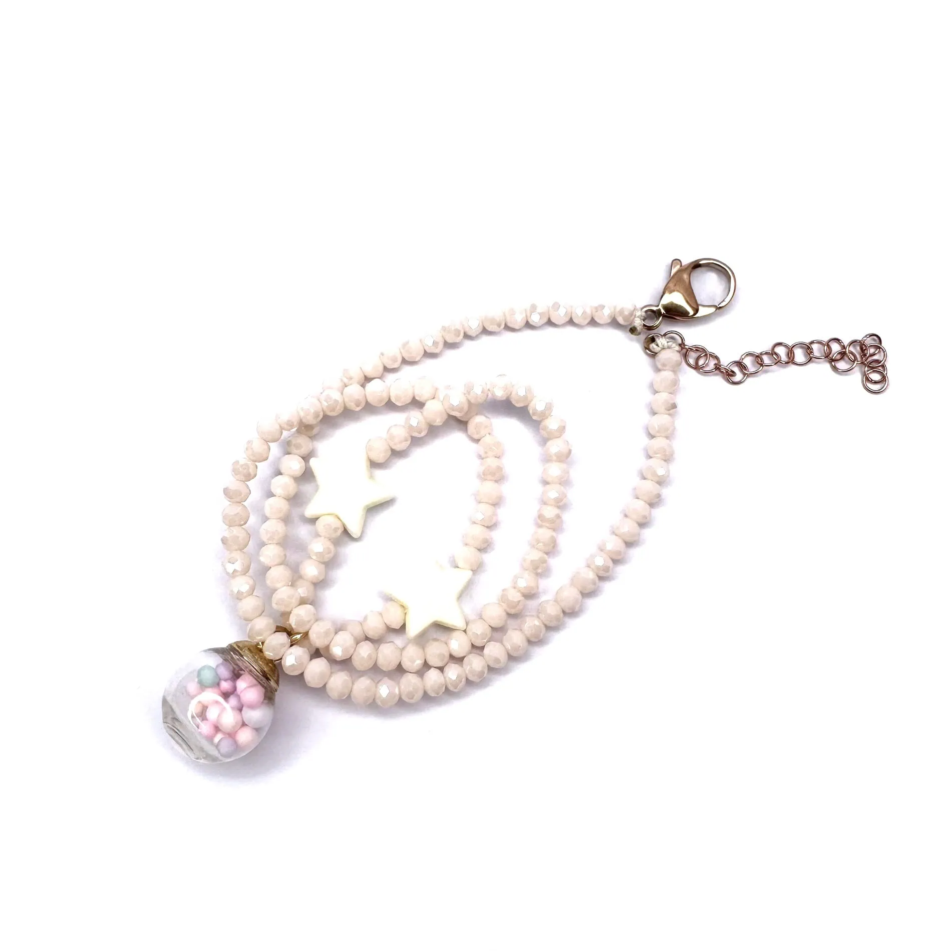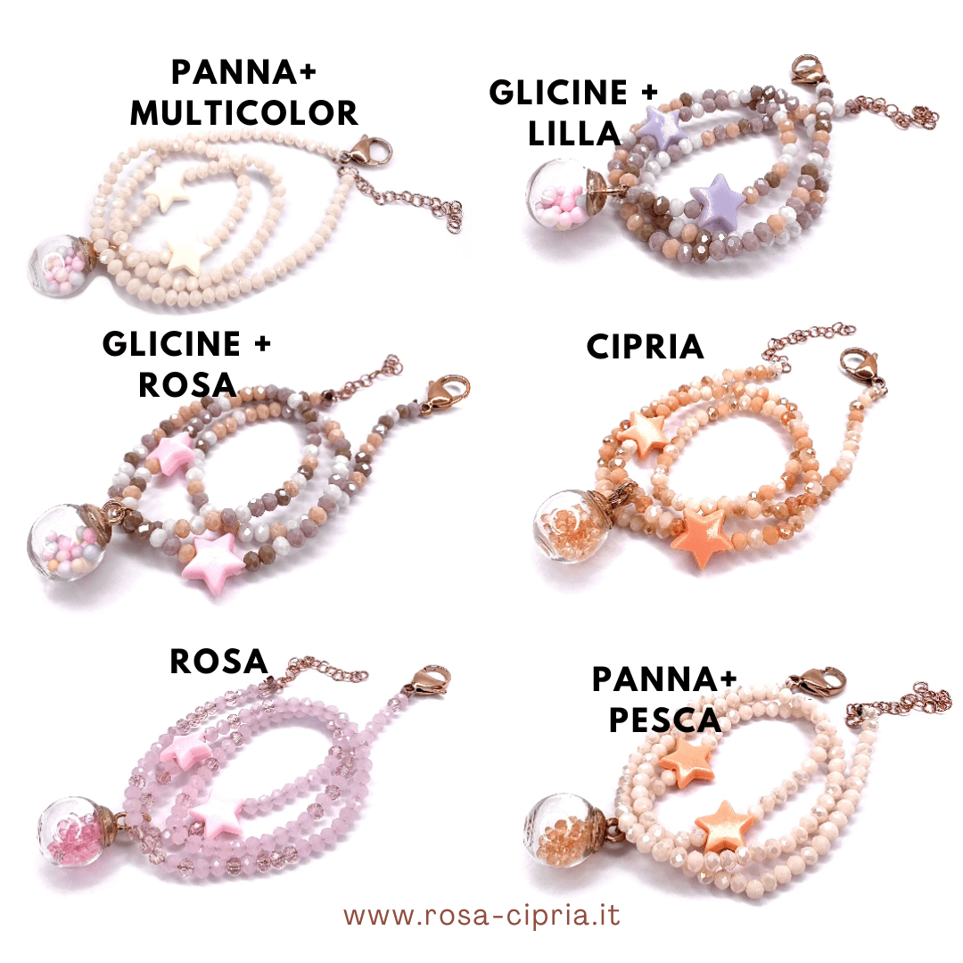 Il charm centrale è costituito da una vera e propria bolla: una sfera al cui interno ballano e brillano altre micro sfere o stelline in base al modelli, e ad eccezione del modello total black ai lati ci sono due divertentissime stelle in resina.