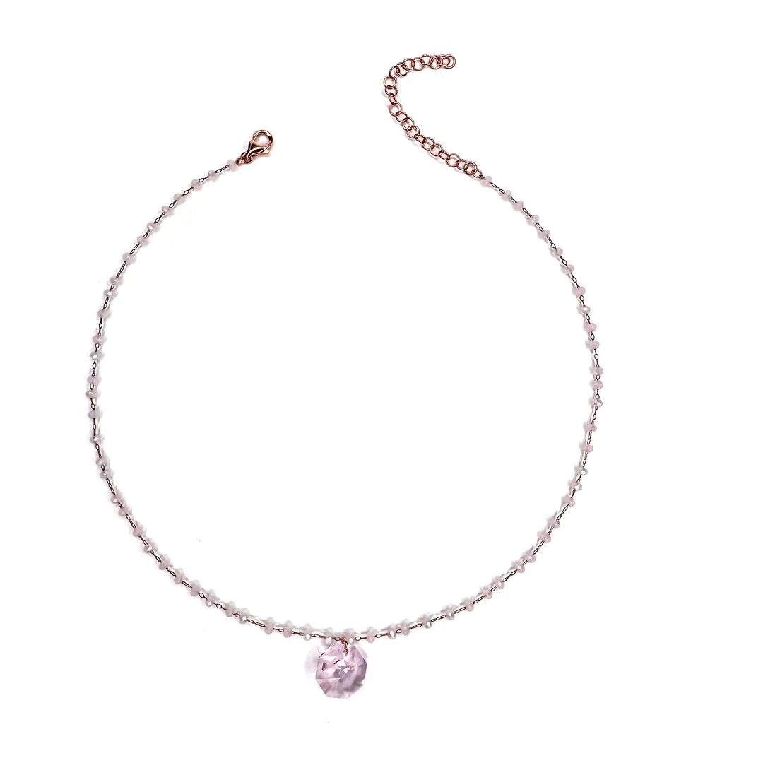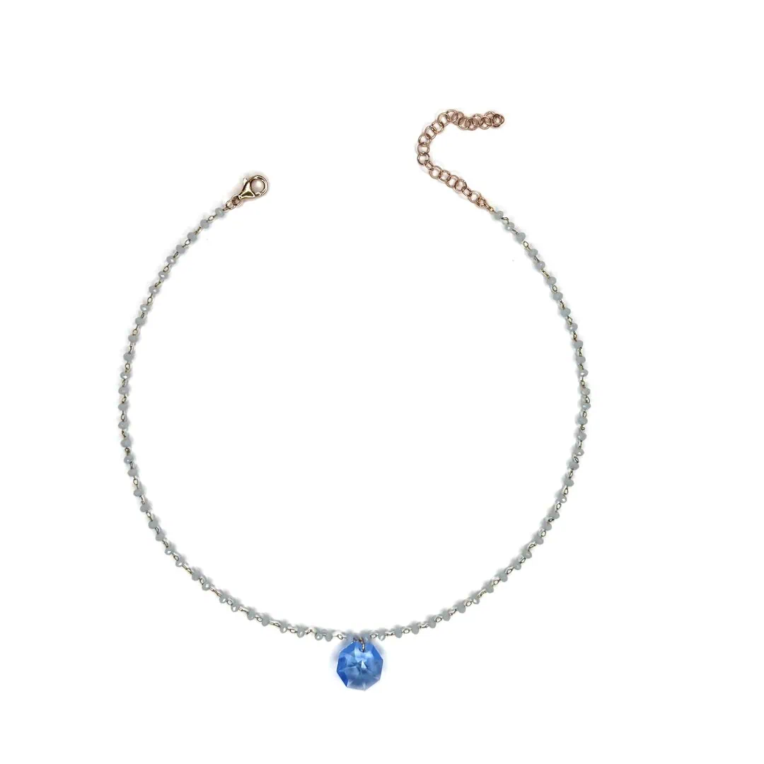 Collana girocollo realizzata artigianalmente con rosario di grani in vetro cristallo e charm in vetro cristallo ottagonale luminosissimo.