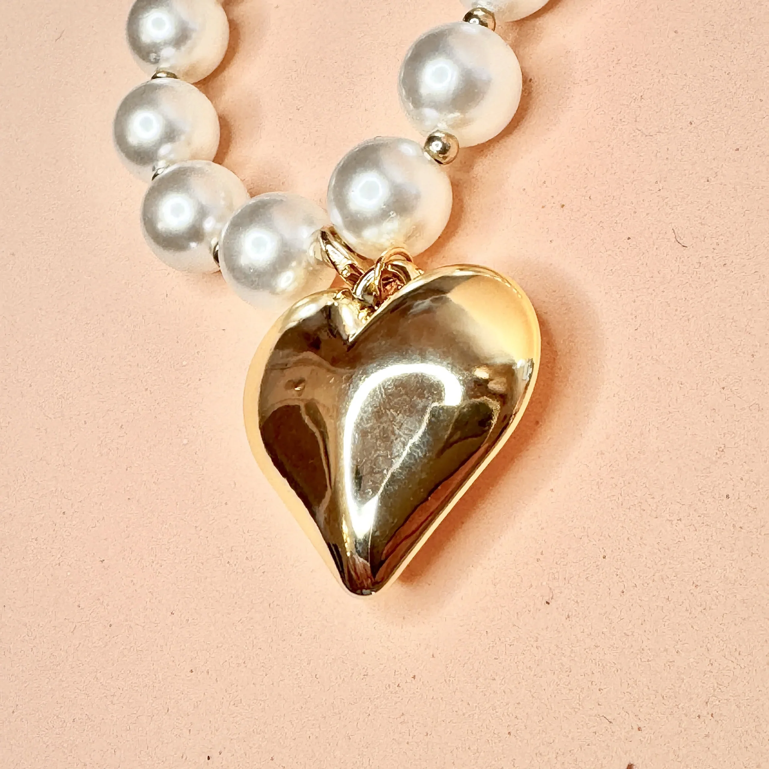 Collana con cuore oro di perle sintetiche, il cuore bombato è rimovibile, perciò può essere indossata sia con che senza ciondolo centrale. Perfetta contemporaneamente per un look più basic con l’aggiunta del cuore o per completare outfit più elaborati come girocollo di perle.