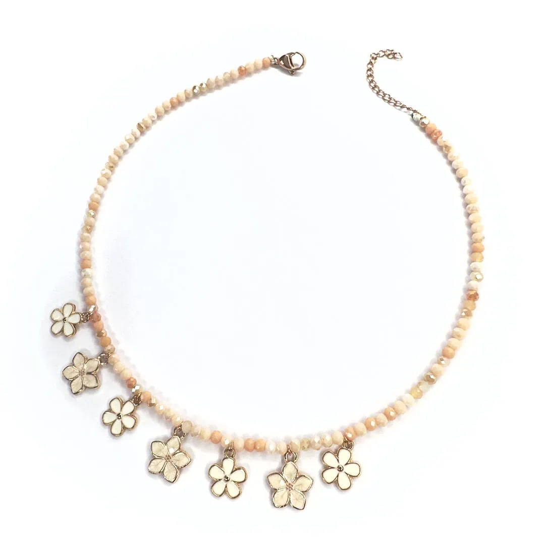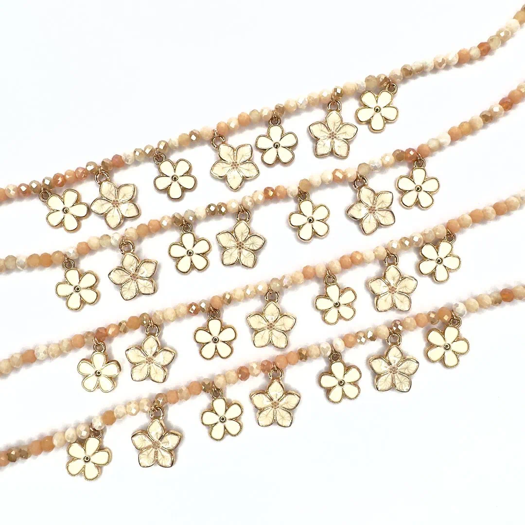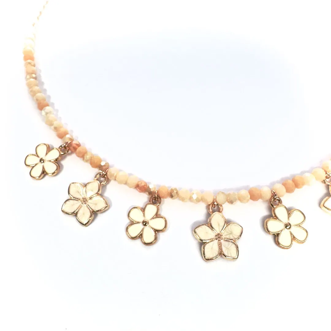 Realizzato con corallini di colore neutro mixed e fiori smaltati in 3d a charm.