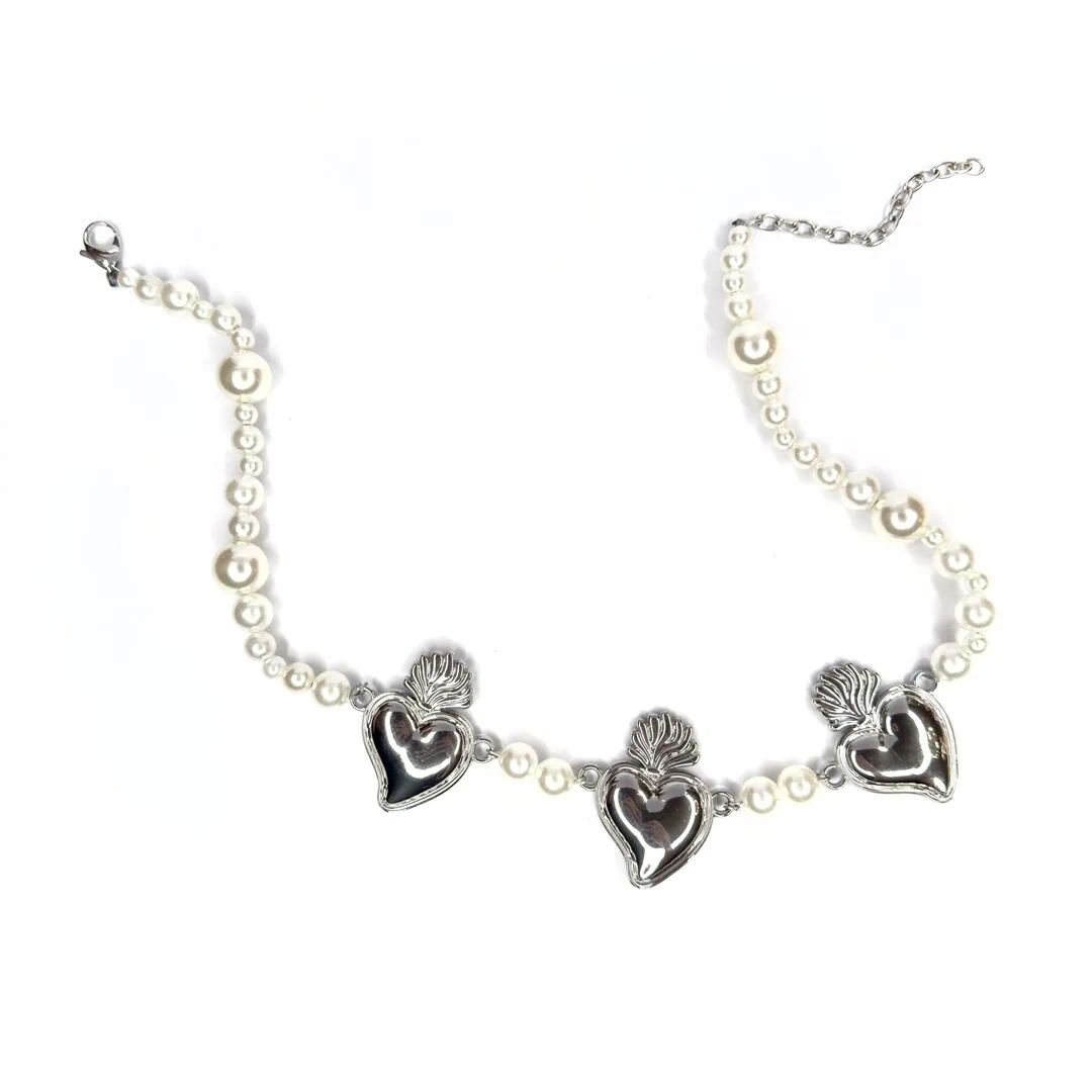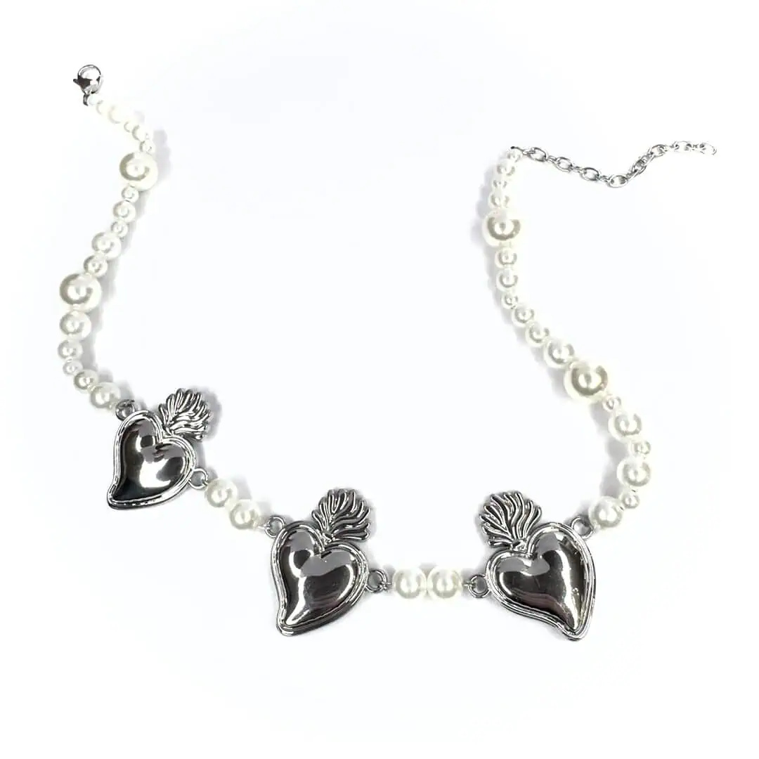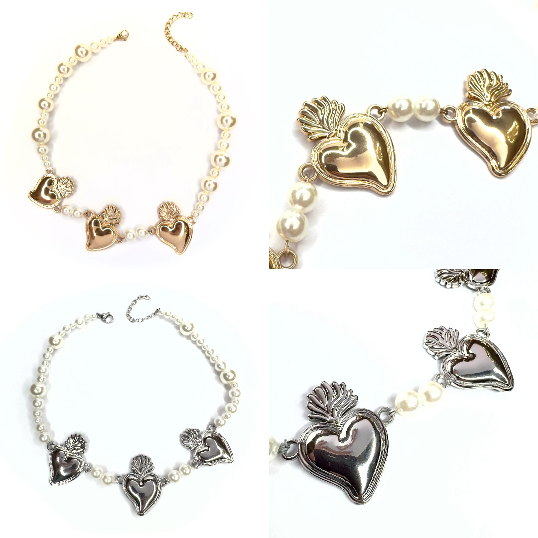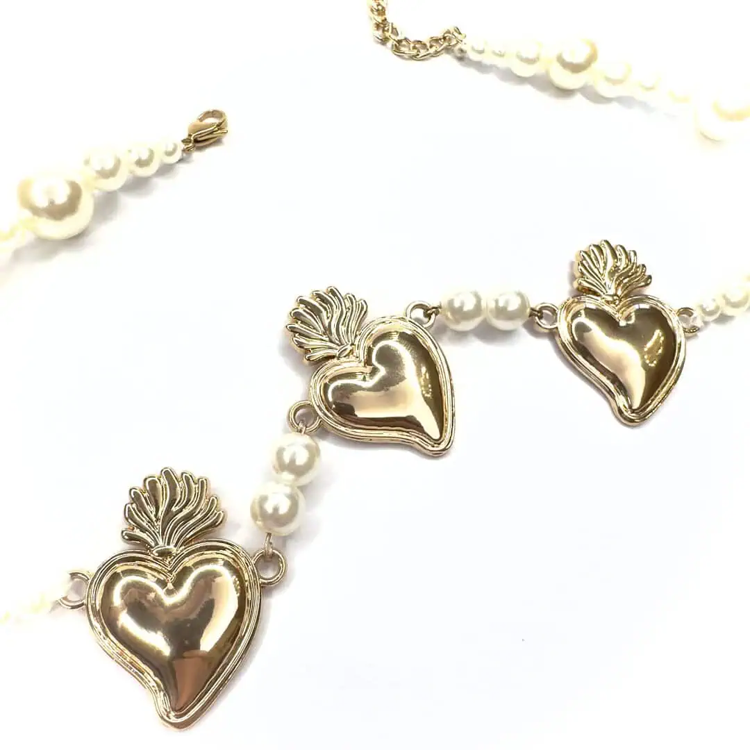Questa collana, dalla vestibilità medio/corta (perfetta per valorizzare il décolleté o per un look multi-livello), alterna tre splendidi Cuori Sacri a una cascata di perle di varie dimensioni. È quel tocco chic-rock e “romanticamente dark” che trasforma anche una semplice t-shirt bianca in un outfit da urlo.