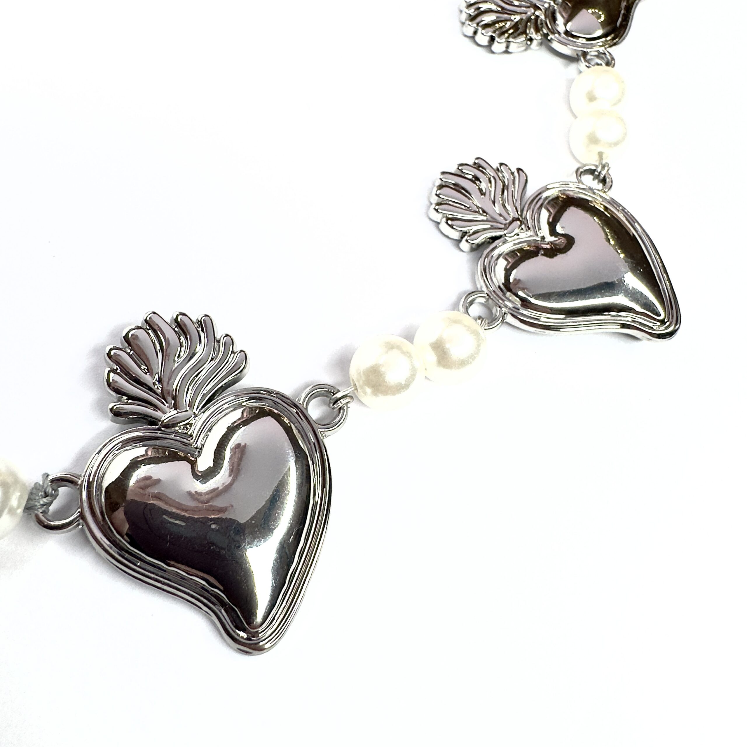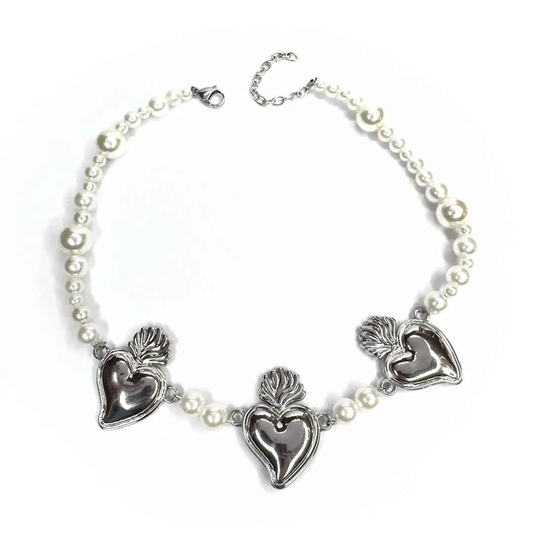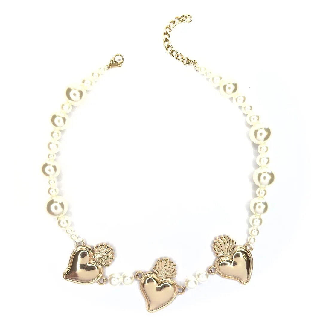 Questa collana, dalla vestibilità medio/corta (perfetta per valorizzare il décolleté o per un look multi-livello), alterna tre splendidi Cuori Sacri a una cascata di perle di varie dimensioni. È quel tocco chic-rock e “romanticamente dark” che trasforma anche una semplice t-shirt bianca in un outfit da urlo.
