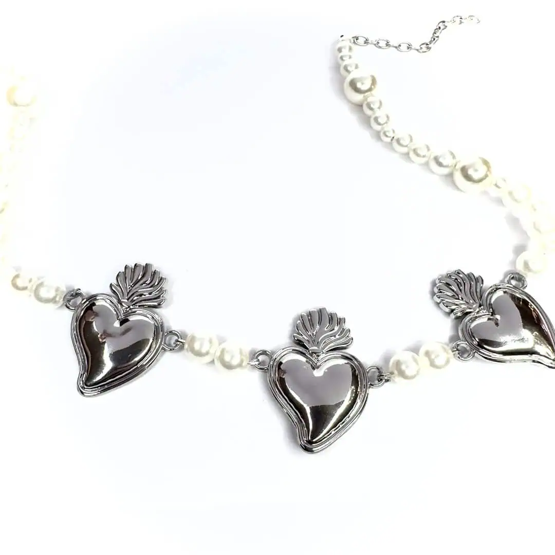 Questa collana, dalla vestibilità medio/corta (perfetta per valorizzare il décolleté o per un look multi-livello), alterna tre splendidi Cuori Sacri a una cascata di perle di varie dimensioni. È quel tocco chic-rock e “romanticamente dark” che trasforma anche una semplice t-shirt bianca in un outfit da urlo.