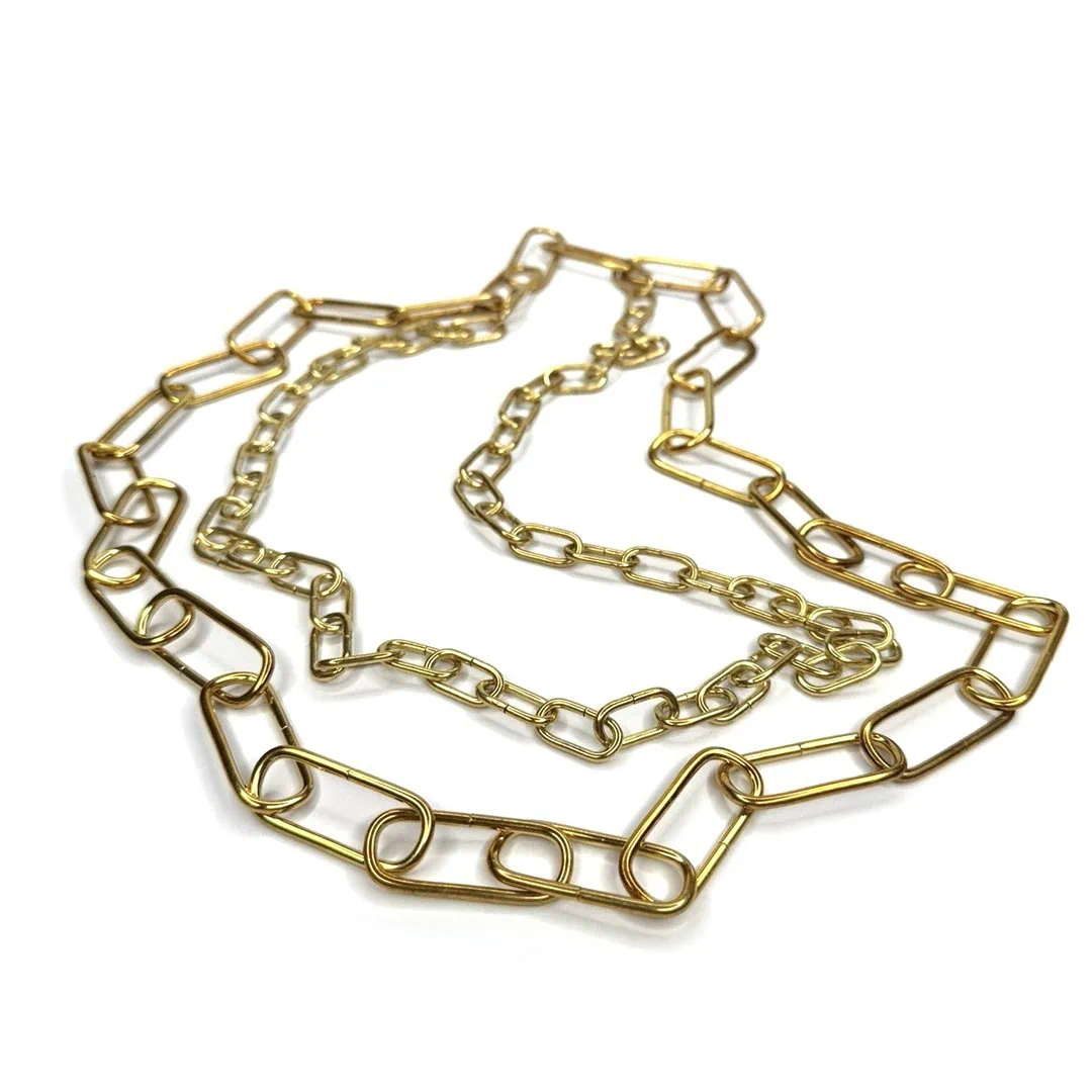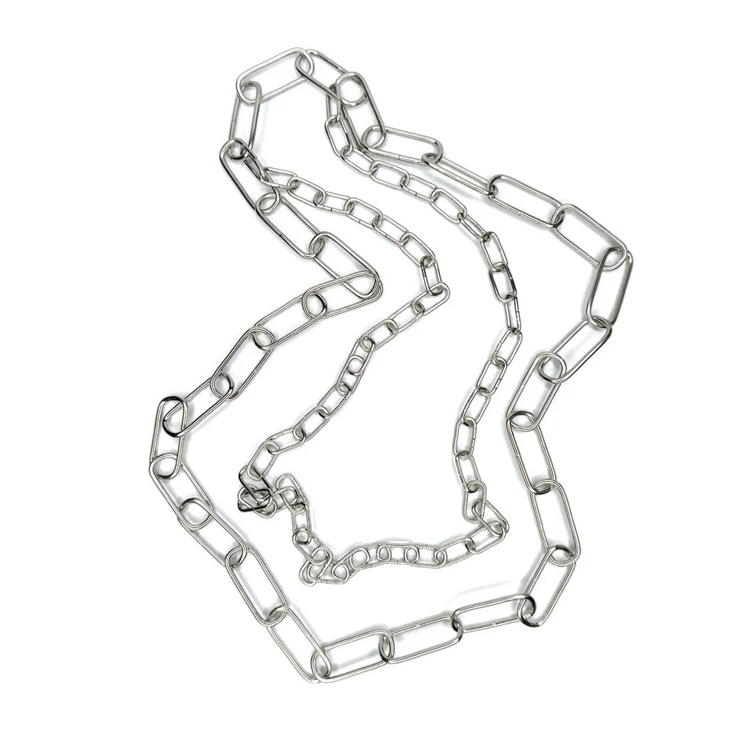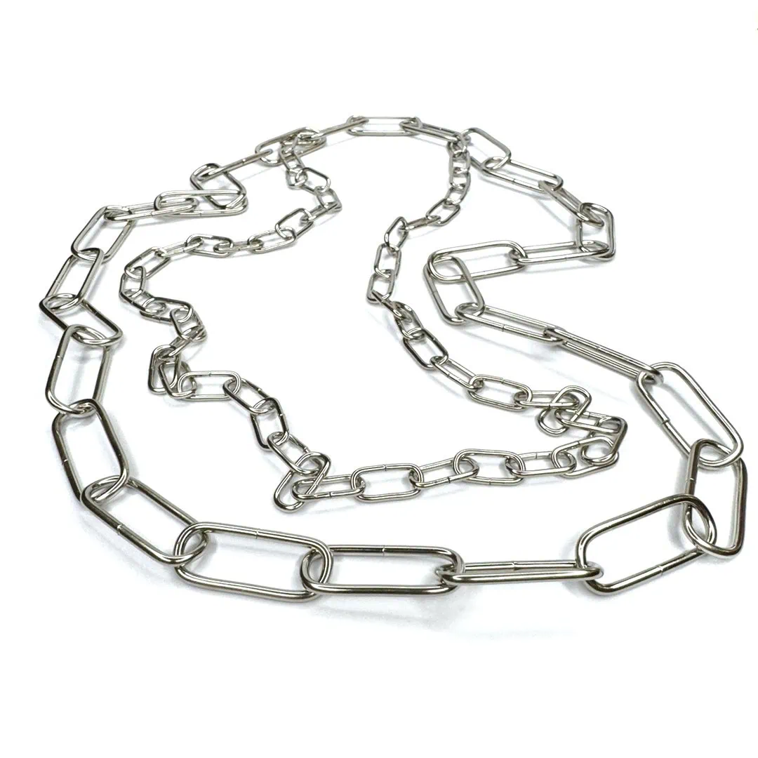 Esprimi la tua eleganza rock con questa collana donna lunga realizzata interamente a mano. La grintosa maglia metallica si allunga in una doppia catena (una più spessa, una più sottile) per un look a strati di grande impatto.