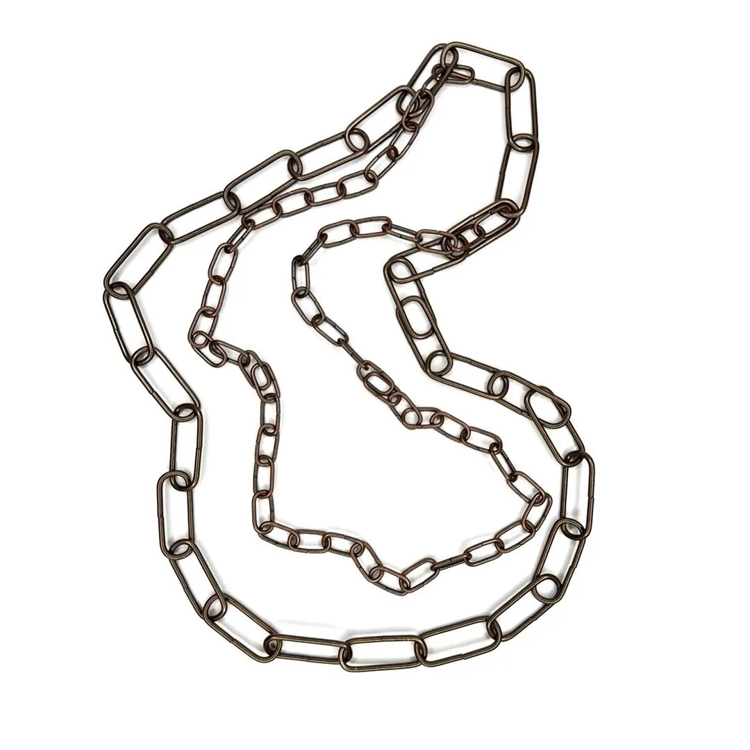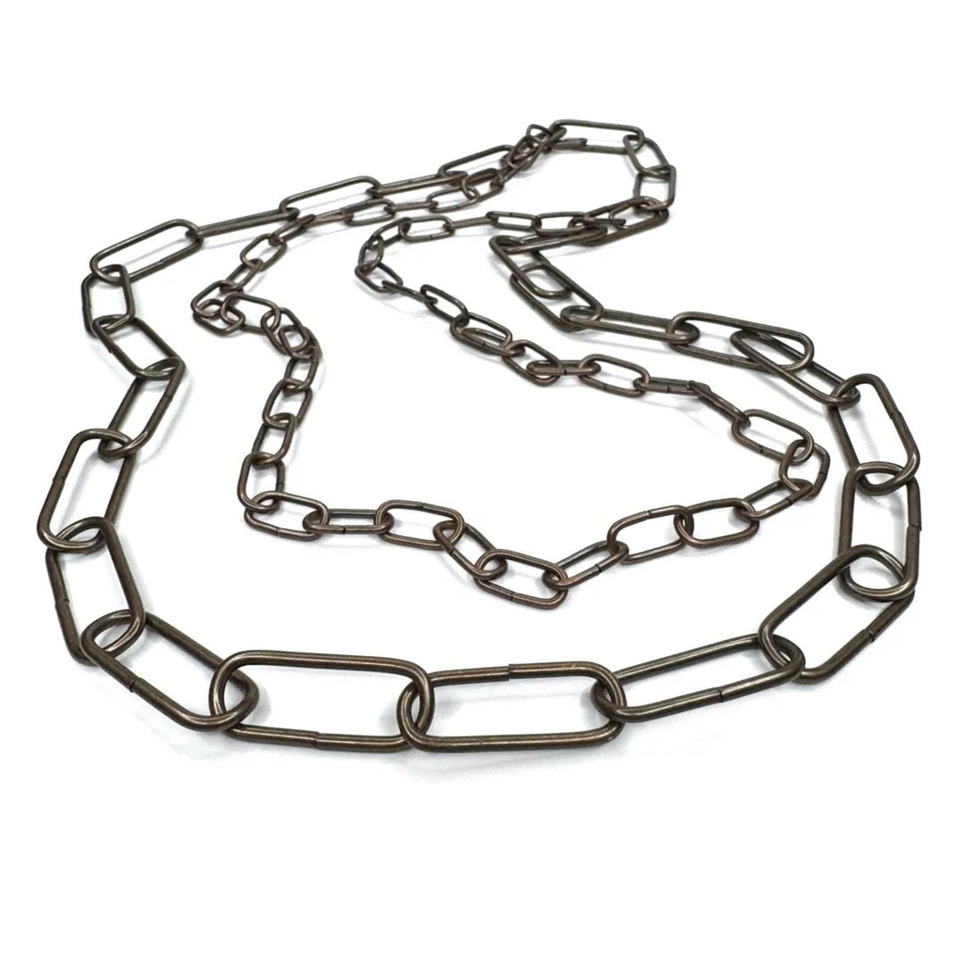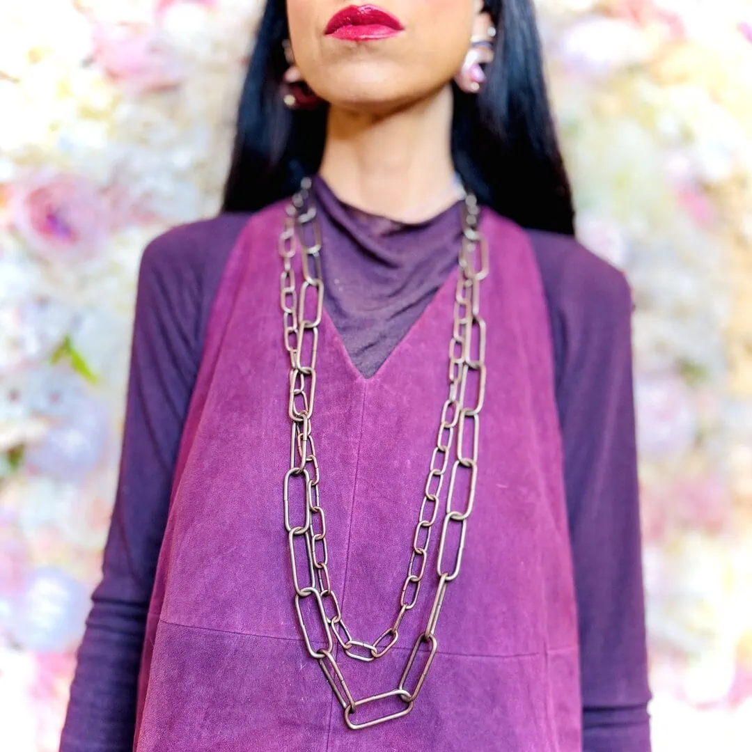 La collana donna lunga che stavi cercando: realizzata a mano, presenta una moderna maglia metallica allungata con un elegante effetto layering dato dalla doppia catena. Questa collana senza chiusura è l’accessorio perfetto per un look sofisticato e veloce. Disponibile in galvanica color Cioccolato, Argento e Dorata.