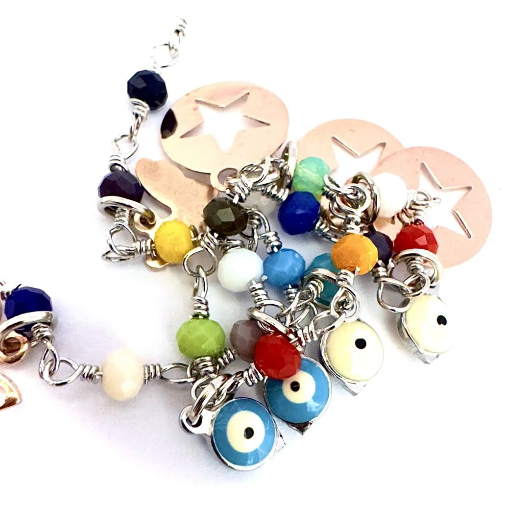 Collana occhio portafortuna con catena rosario multicolor in tema realizzata a mano.