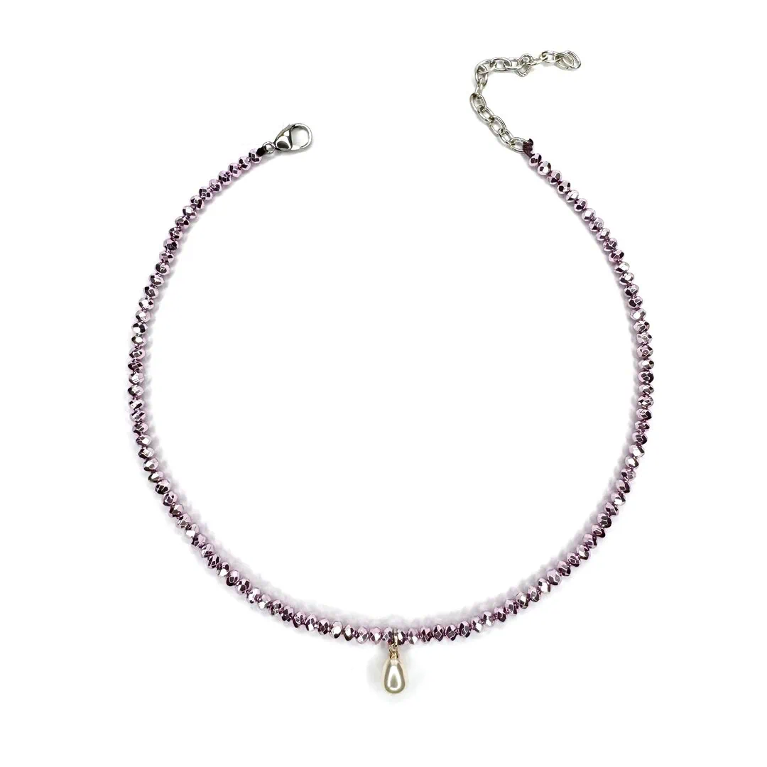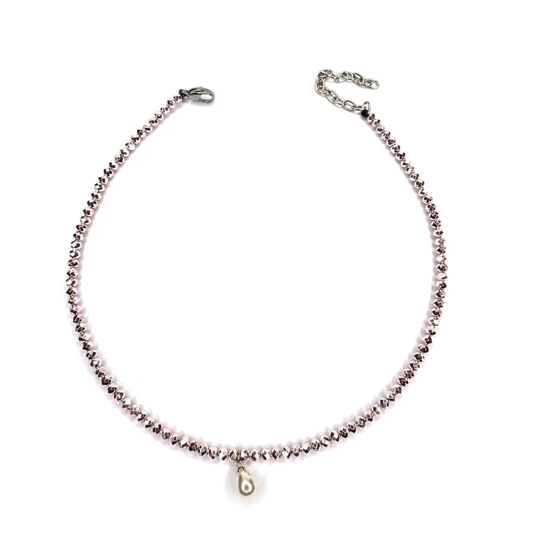 Collana perla colorata cangiante artigianale italiana, collana corallini di vetro cangianti, collana rosa cipria perla a goccia, gioielli artigianali fatti in Italia, collana regolabile tendenza.