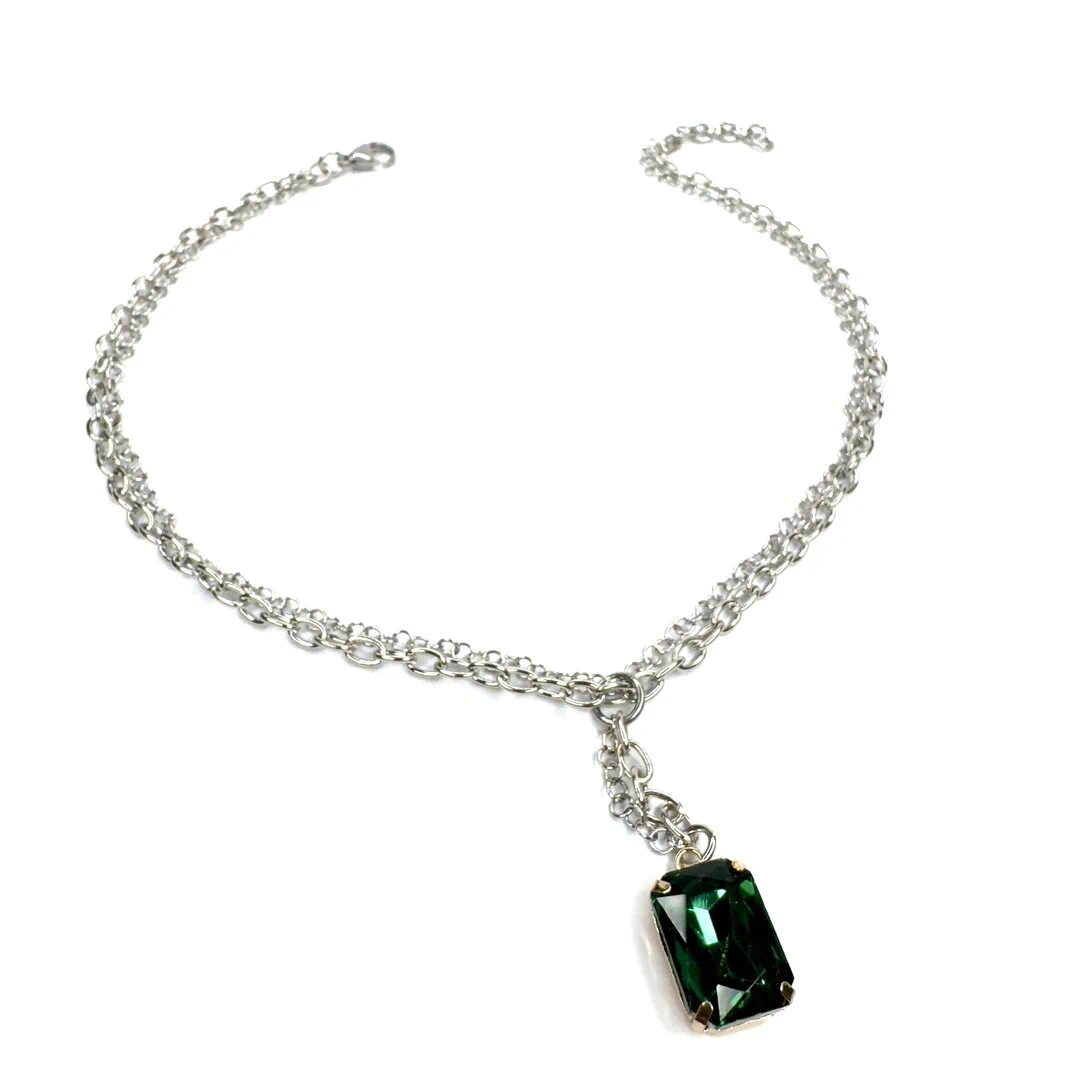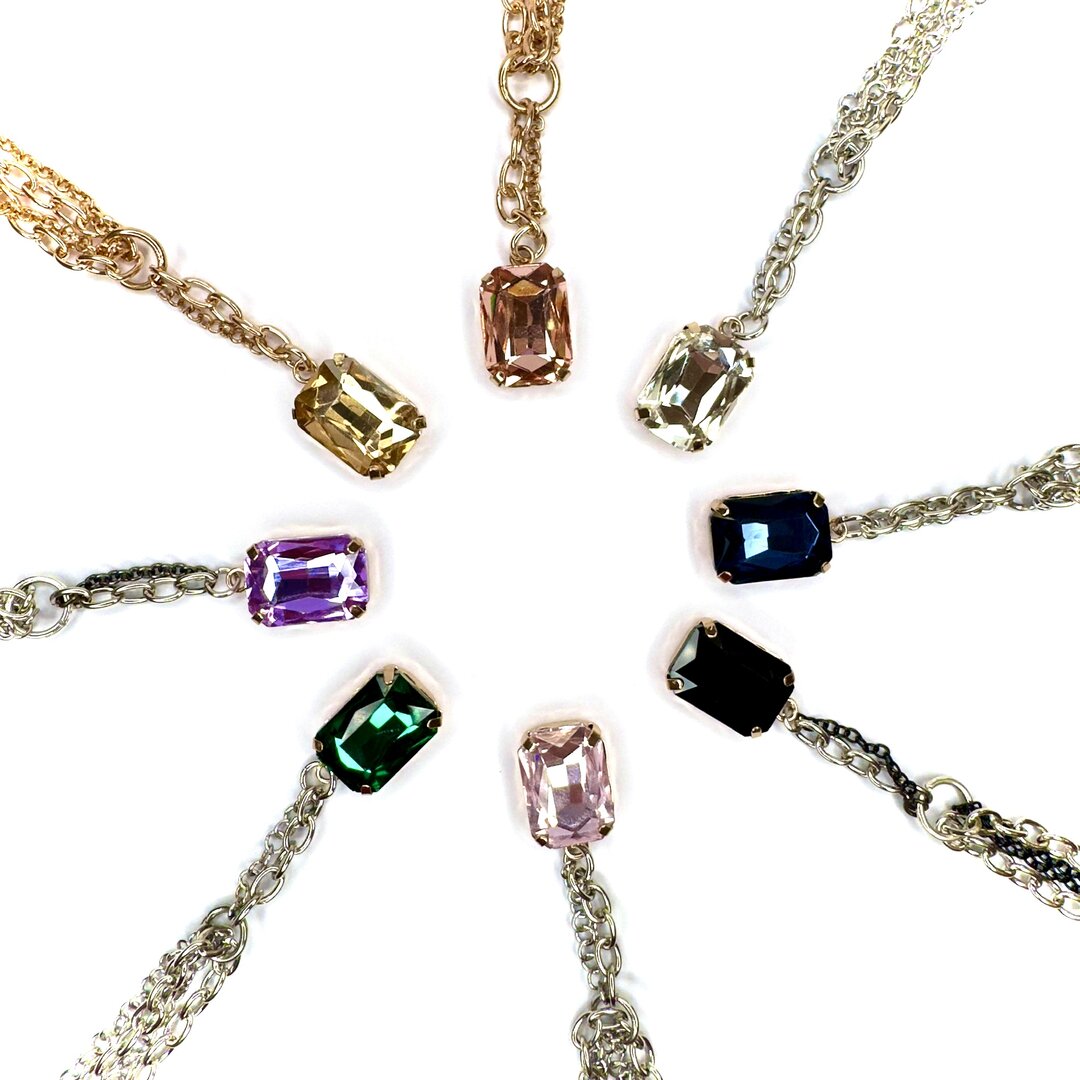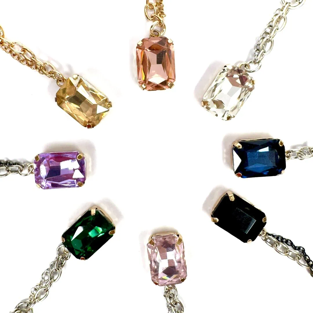 Collana pietra dura a girocollo realizzato con catena in acciaio con maglia allungata e charm pietra rettangolare montata su castone in vetro cristallo, in varie combinazioni metallo-colore.