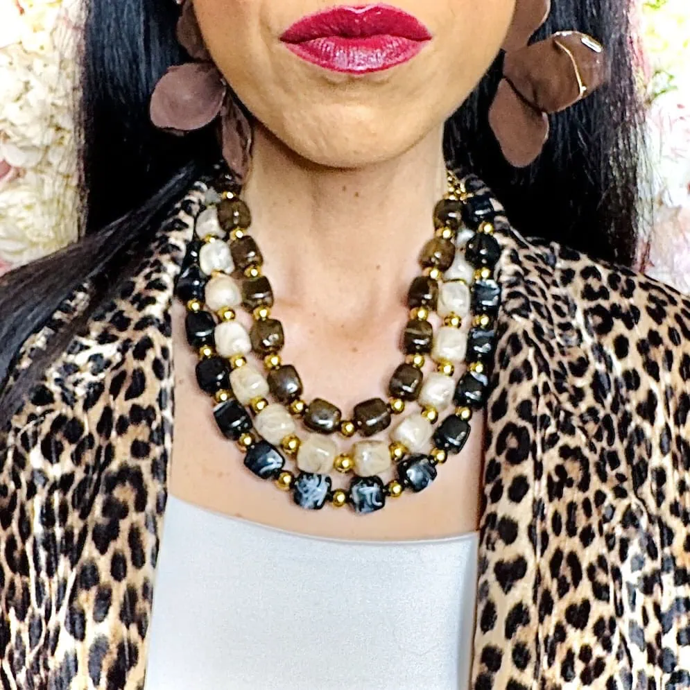 L’estetica della collezione Iside raggiunge la sua massima espressione nella nuova collana pietre dure, un gioiello che gioca con le simmetrie e i contrasti. Protagonista assoluta è l’Agata, declinata nelle iconiche sfumature cioccolato, nero e avorio, selezionata nella sua particolare forma cubica per un design moderno e architettonico.