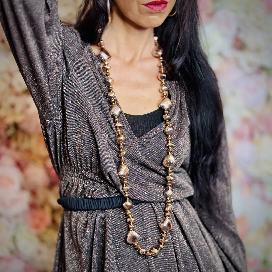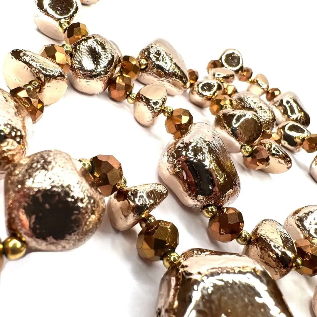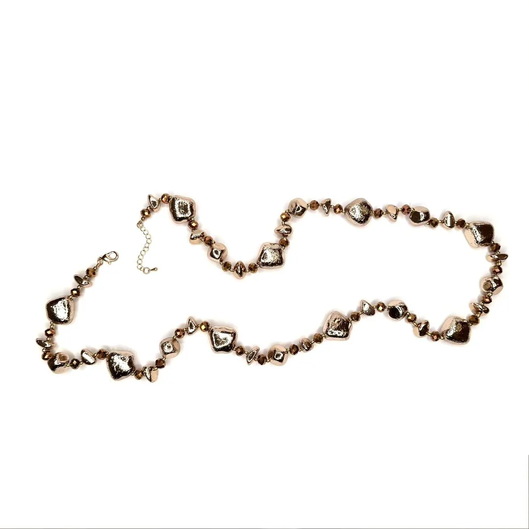 Collana pietre rosa bronzato lunga con beads a forma di pepita irregolare, e corallini in vetro cristallo bronzato chiedibile e regolabile tramite moschettone.