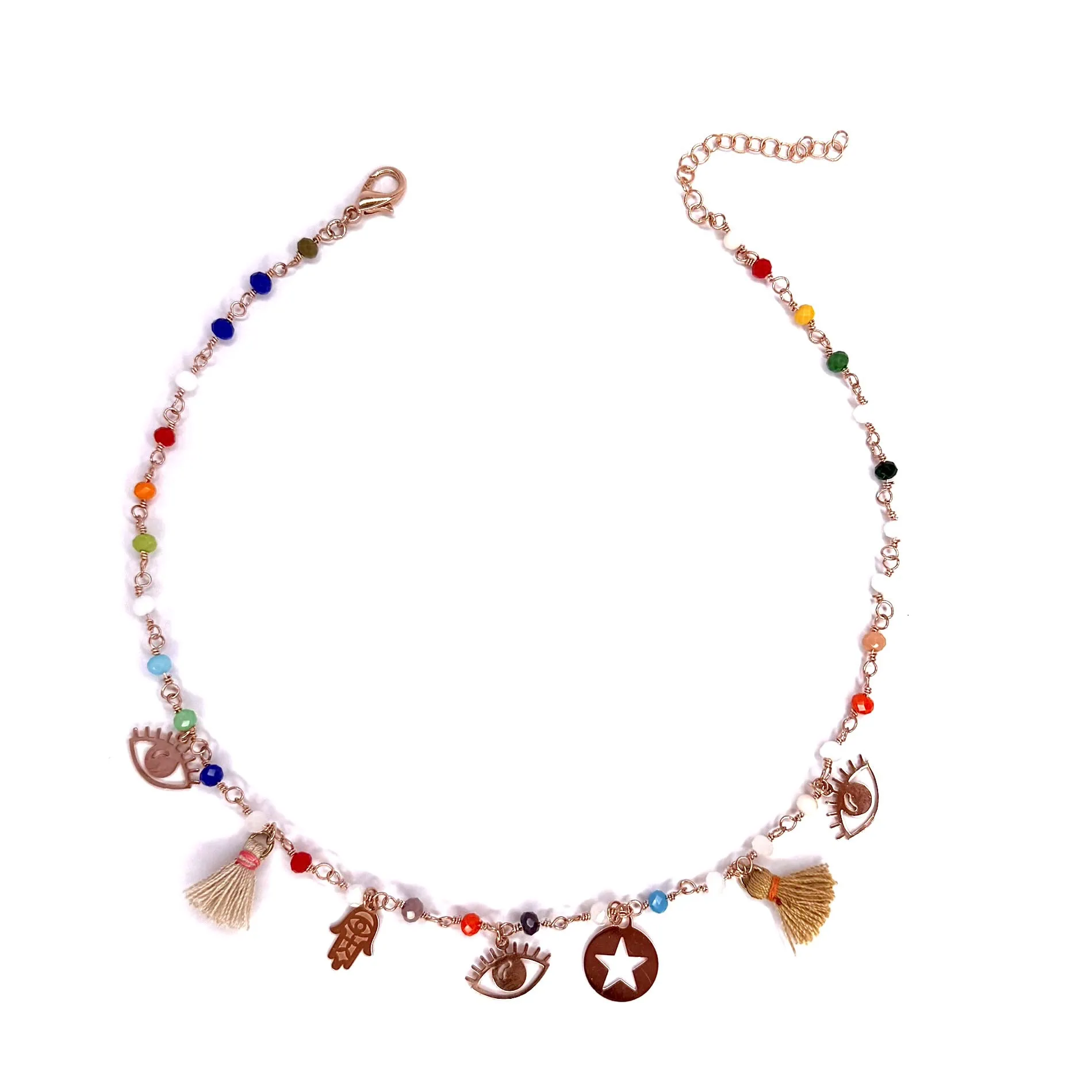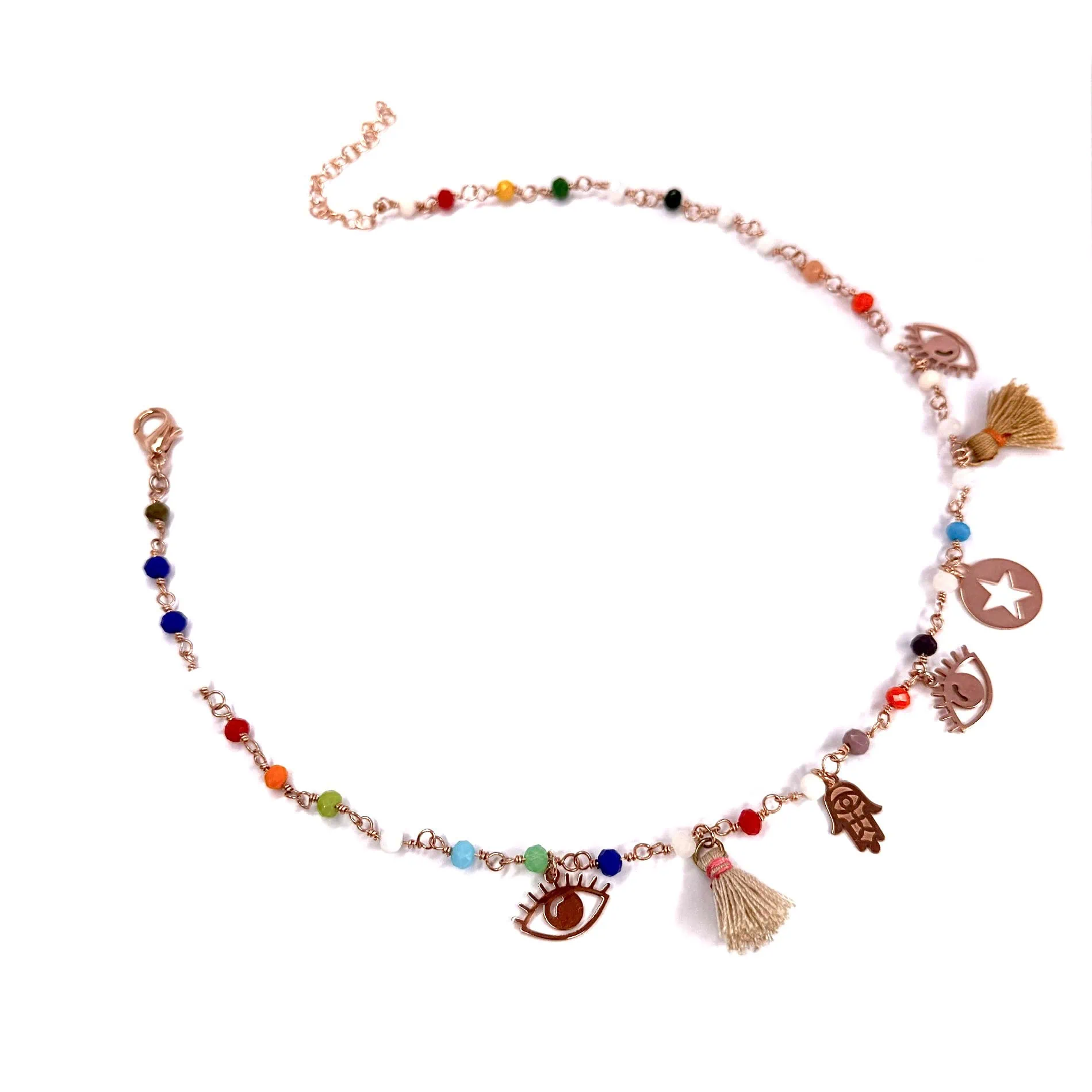 Base realizzata a rosario multicolor su base acciaio oro rosa con corallini in vetro cristallo.