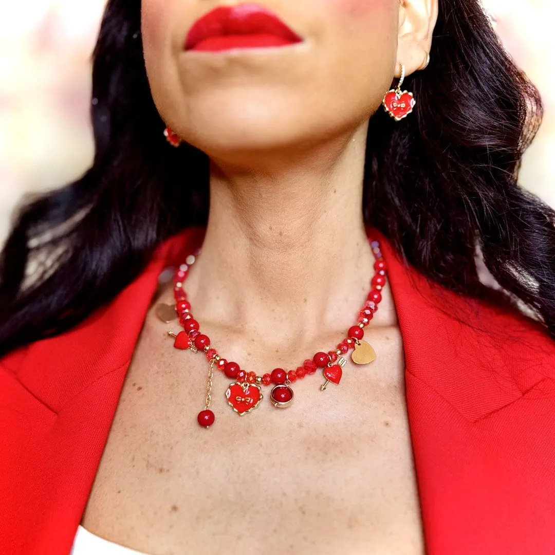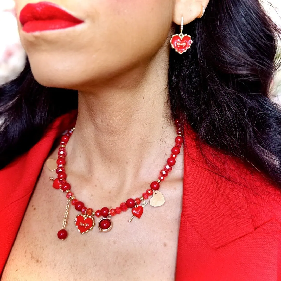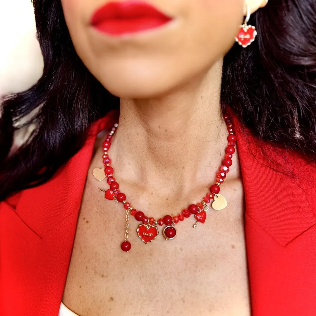 • GIFT BOX ROSSO: contiene un girocollo realizzato a mano con pietre in vetro cristallo e vari charms smaltati e non solo di lunghezza regolabile da 38cm a 43cm con orecchini con montatura a mini cerchietto con strass oro e charm cuore smaltato in rosso.
