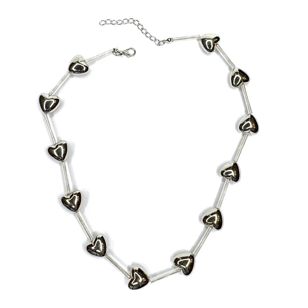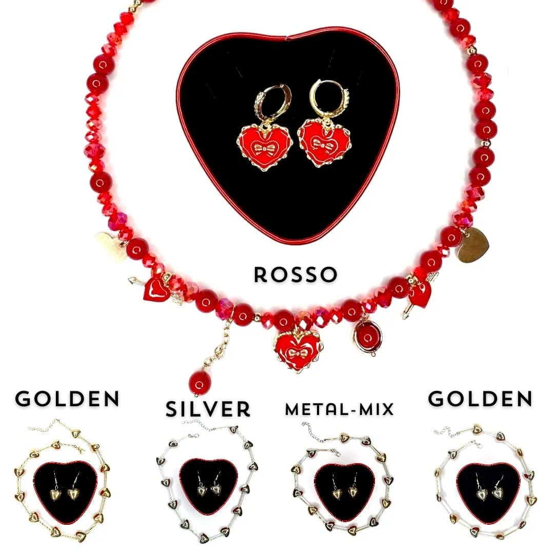 - GIFT BOX METAL MIX: contiene una collana con cuori 3d di lunghezza regolabile con moschettone da 44cm a 50cm ed orecchini con montatura ad amo con cuore 3d pendente di 1 cm x 1 cm, la collana in colorazione metal mix e gli orecchini in colorazione silver.