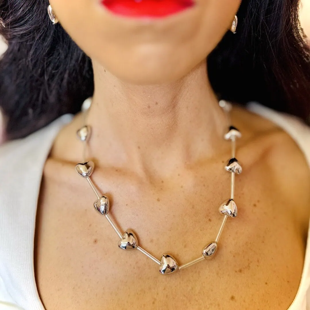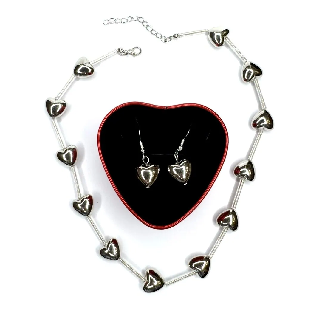 - GIFT BOX SILVER: contiene una collana con cuori 3d di lunghezza regolabile con moschettone da 44cm a 50cm ed orecchini con montatura ad amo con cuore 3d pendente di 1 cm x 1 cm, entrambe nella colorazione silver.