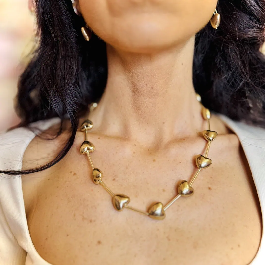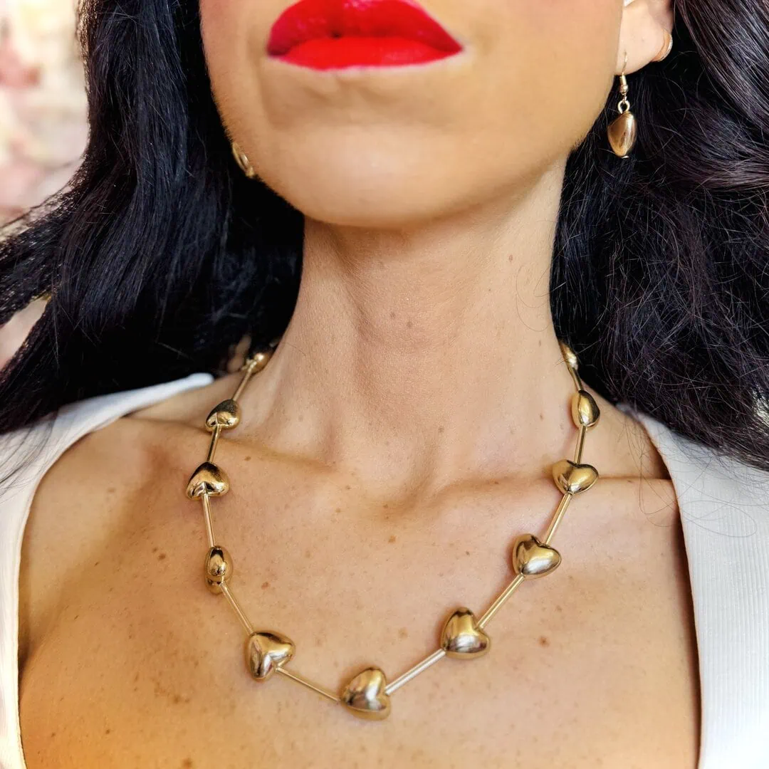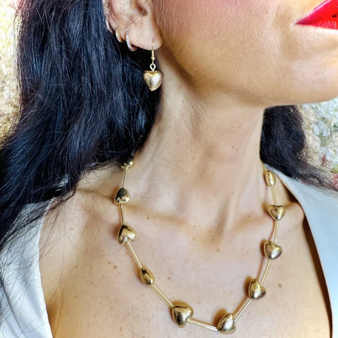 - GIFT BOX GOLD: contiene una collana con cuori 3d di lunghezza regolabile con moschettone da 44cm a 50cm ed orecchini con montatura ad amo con cuore 3d pendente di 1 cm x 1 cm, entrambe nella colorazione gold.