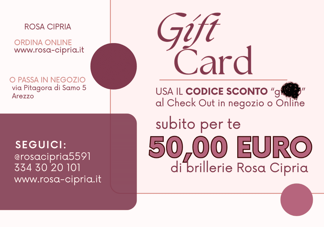 Sei alla ricerca del regalo ideale ma non sai cosa scegliere? Con la Gift Card del nostro shop online, regali la libertà di scegliere tra la nostra esclusiva collezione di accessori e gioielli artigianali! Perfetta per ogni occasione – compleanni, anniversari, o semplicemente un pensiero speciale.