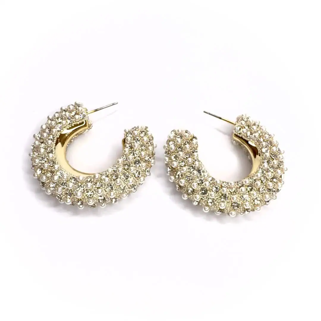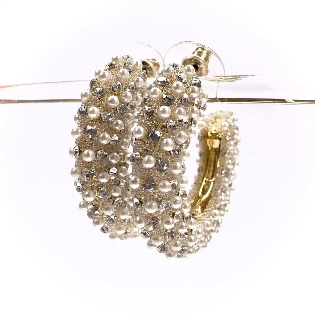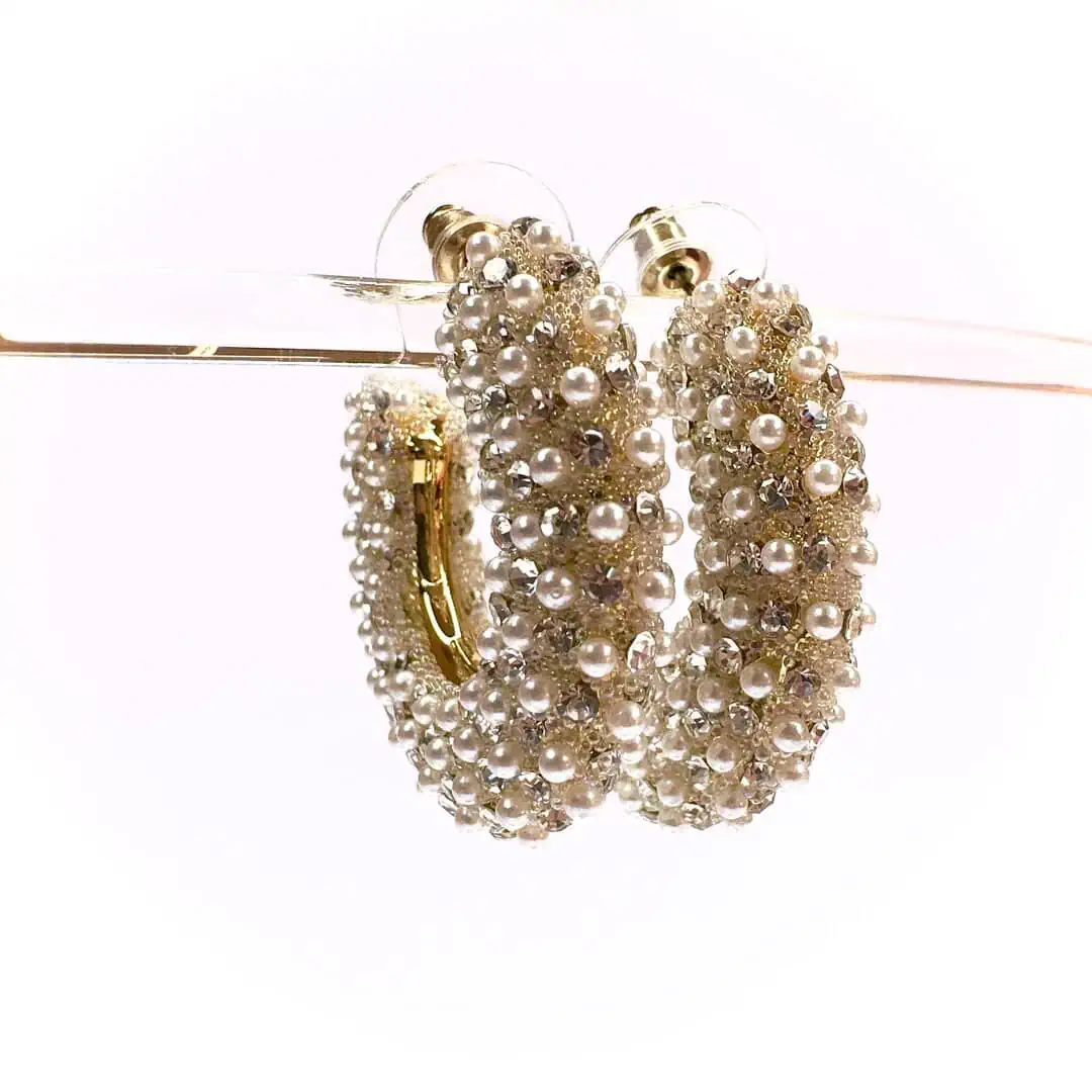 Orecchini cerchio perle della collezione Perlage, realizzate con perline e strass su cerchio tondo.