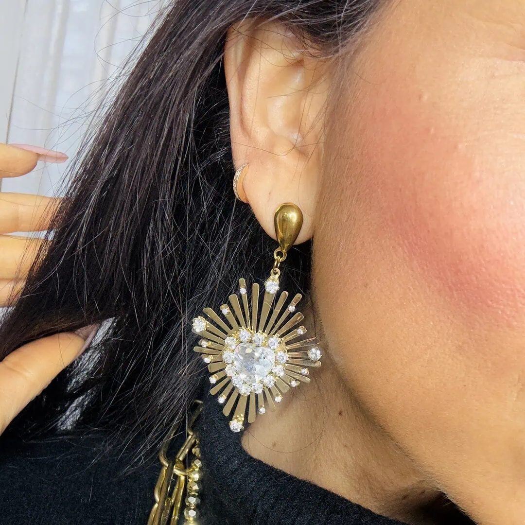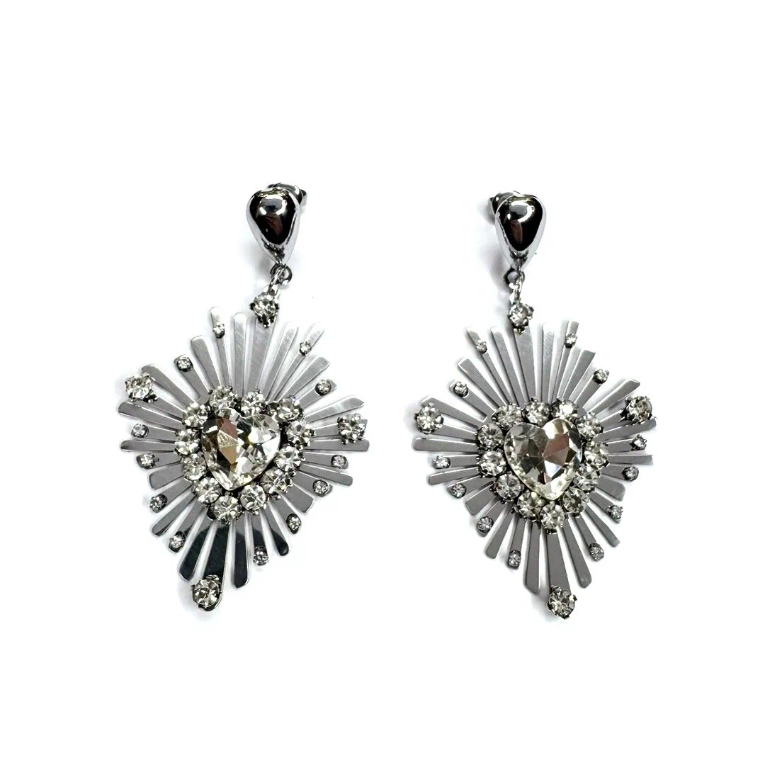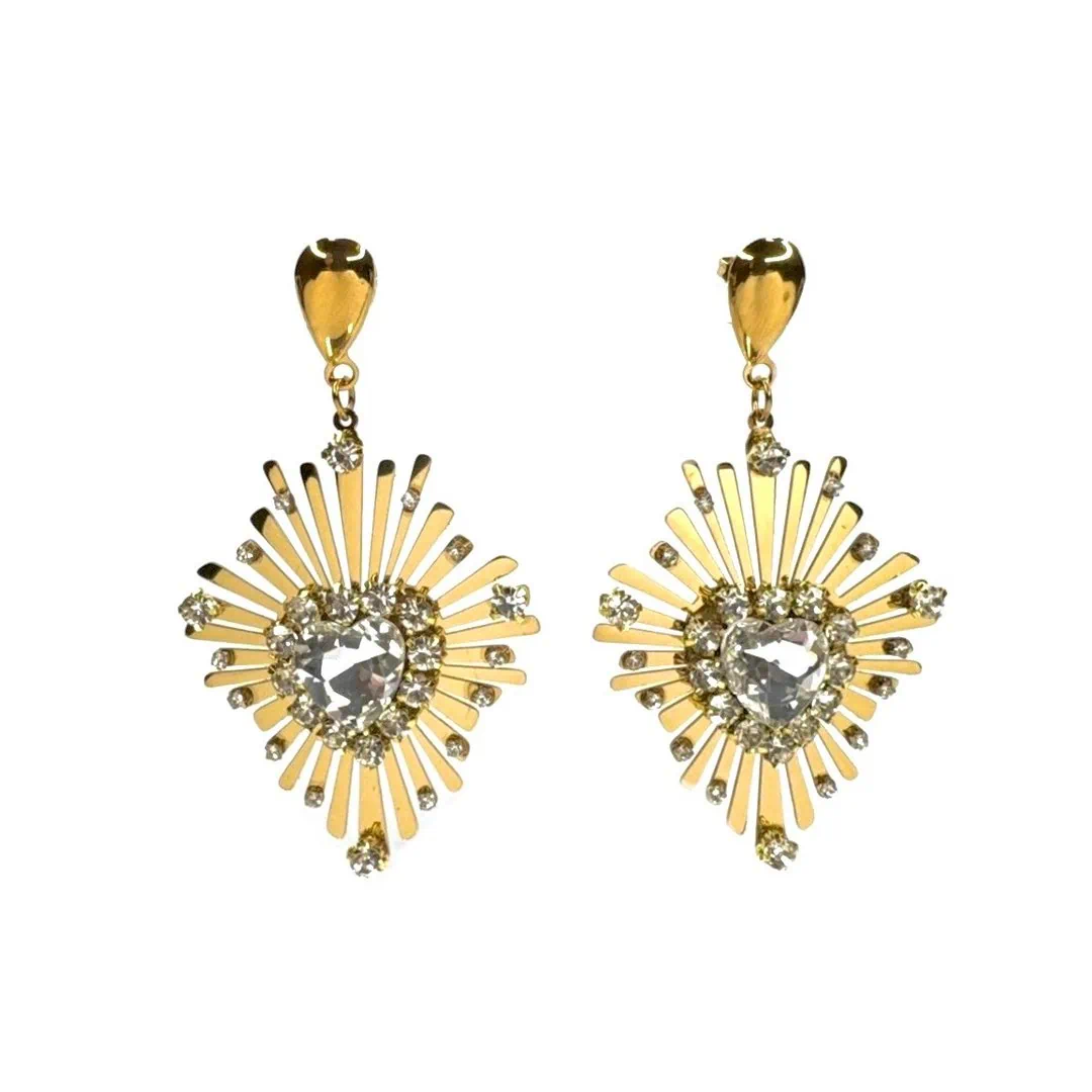 Orecchini cuore sacro realizzati su placca di acciaio tagliata a laser e pietra centrale a forma di cuore con strass sul perimetro disponibili in oro o argento .