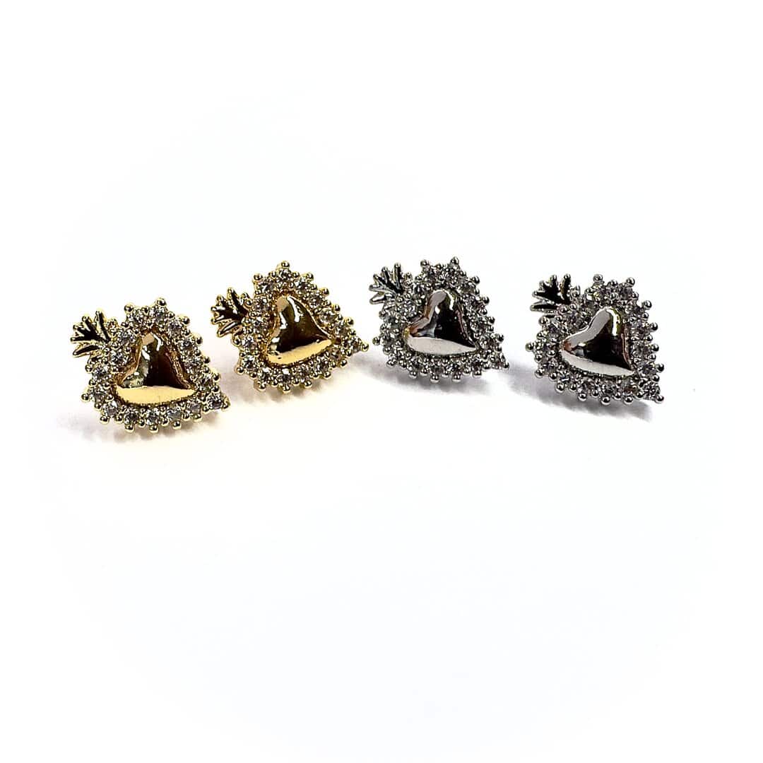 Orecchini cuore sacro realizzati in acciaio 3d a forma di cuore con strass sul perimetro disponibili in oro o argento .